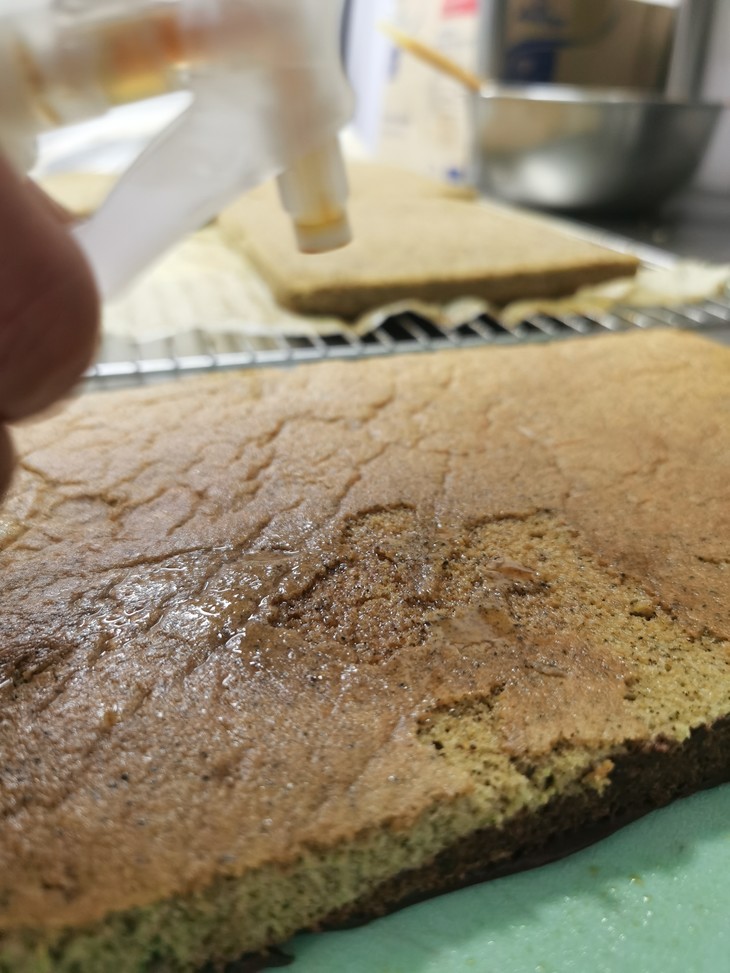 一开始只加入少量砂糖搅拌,待蛋白膨胀之后,再分数次加入剩余的砂糖,制作成蛋白霜。这种蛋白霜蓬松轻软。将它与其他材料混合后富有弹性,在烤盘上抹平时能清楚地看到气泡。烤制好的蛋糕体表面残留着无数的气泡,糖浆得以顺畅地浸入蛋糕体中。在最初阶段就一次加入全部用量的砂糖,会形成细致绵密具有流动性的蛋白霜。但这种蛋白霜打入的空气量较少。将它与其他材料混合后会更有光泽,也是因为内部缺少空气的缘故。使用这种蛋白霜烤制而成的蛋糕体,糖浆很难浸入,会浮于表面,也不易与烤纸分离。400mm*300mm的蛋糕体一张大约使用100g的糖浆