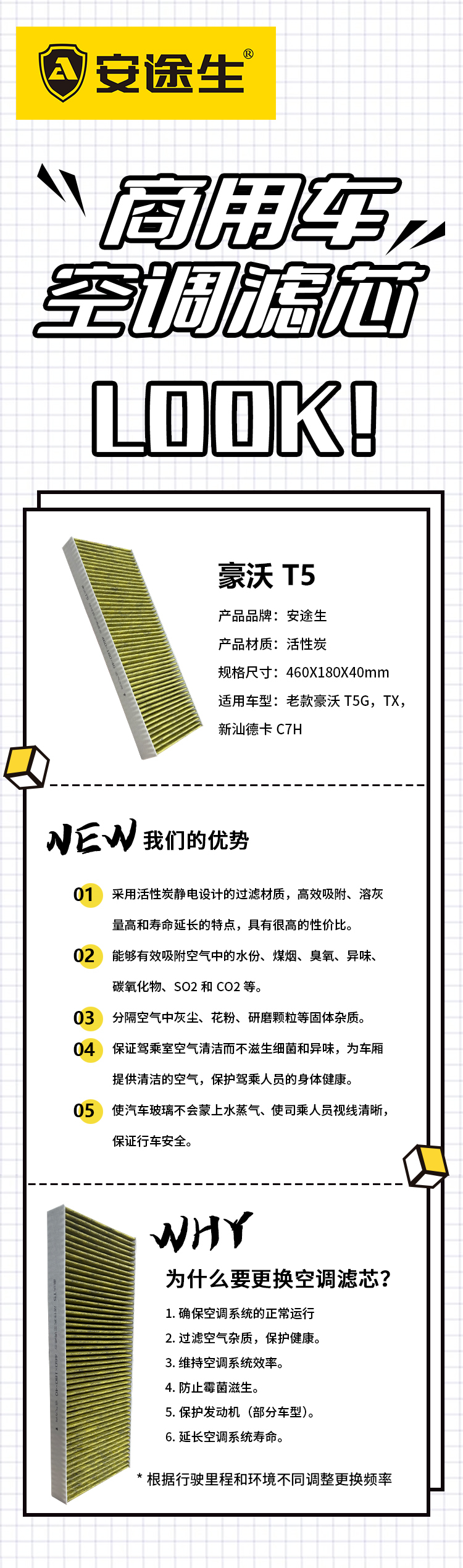 安途生重汽豪沃T5C7H活性炭空调滤芯长里程除异味防止霉菌商用车