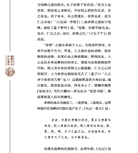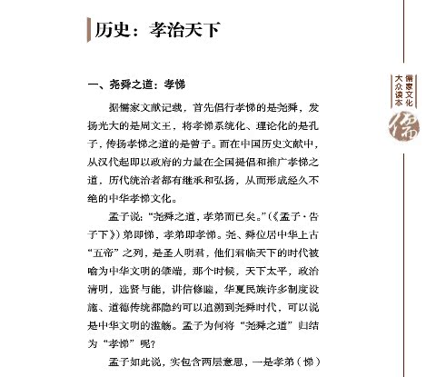 儒家孝悌文化主要从原理:孝悌为仁之本;历史:孝治天下;文化:百家言孝悌等几个方面,旨在用深入浅出的形式,让读者了解儒家孝悌文化的全貌。