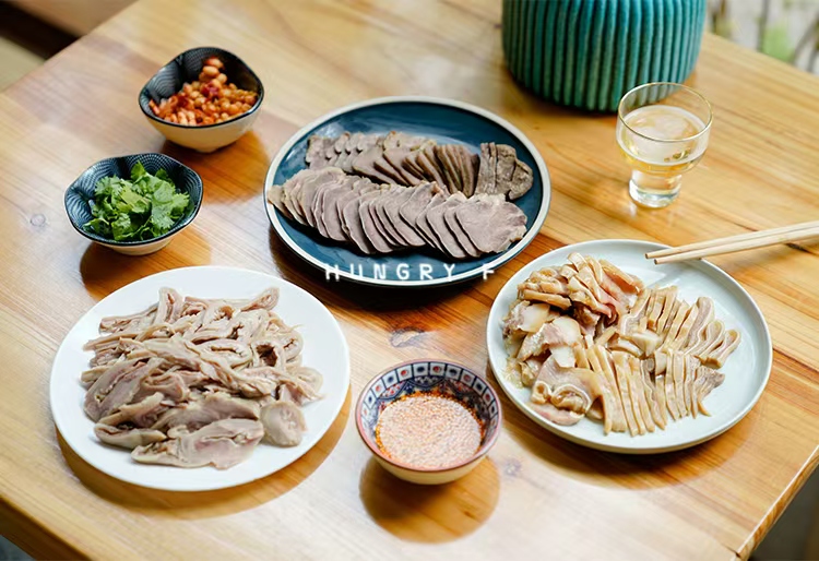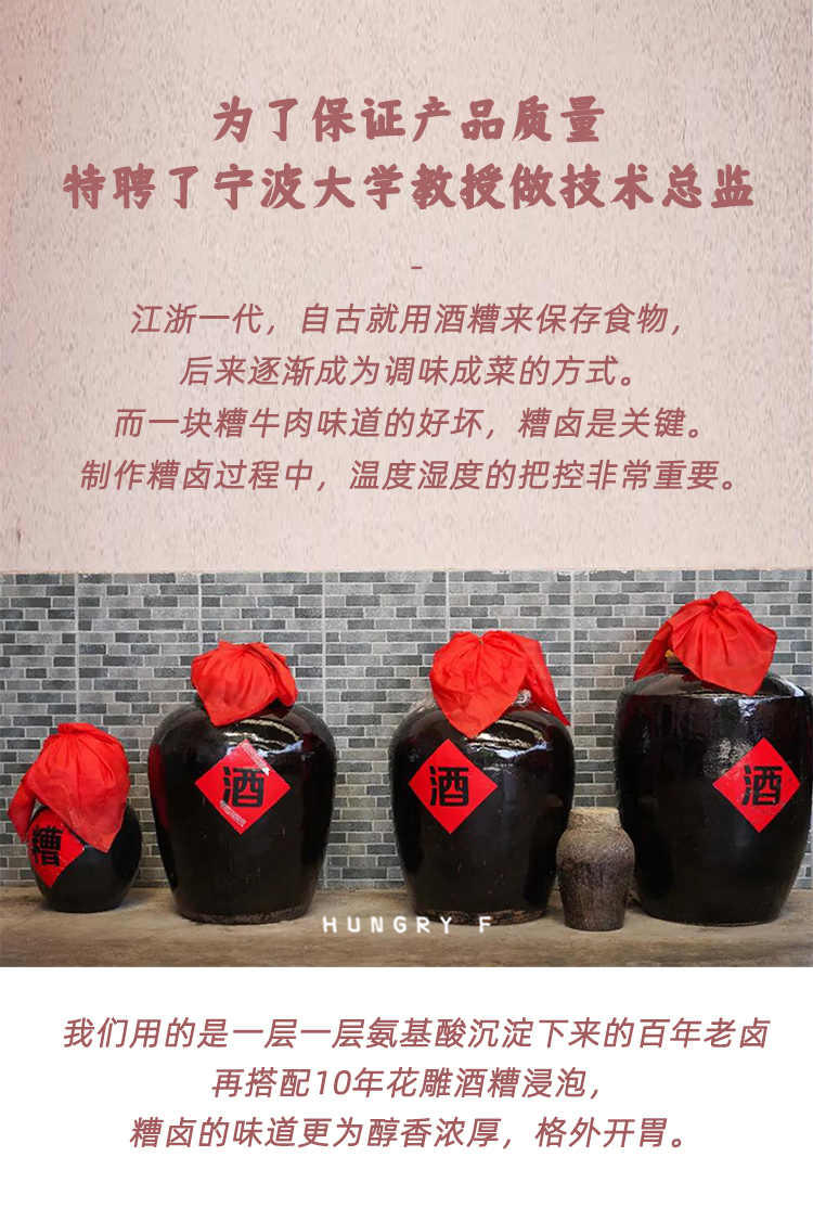 这次的糟肚、口条、耳片的原料都是金锣集团提供的,作为国内猪肉行业数一数二的龙头老大,在全国各地都有规模完善的屠宰基地,杀好后不会立马运走,会进行冷却排酸。猪肚,用的是一整个原肚,肉质厚实,脆嫩而不生,味道尤为鲜美;猪耳朵,只选取精华部位耳片,卖相好看,口感脆香;猪舌用的是前端肉,色泽和纹理清晰,肉质脆嫩。在原料优质的基础上,制作过程也只能用讲究二字来形容。相比现在很多做糟味的都买现成的糟卤汁来制作,这款用的是一层一层氨基酸沉淀下来的多年老卤!不同部位不同糟卤时间,确保每一款糟货的口味都是老底子的传承。