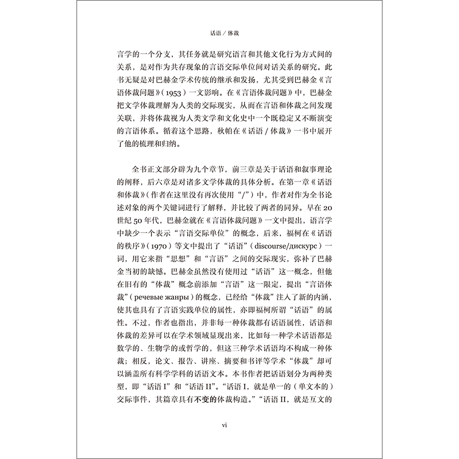 《话语/体裁》以中文译文加导读的形式出版。在这部叙事学研究的专著中,俄罗斯当代文学理论家瓦列里伊戈列维奇秋帕聚焦于两大重要概念话语和体裁,通过分析俄罗斯文学史及西方文学史上重要的作品文本来剖析两者之间的相互关系,论证话语在体裁生成过程中的建构作用。与此同时,作者对各类文学体裁的渊源进行了梳理,并提出了独到的见解。可以说,本书旨在拓展叙事学研究的疆域,将话语学和巴赫金的元语言学纳入文学体裁的研究之中。