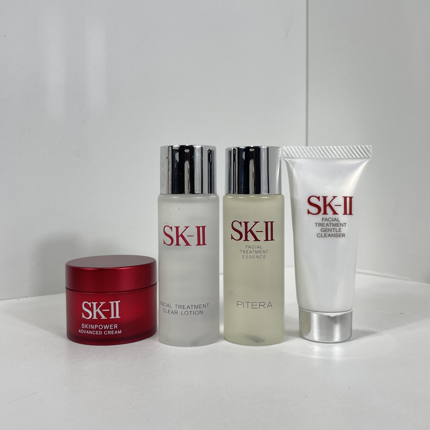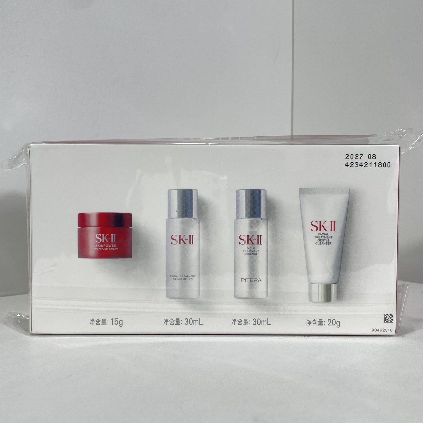 sk旅行中样4件套内含:洗面奶20g,清莹露30ml,神仙水30ml,磨砂瓶面霜15g。