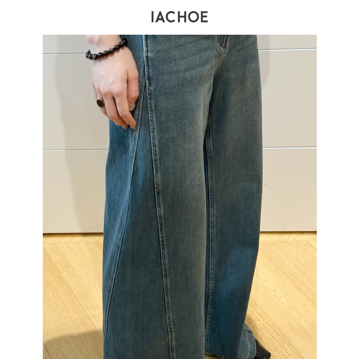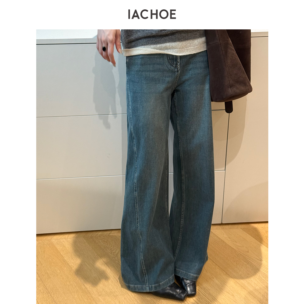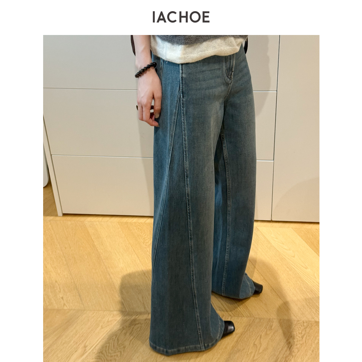 棉仓352619007-高腰阔腿全棉牛仔裤女立体褶裥剪裁 春秋复古单宁水洗拖地裤