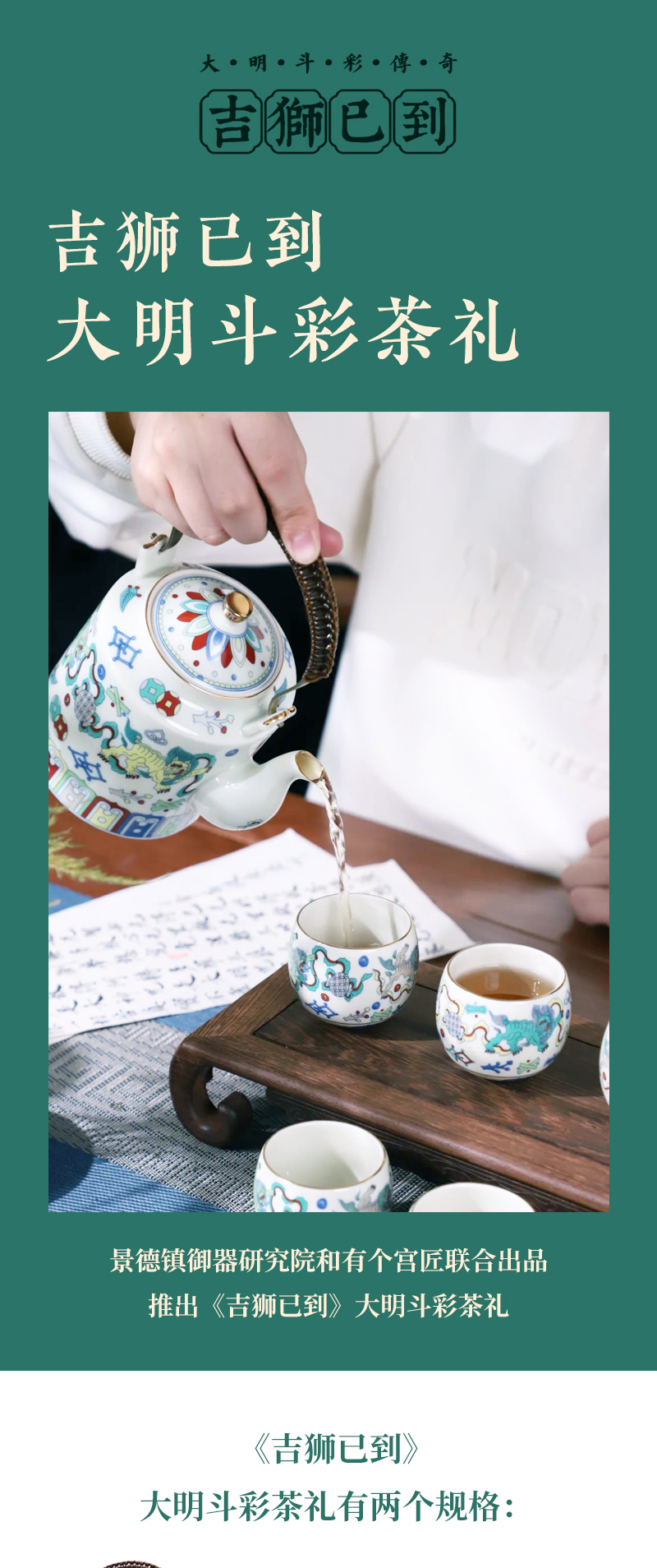 《吉狮已到》大明斗彩茶礼|三才盖碗、仿古提梁壶套组,景德镇御器研究院出品 故宫延趣楼古陶瓷修复专家阳士琦大师监制
