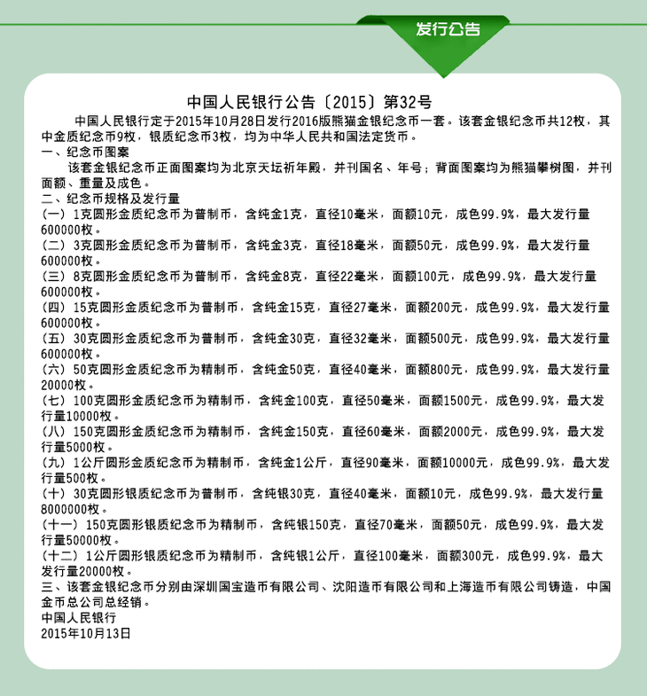 2016年熊猫金银币纪念币 3克金猫加30克银猫 套装
