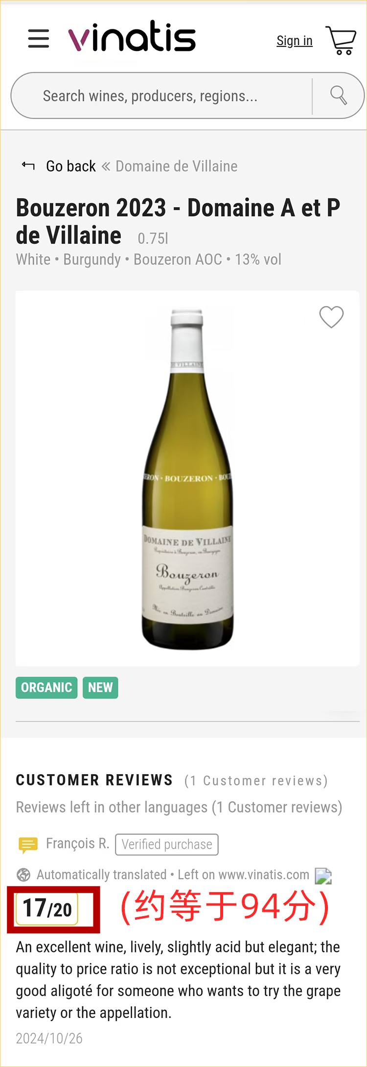 “世界酒王”罗曼尼康帝(简称DRC)名满天下,而Domaine A&P de Villaine 则有着“康帝主人后花园”的美誉,它是康帝庄主Aubert de Villaine创立的唯一私人酒庄,不折不扣的亲生子。与几万起步的康帝相比,尽管庄主Villaine老人家在亲生子身上花的心思比康帝还多,但A&P de Villaine 的同级酒不到康帝1/5,因此被酒友称为“平民版的康帝”,让我们能以平实的价格间接感受下罗曼尼康帝的酿酒精神。不过,价格虽然合理,但要拿到A&P de Villaine的直供配额却非易事,就算关系够铁,稍高级的酒,配额都仅是个位数,真就是有价无市。好久之前,酒哥就想为大家推荐这个酒庄,但无奈真是没配额,每次拿到的十几瓶,还没入库就被闻风而来的朋友抢了。而这次终于是攒够一点点配额了,实属不易。话不多说直接上酒!Domaine de Villaine Bouzeron Aligote 2023葡萄园:勃艮第夏隆内丘(Cote Chalonnaise)-布哲宏(Bouzeron)“一款优秀的勃艮第白葡萄酒,果香活泼,略带酸味,优雅美味。尽管在勃艮第难谈有特别出色的性价比,但对于想尝试这品种或产地的葡萄酒爱好者来说,这是一款非常好的阿尔高特葡萄酒。”