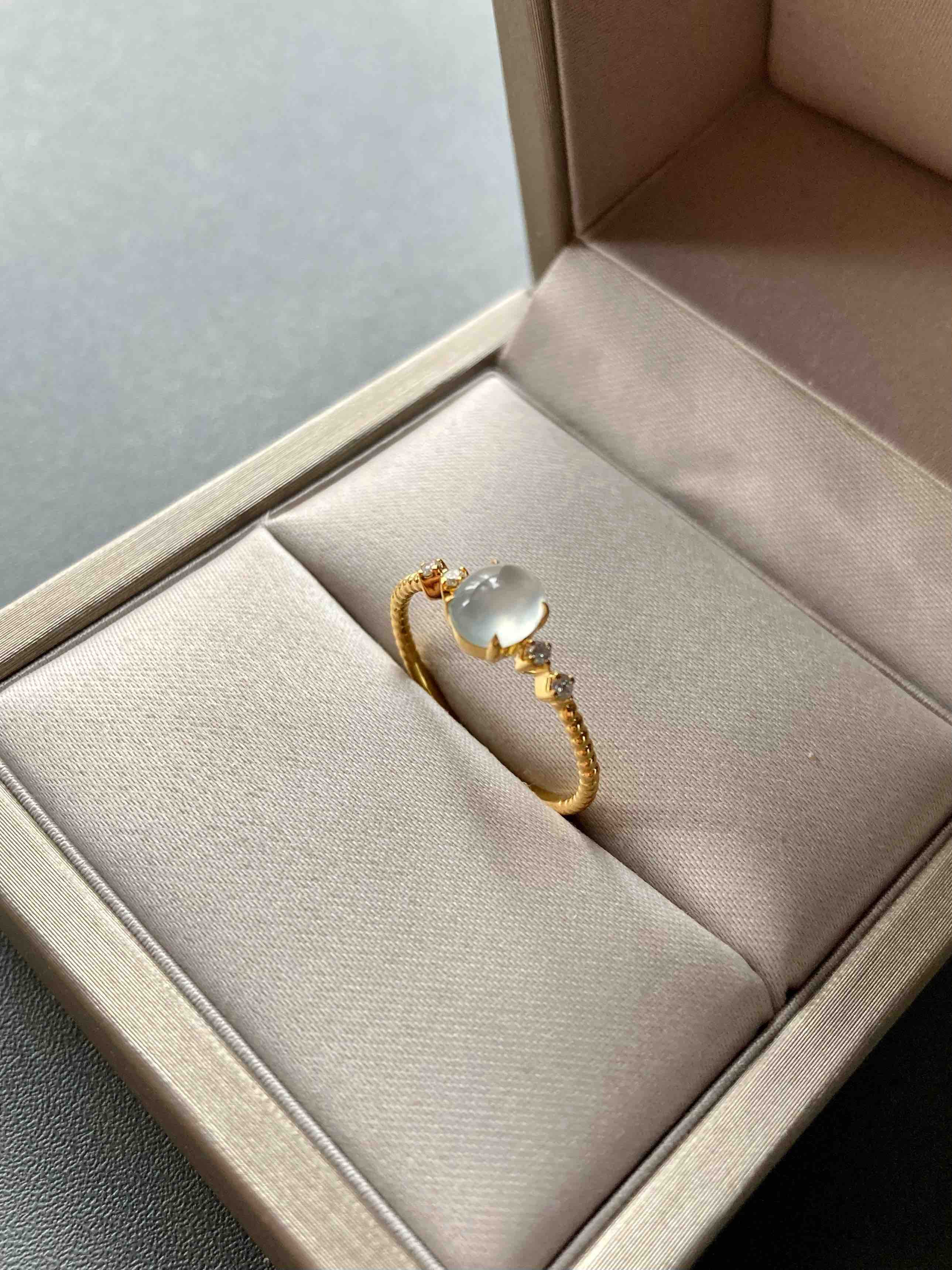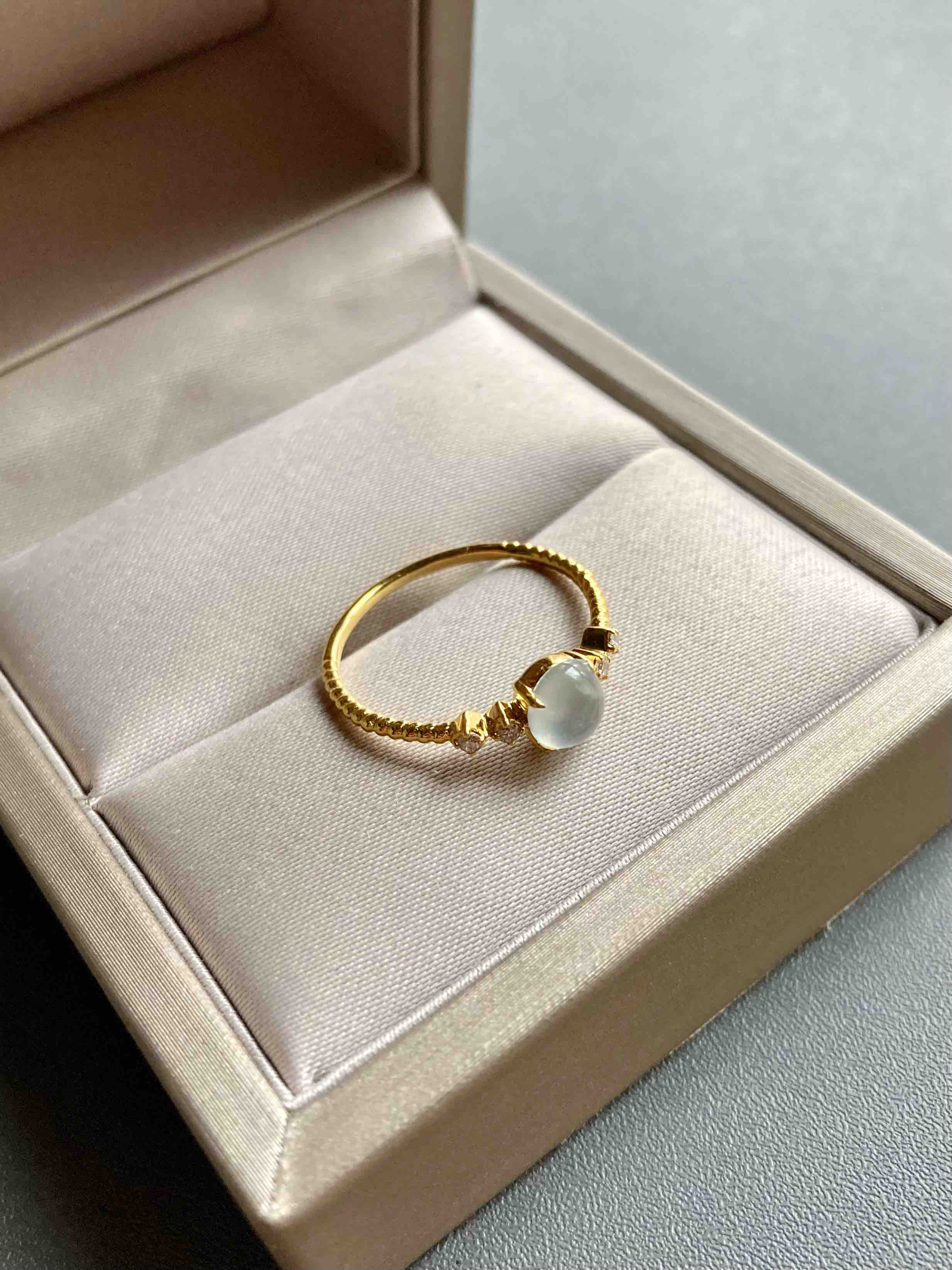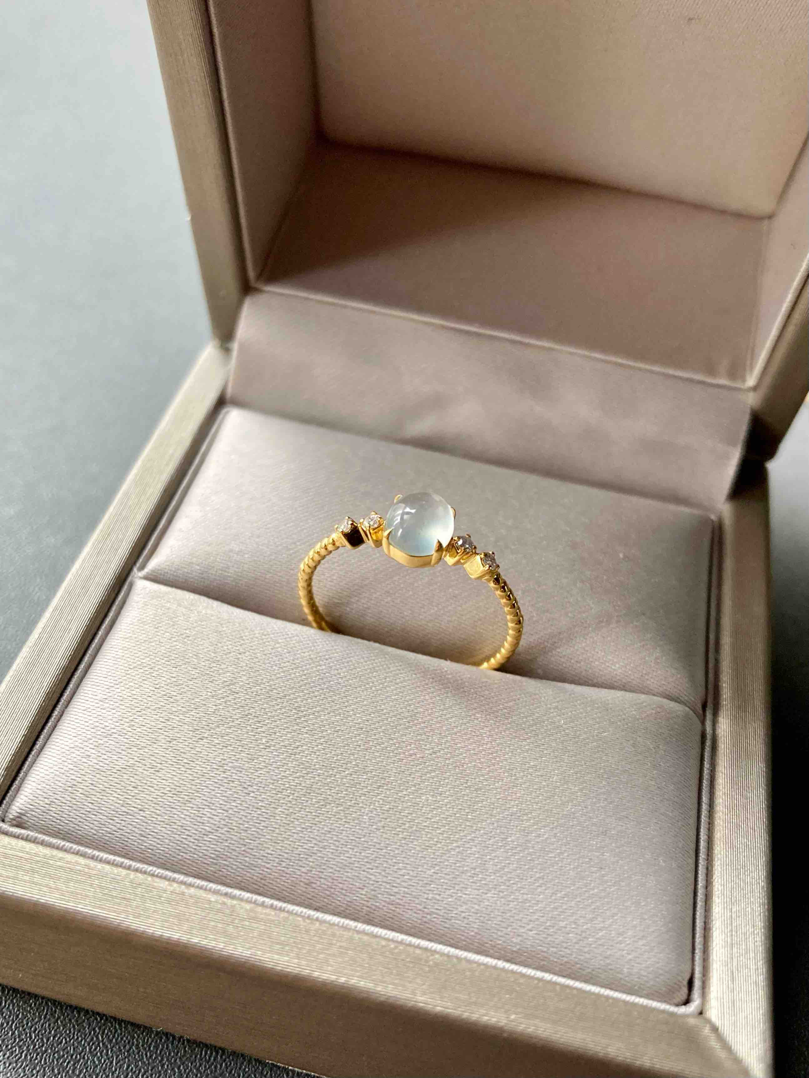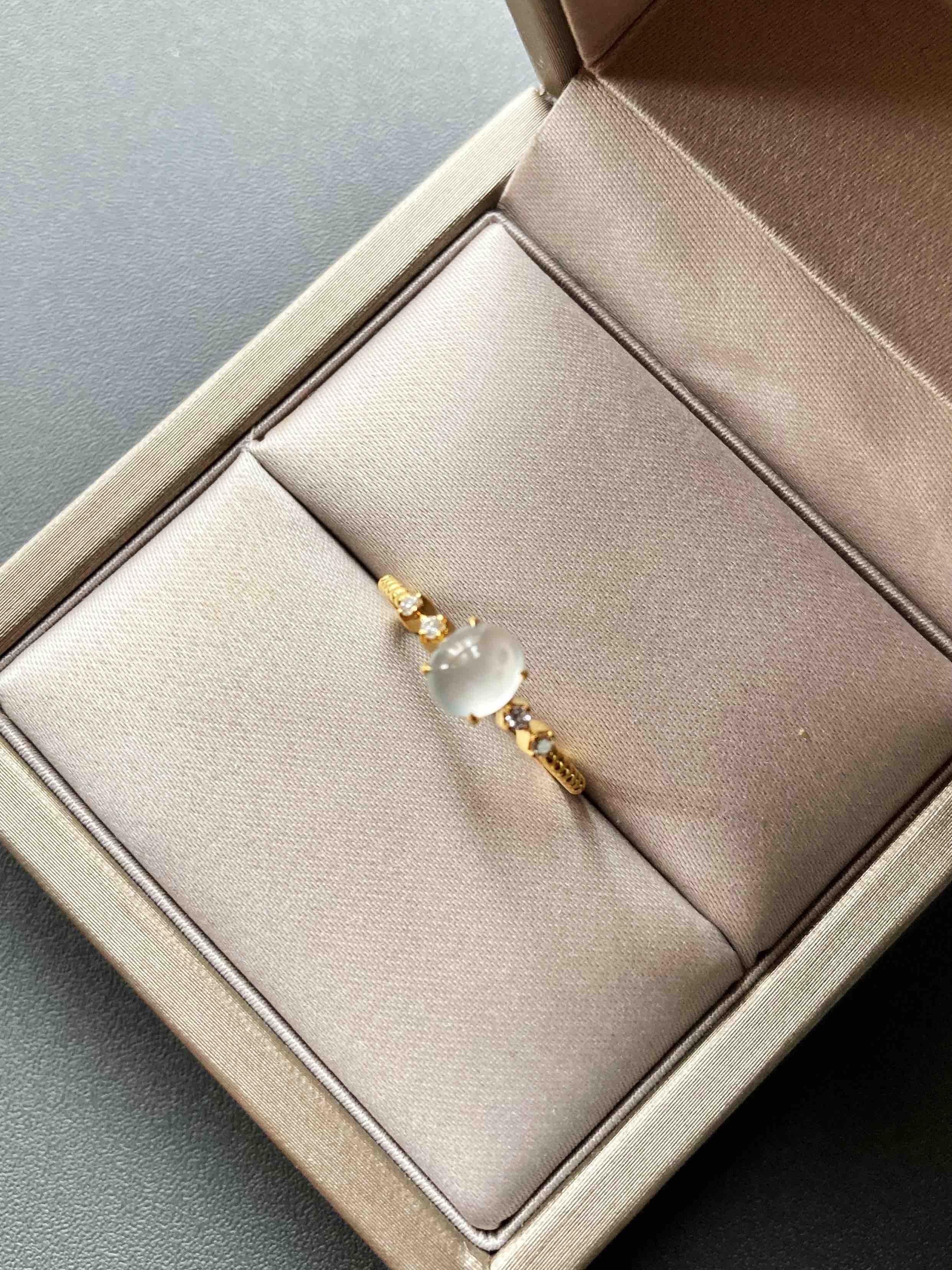 玻璃种翡翠蛋面玩到这品质也就到顶了,荧光四射,强刚性表现,种老雪花棉,梦幻无比,打造一个简约时尚的18k黄金钻石镶嵌戒指,日常佩戴百搭款,只要小四价位即可,别人花这么多钱还在戴着品质普通的戒指,你已经玻璃种毕业,强烈推荐,蛋面5.9×5.1×2.9mm,圈号13可改大小