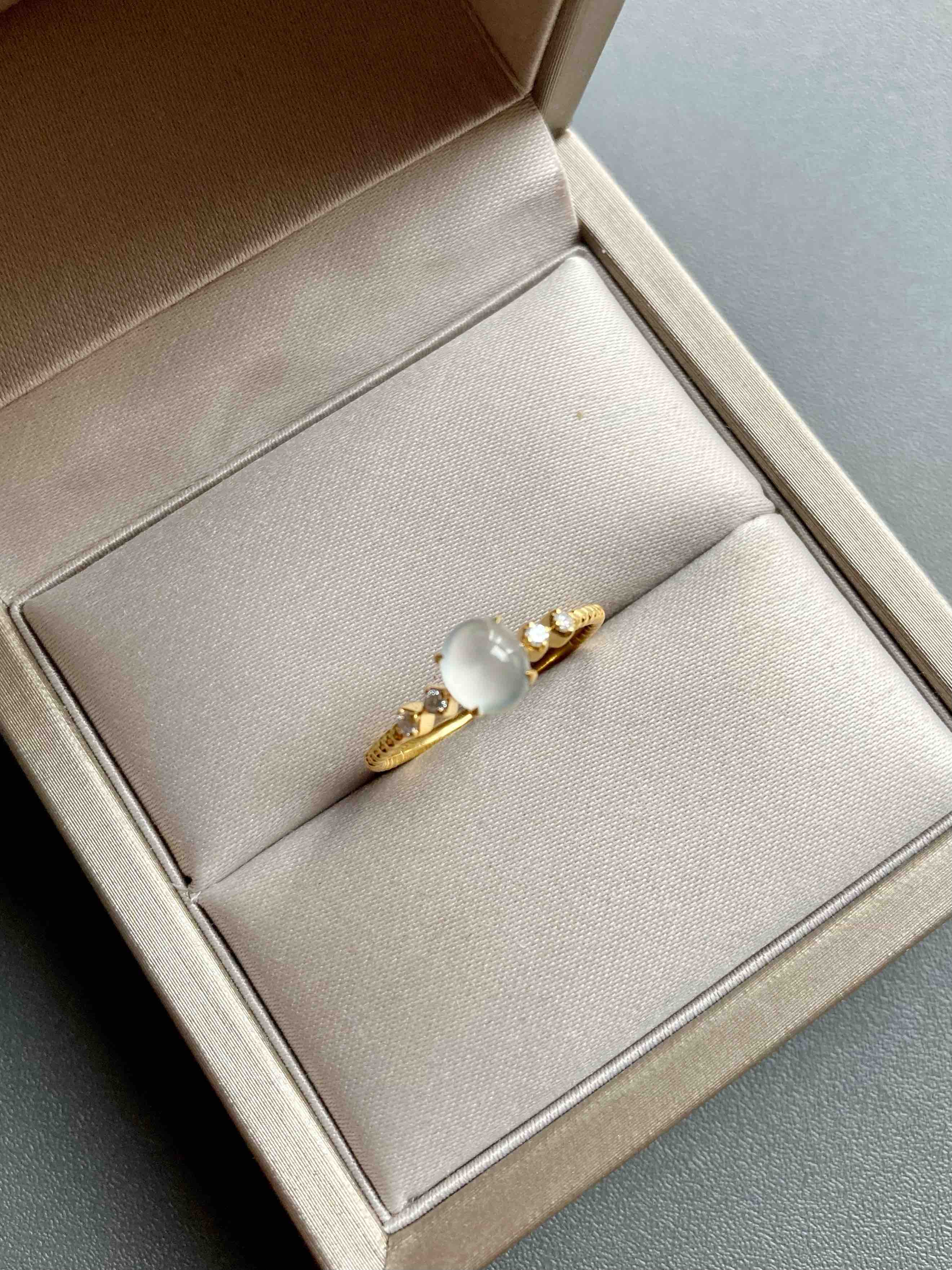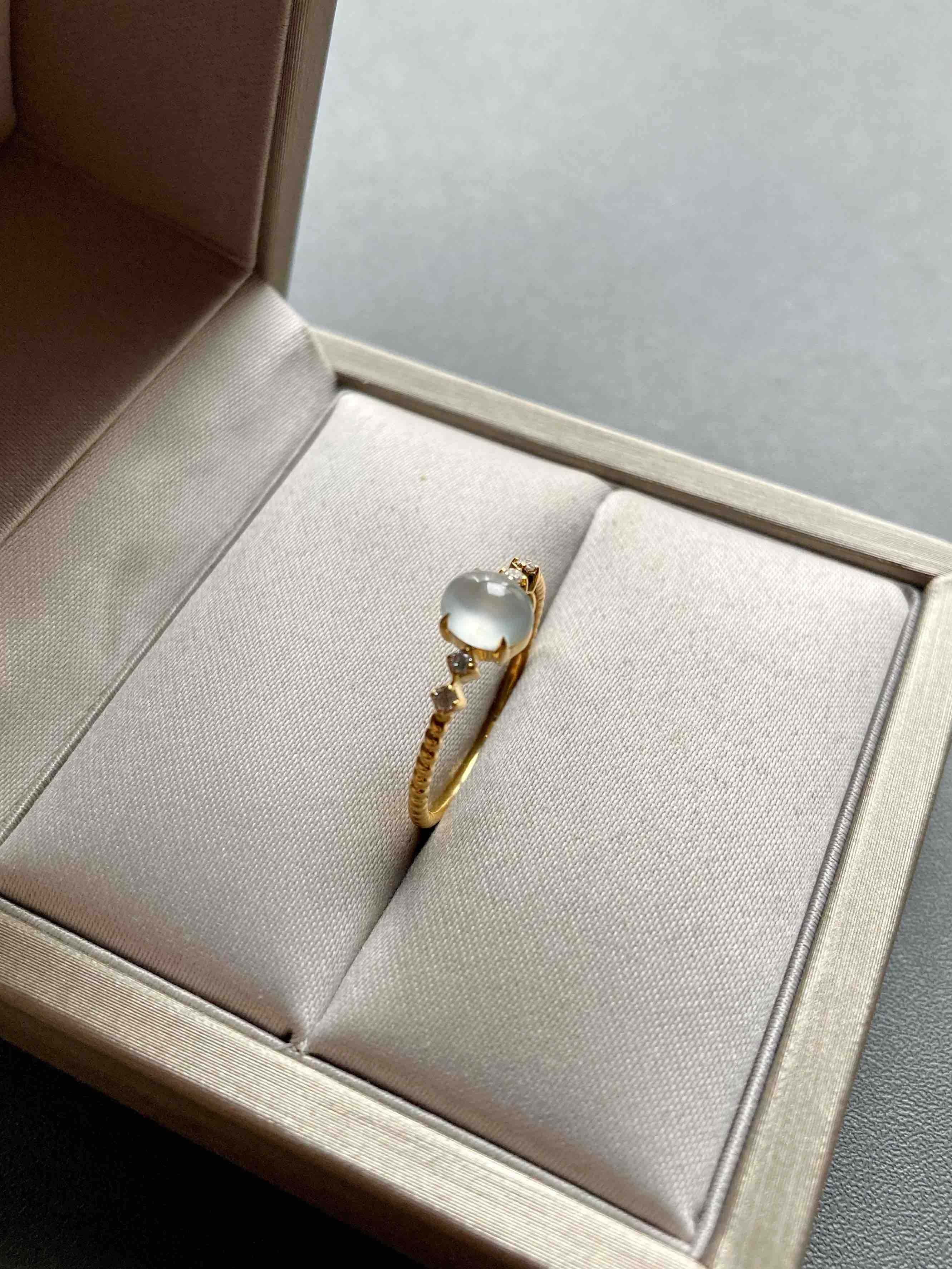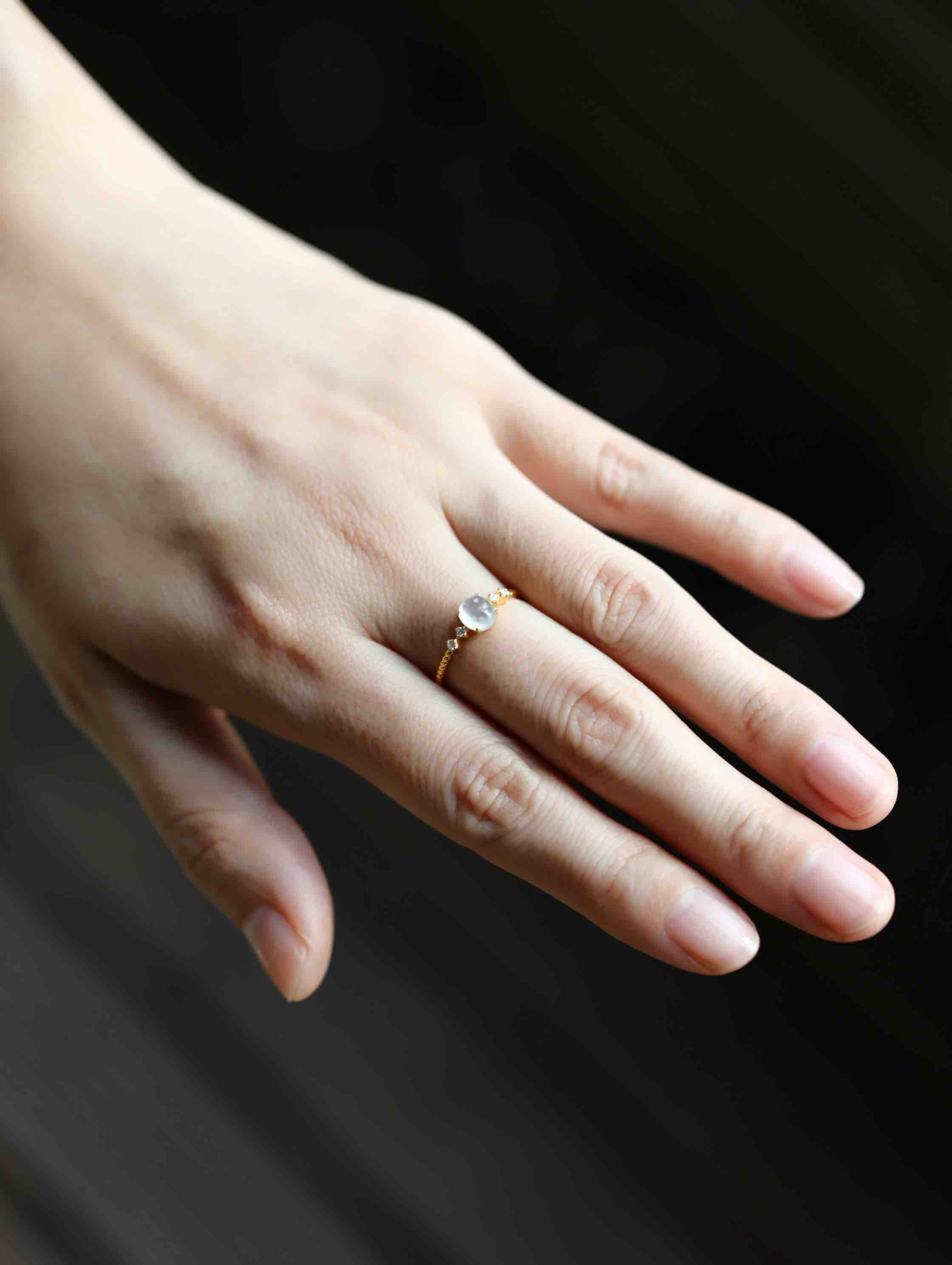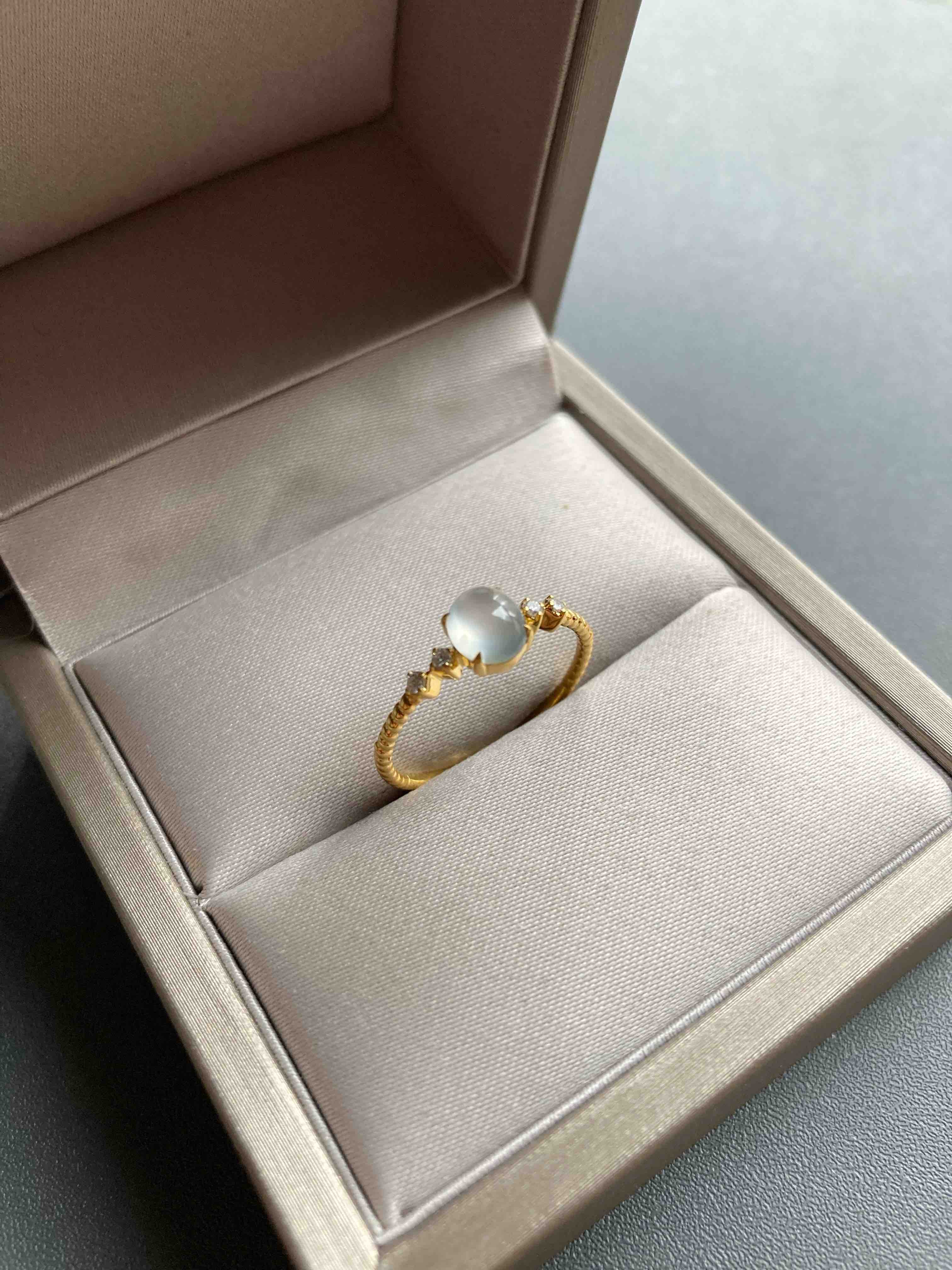 玻璃种翡翠蛋面玩到这品质也就到顶了,荧光四射,强刚性表现,种老雪花棉,梦幻无比,打造一个简约时尚的18k黄金钻石镶嵌戒指,日常佩戴百搭款,只要小四价位即可,别人花这么多钱还在戴着品质普通的戒指,你已经玻璃种毕业,强烈推荐,蛋面5.9×5.1×2.9mm,圈号13可改大小