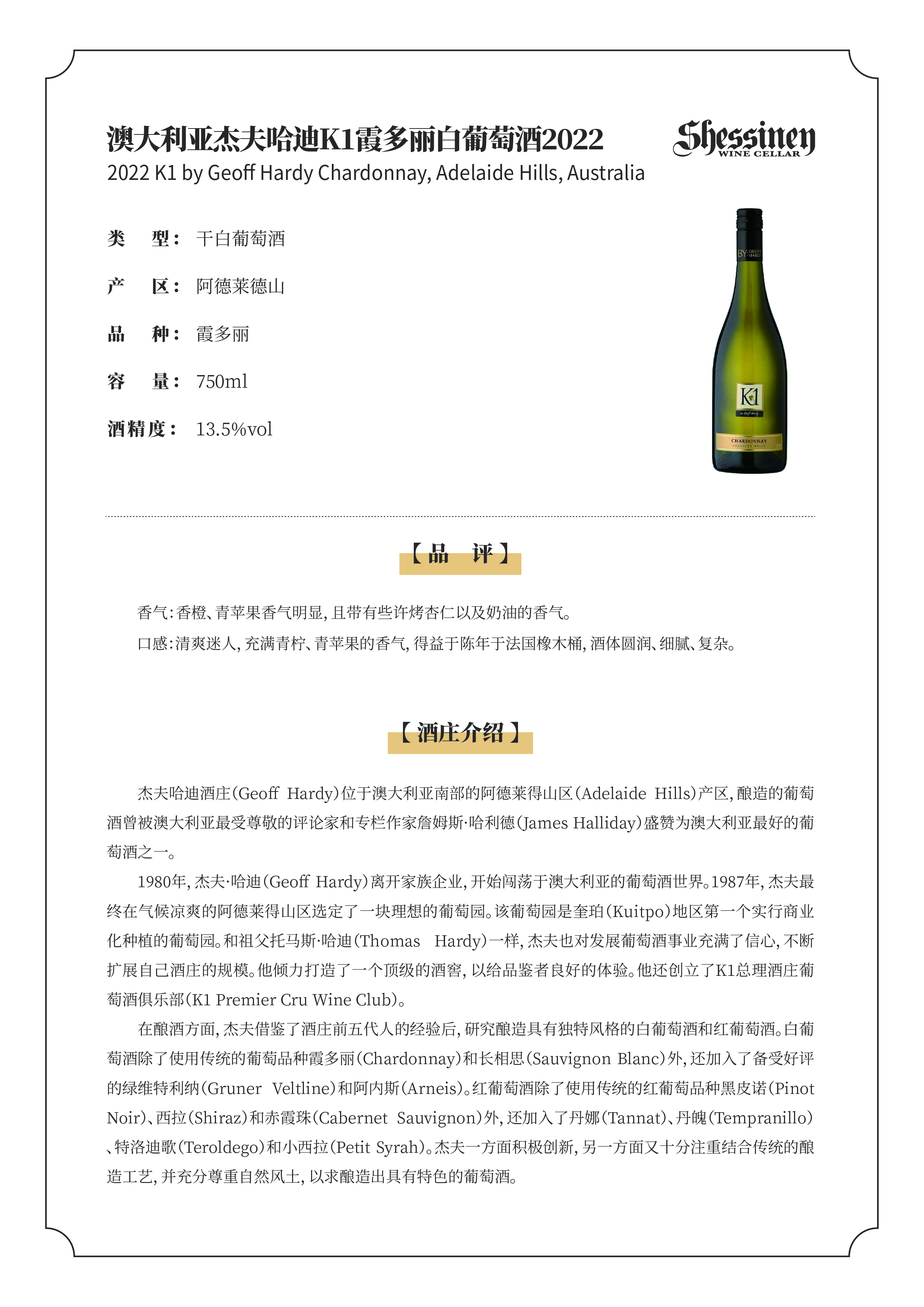澳大利亚杰夫哈迪酒庄K1霞多丽干白葡萄酒
