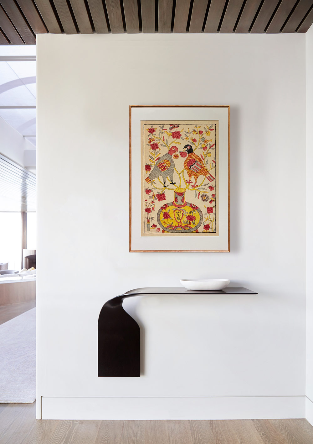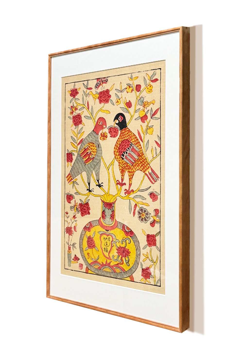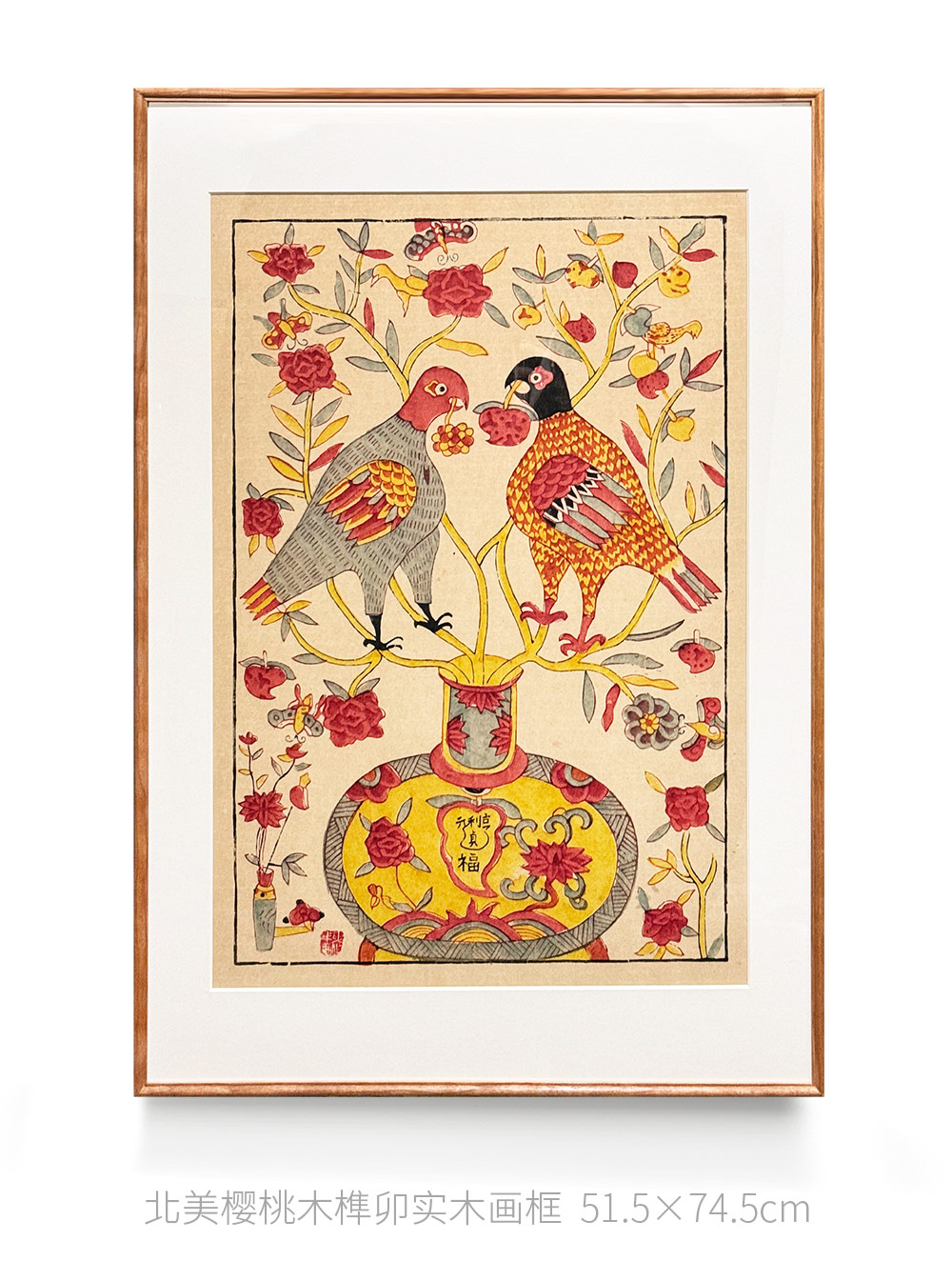 典故:作品采用天然植物颜料6次套印而成,是一幅花鸟年画,图中花瓶肚上寿桃图案中印有“元亨利贞”与“福”。“元亨利贞”语出《周易·乾·文言》“乾 元亨利贞”(元者,善之长也;亨者,嘉之会也;利者,义之和也;贞者,事之干也。君子体仁足以长人,嘉会足以合礼,利物足以和义,贞固足以干事) ,意谓乾为纯阳之卦,能以阳刚之气始生万物,并使之亨通畅达,和谐顺利,居正不偏。画中石榴寓意多子,寿桃寓意长寿,蝴蝶寓意生活美好富裕,此图配色喜庆热烈,为寓意大吉大利、平安富贵吉庆年画!
