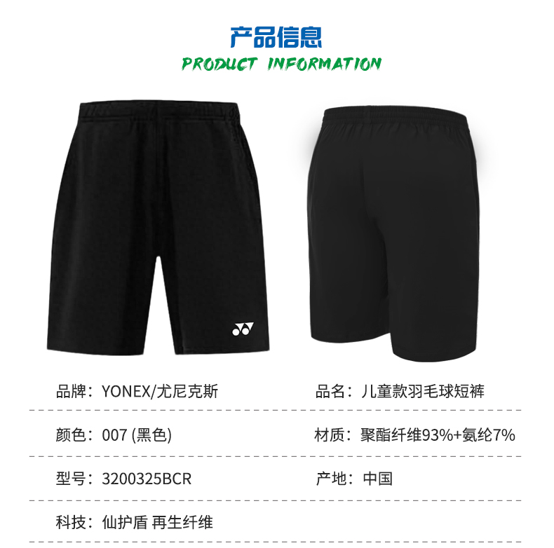 YONEX尤尼克斯儿童羽毛球服3200325BCR短裤透气速干童装青少年款