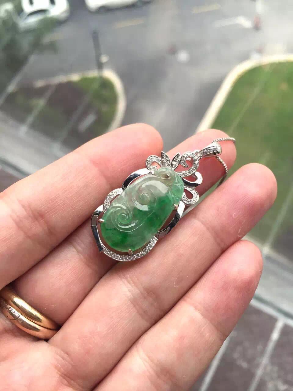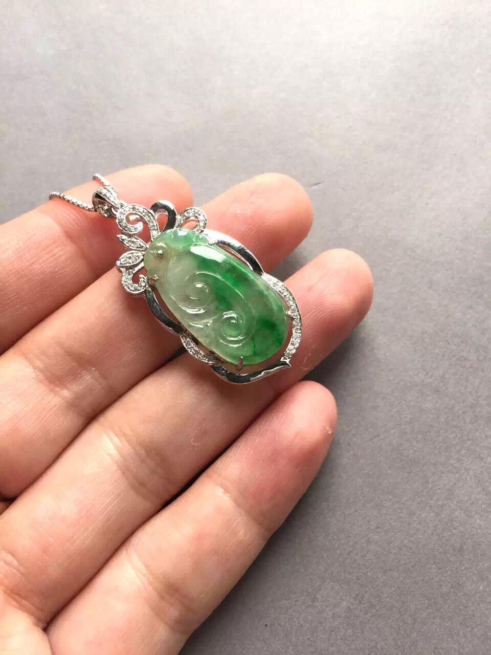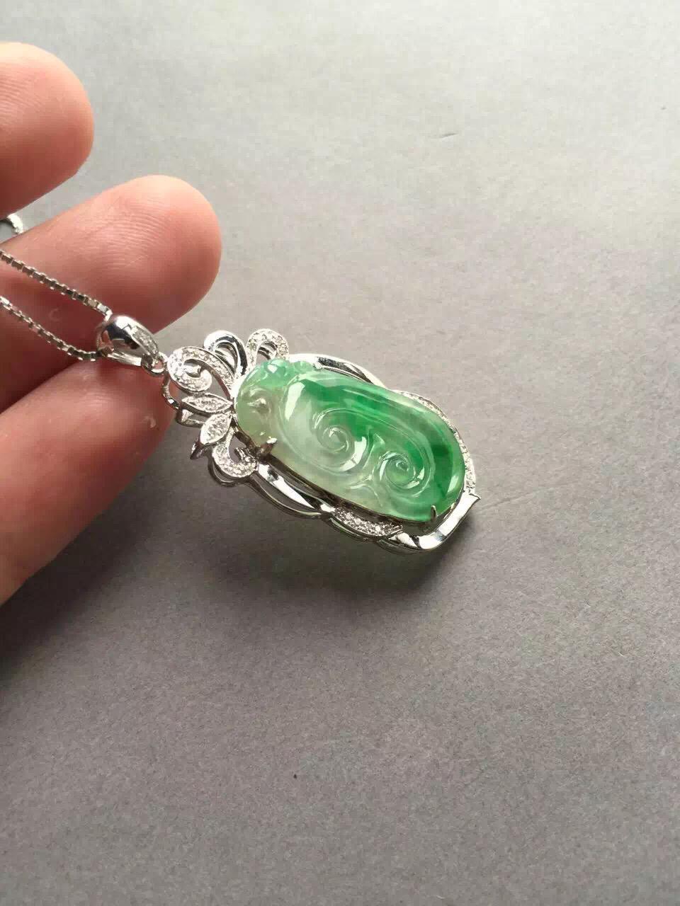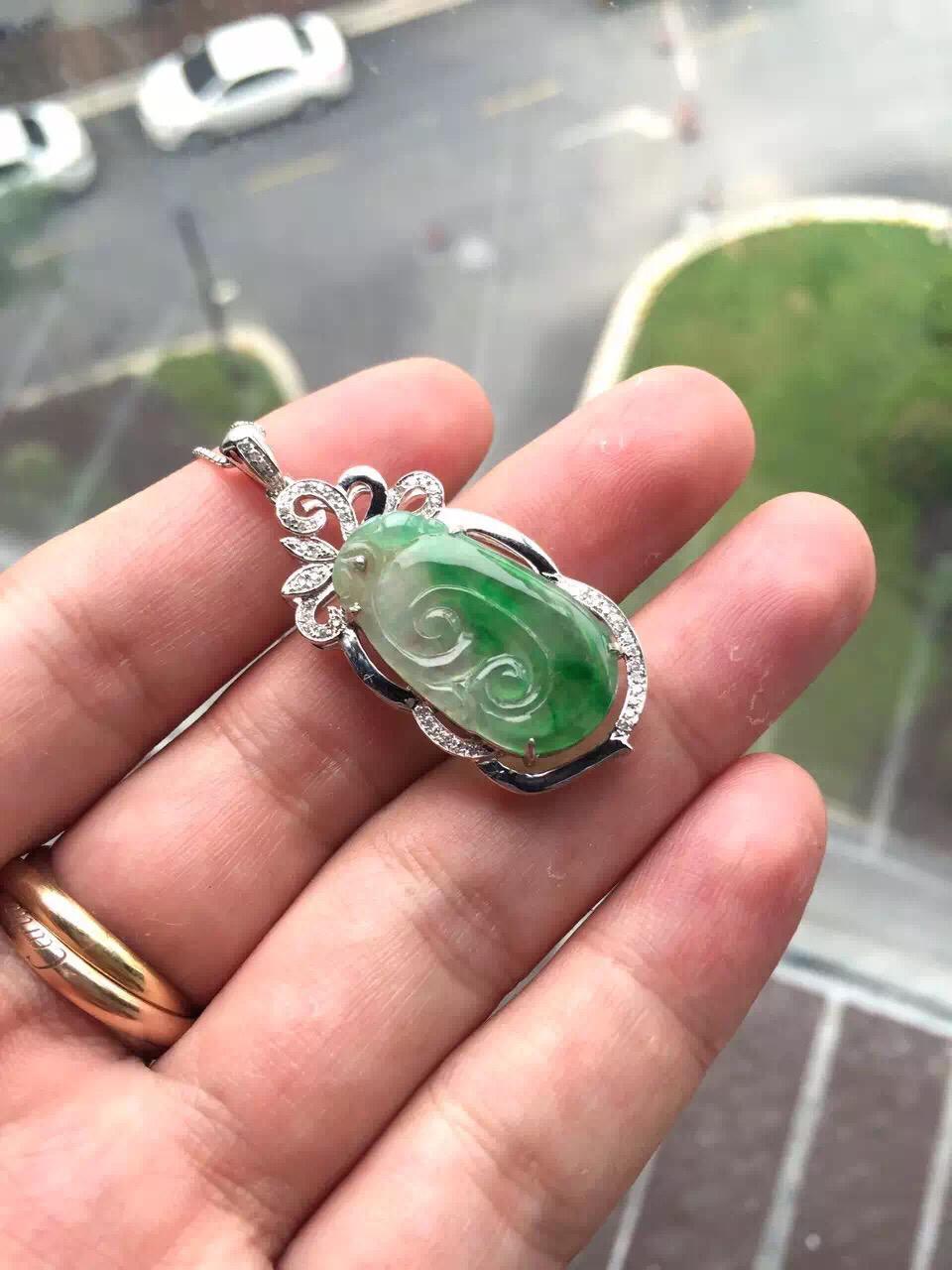 翡翠高冰到玻璃种阳绿如意,24.4*12.9*1.7mm,镶嵌后41.4*17.3*6.2mm,小而强大的宝贝,18k白金钻石豪华镶嵌,璀璨夺目,单单镶嵌成本就2000块了,如意种水好,荧光四射,正气阳,艳丽无比,抓人眼球,种色俱佳的小精品,上哪能找到高冰种,正阳绿,金钻镶嵌还这么便宜的翡翠如意