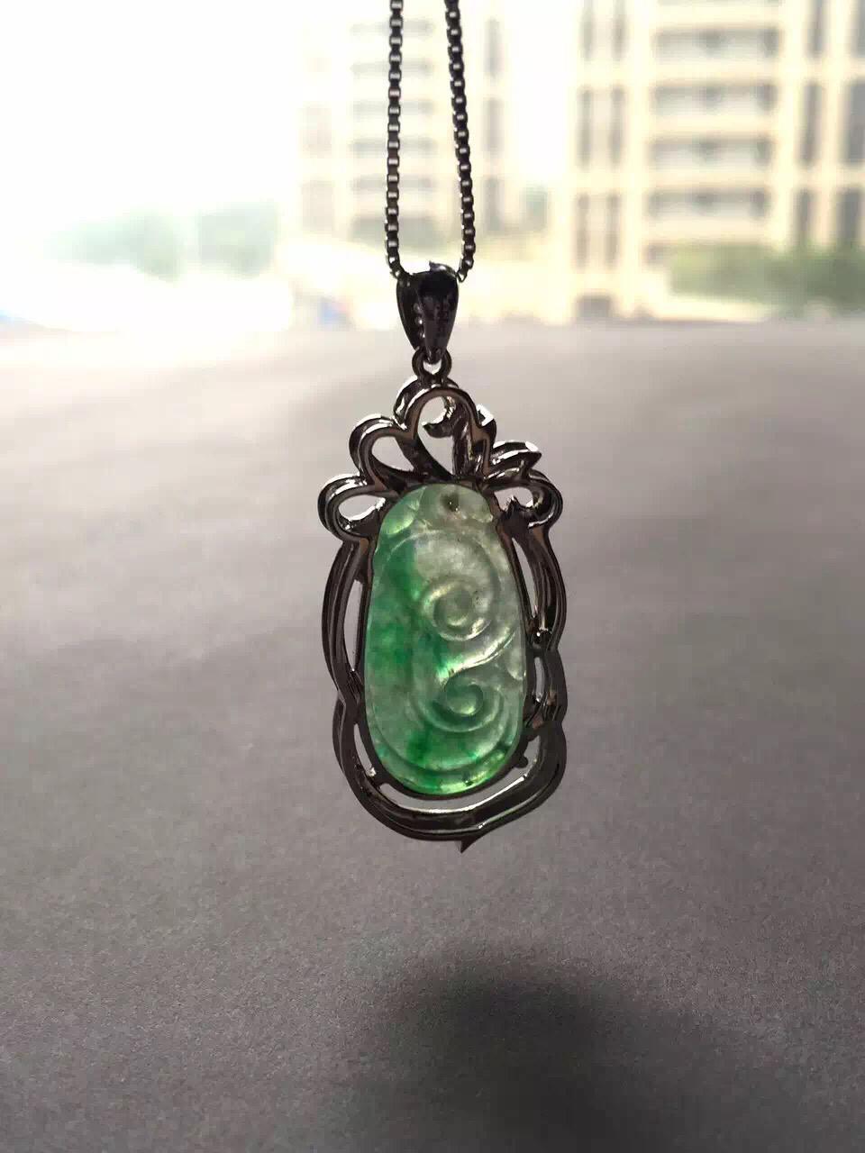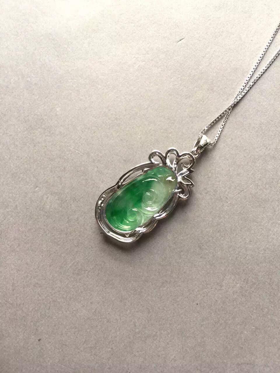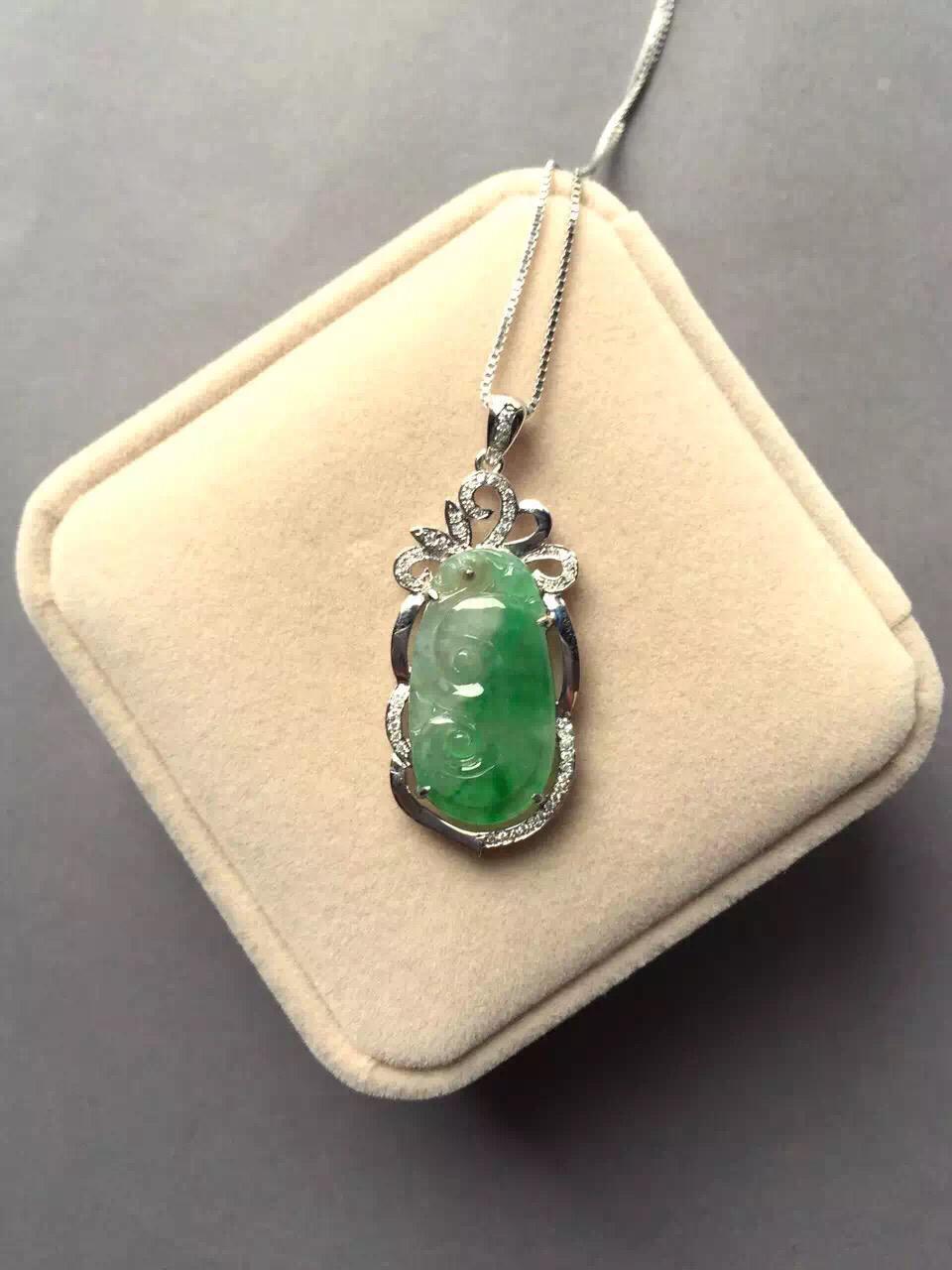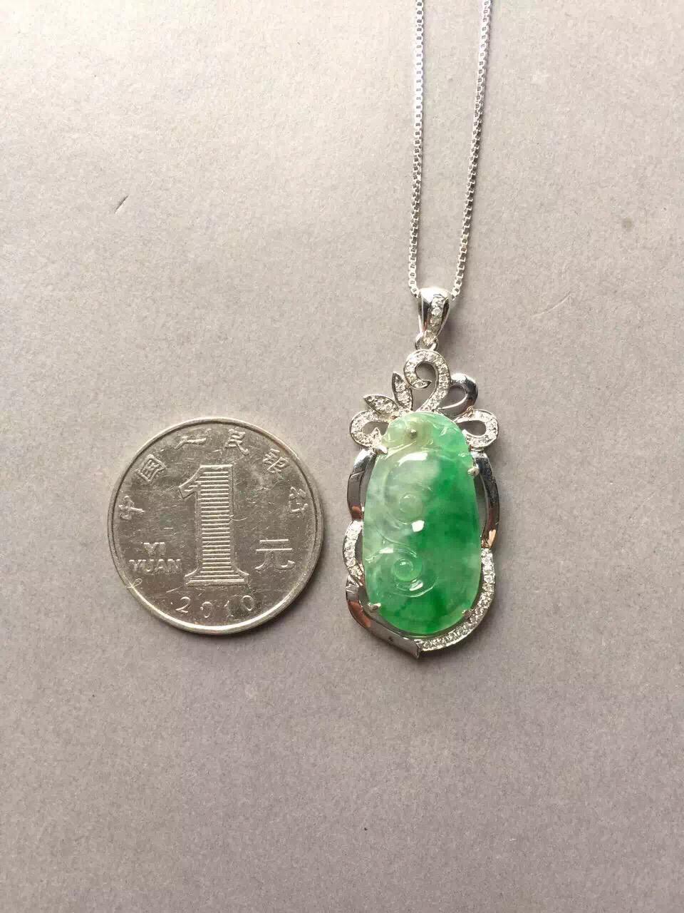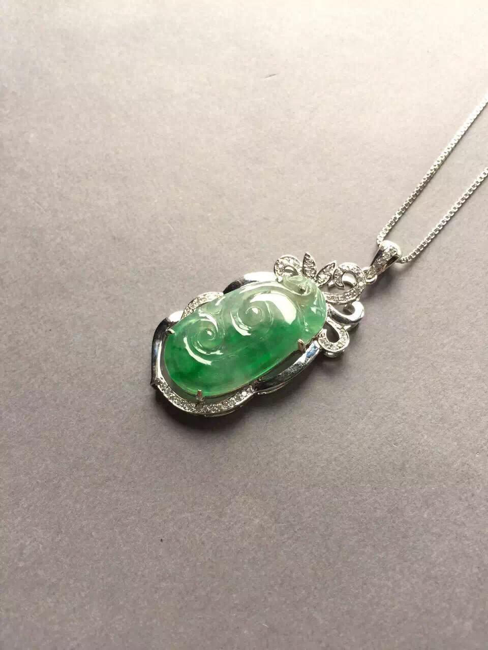 翡翠高冰到玻璃种阳绿如意,24.4*12.9*1.7mm,镶嵌后41.4*17.3*6.2mm,小而强大的宝贝,18k白金钻石豪华镶嵌,璀璨夺目,单单镶嵌成本就2000块了,如意种水好,荧光四射,正气阳,艳丽无比,抓人眼球,种色俱佳的小精品,上哪能找到高冰种,正阳绿,金钻镶嵌还这么便宜的翡翠如意