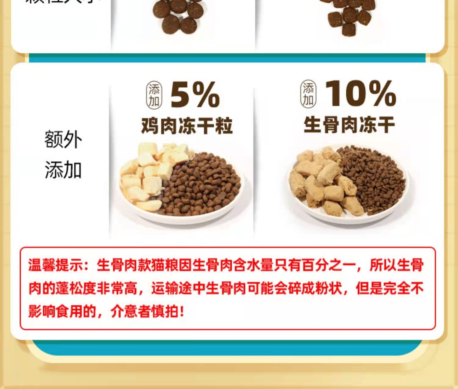 温馨提示:生骨肉款猫粮因生骨肉含水只有百分之一,所以生骨肉的蓬松度非常高,运输途中生骨肉可能会碎成粉末,但是不完全影响食用,介意勿拍!