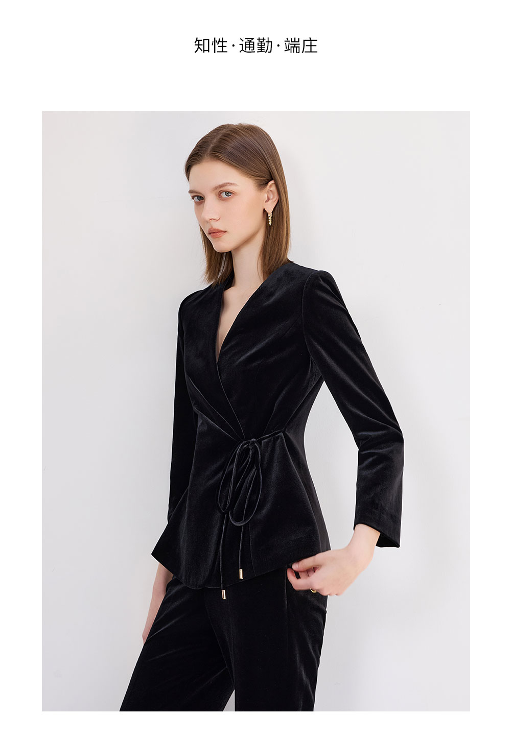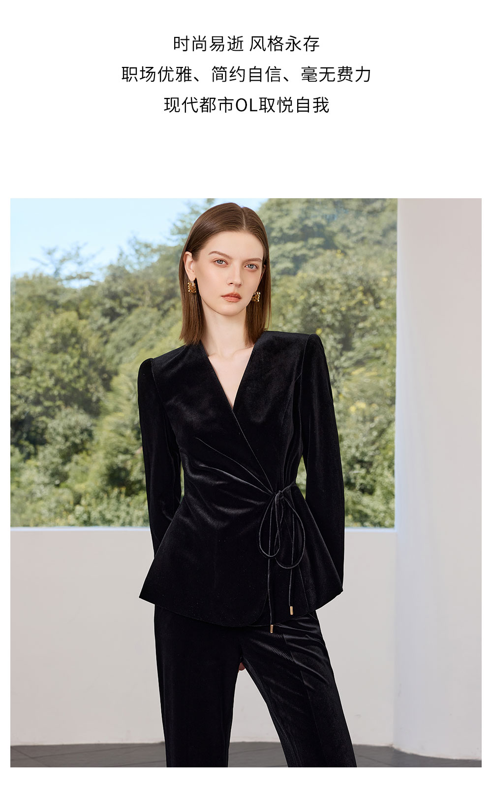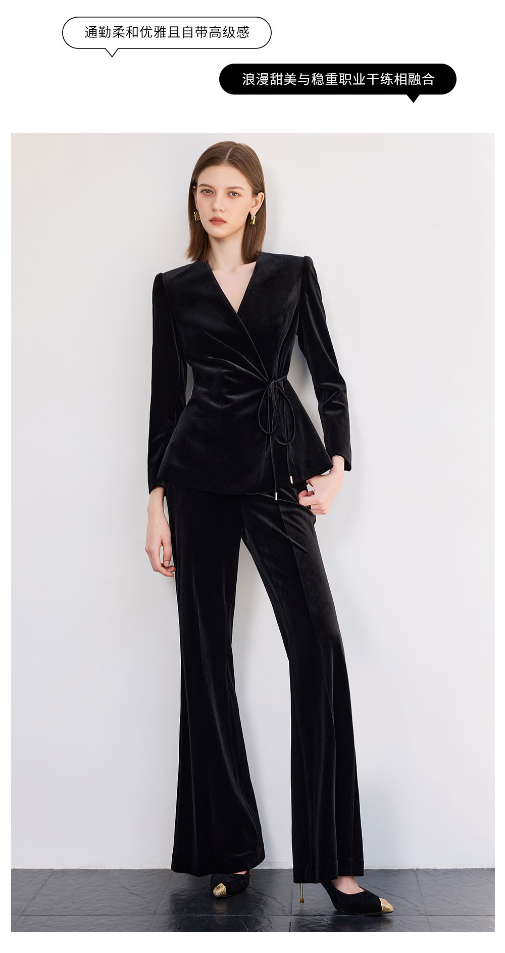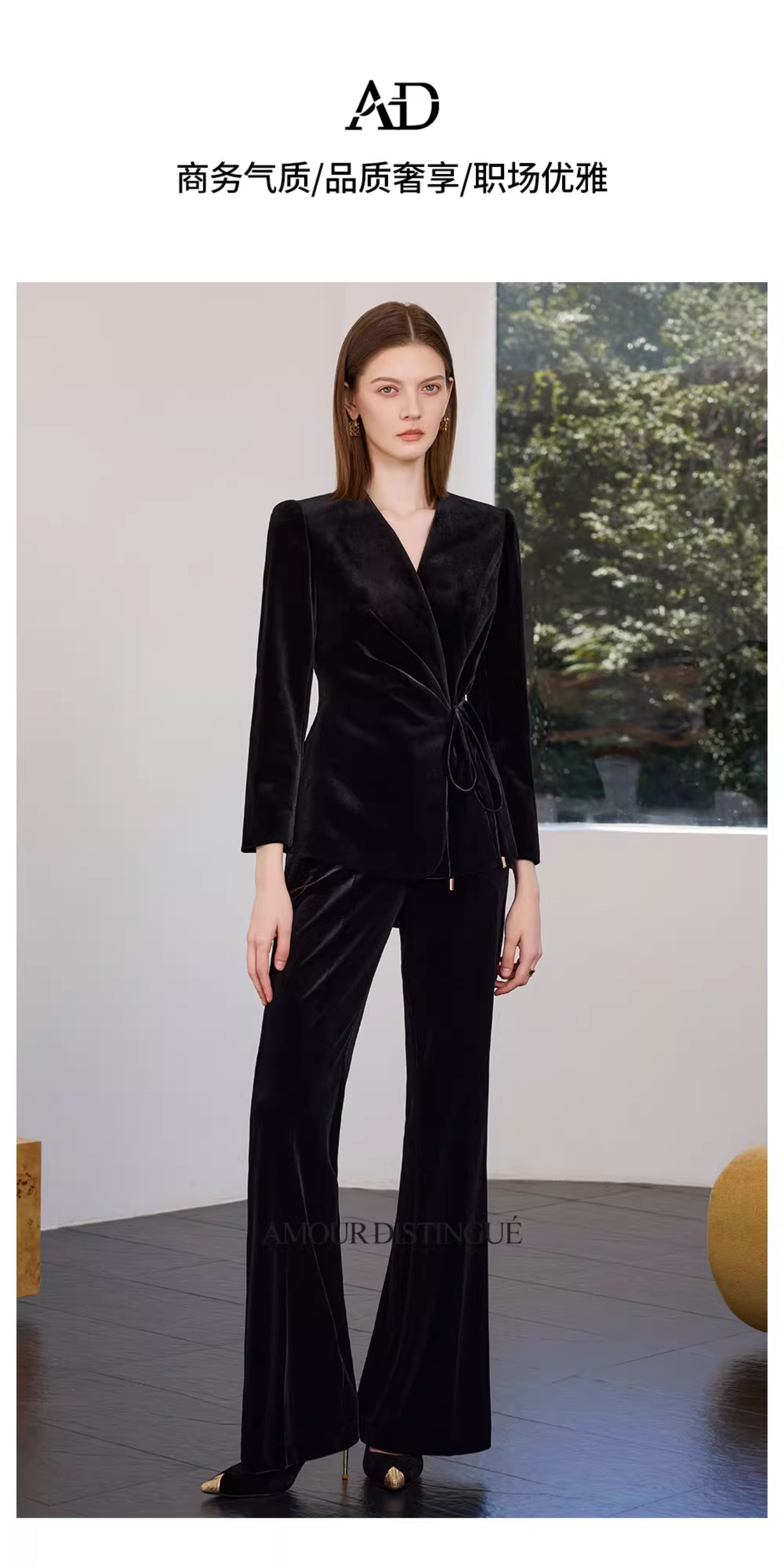 AD黑色丝绒西装套装女2025新款秋季轻奢优雅职业装收腰系带西服