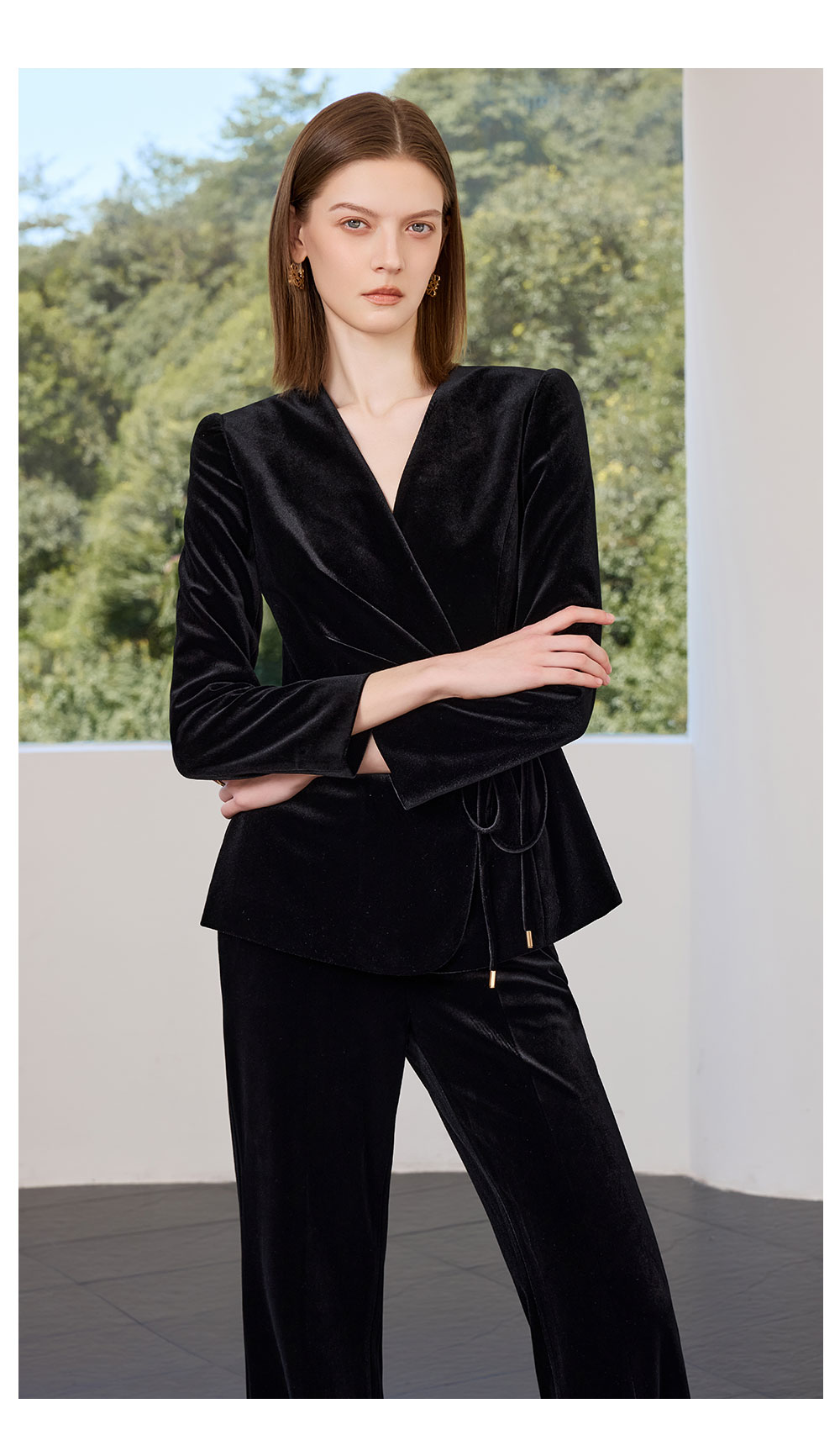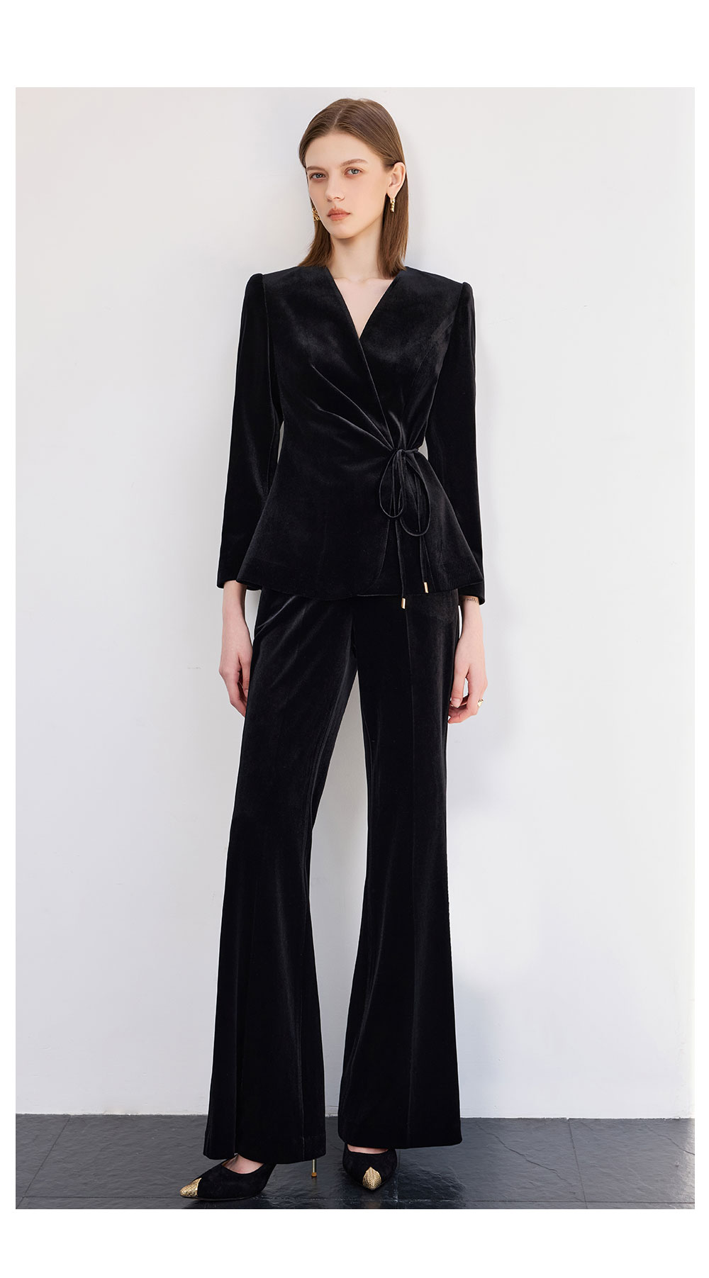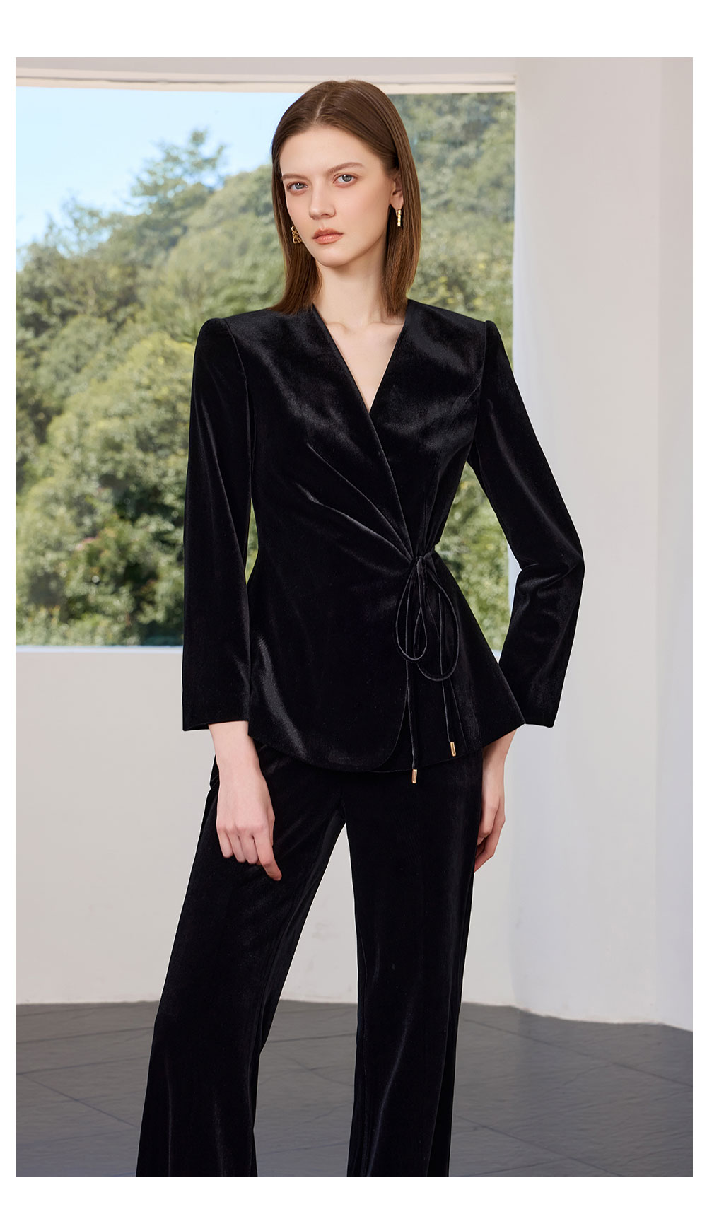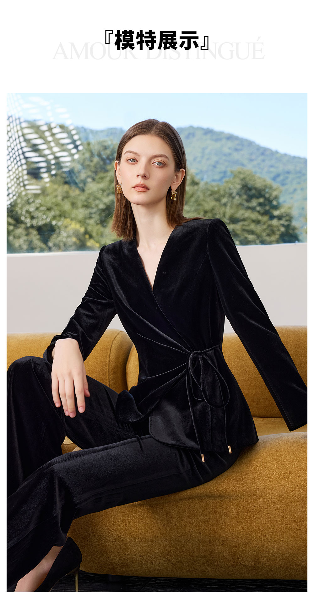 AD黑色丝绒西装套装女2025新款秋季轻奢优雅职业装收腰系带西服