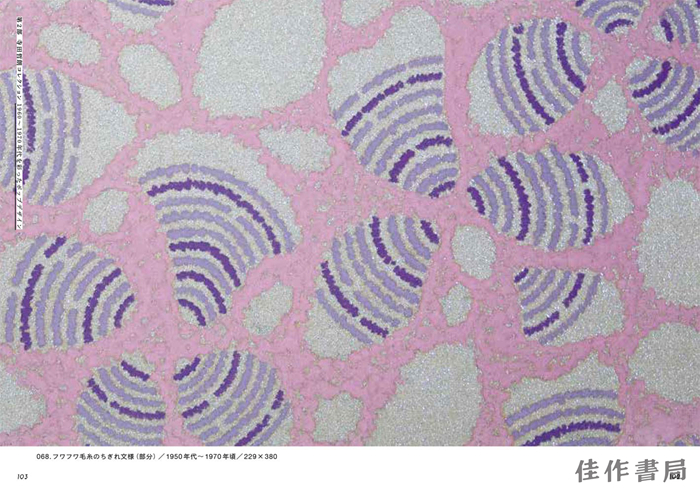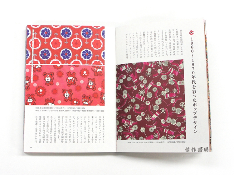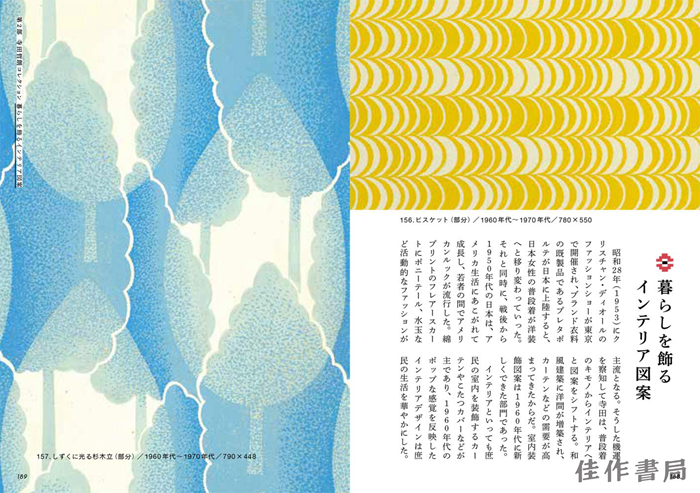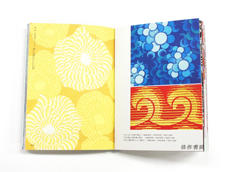 機械捺染機の輸入と発展により、大量生産が可能になった染色業界。とくに京都では1950年代から1970年代を中心に、和柄からポップなデザインまで、次々と新柄が生み出され生産されてきました。本書はその最盛期に図案家として活動した寺田哲朗が残した、膨大な図案の中から約240点を収録。デザインの移り変わりとともに、時代の変遷を追いかけます。