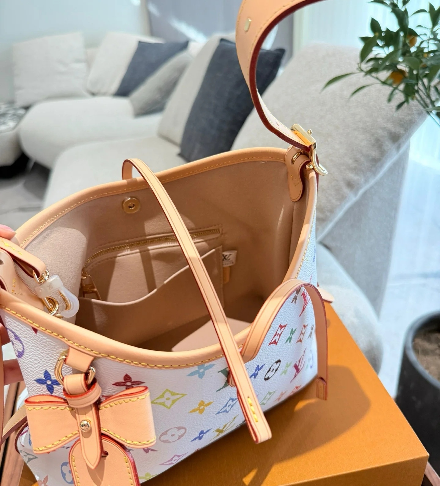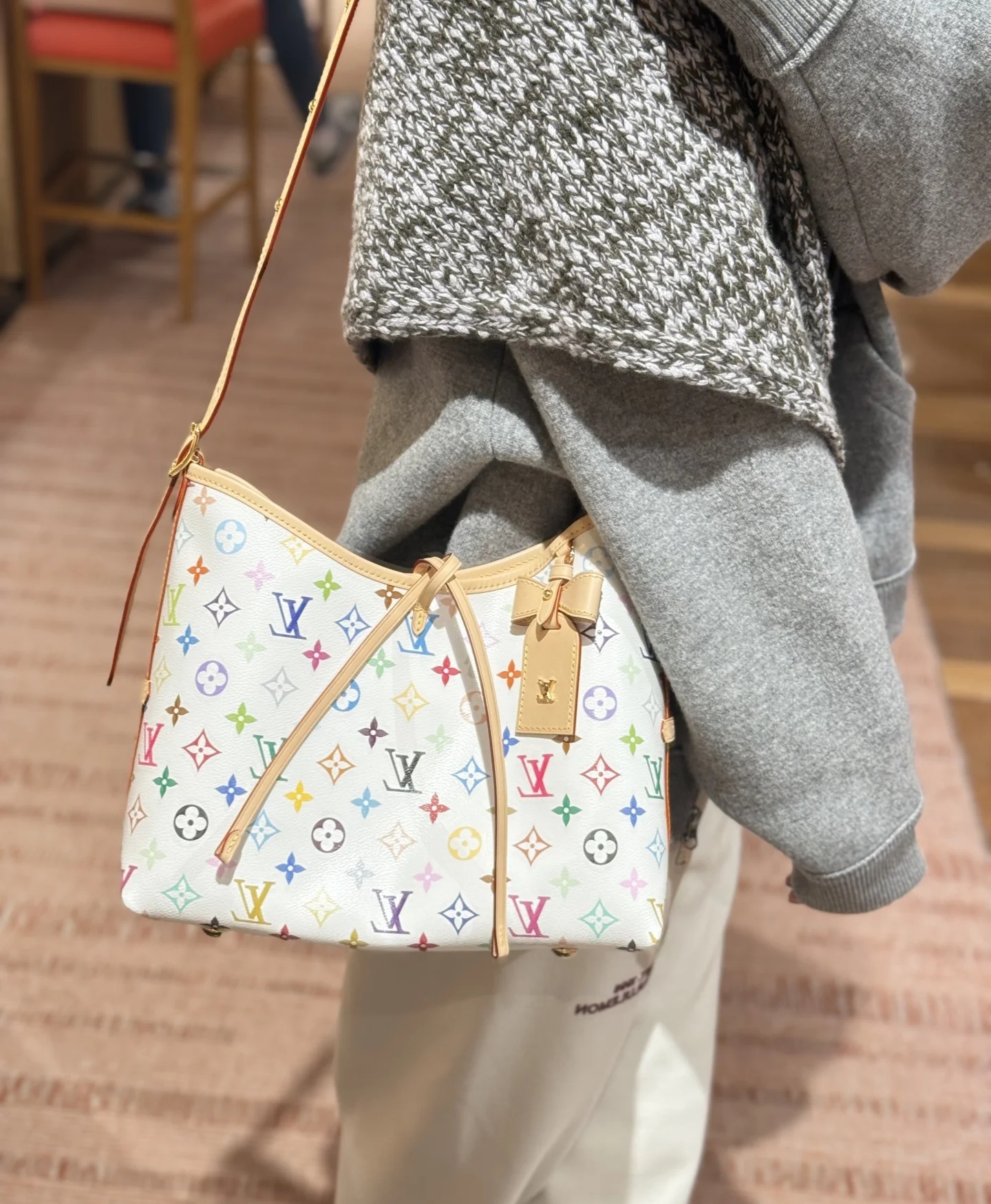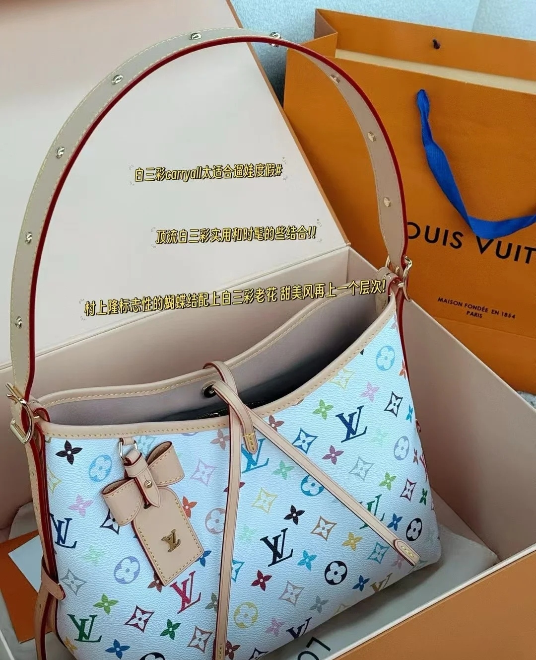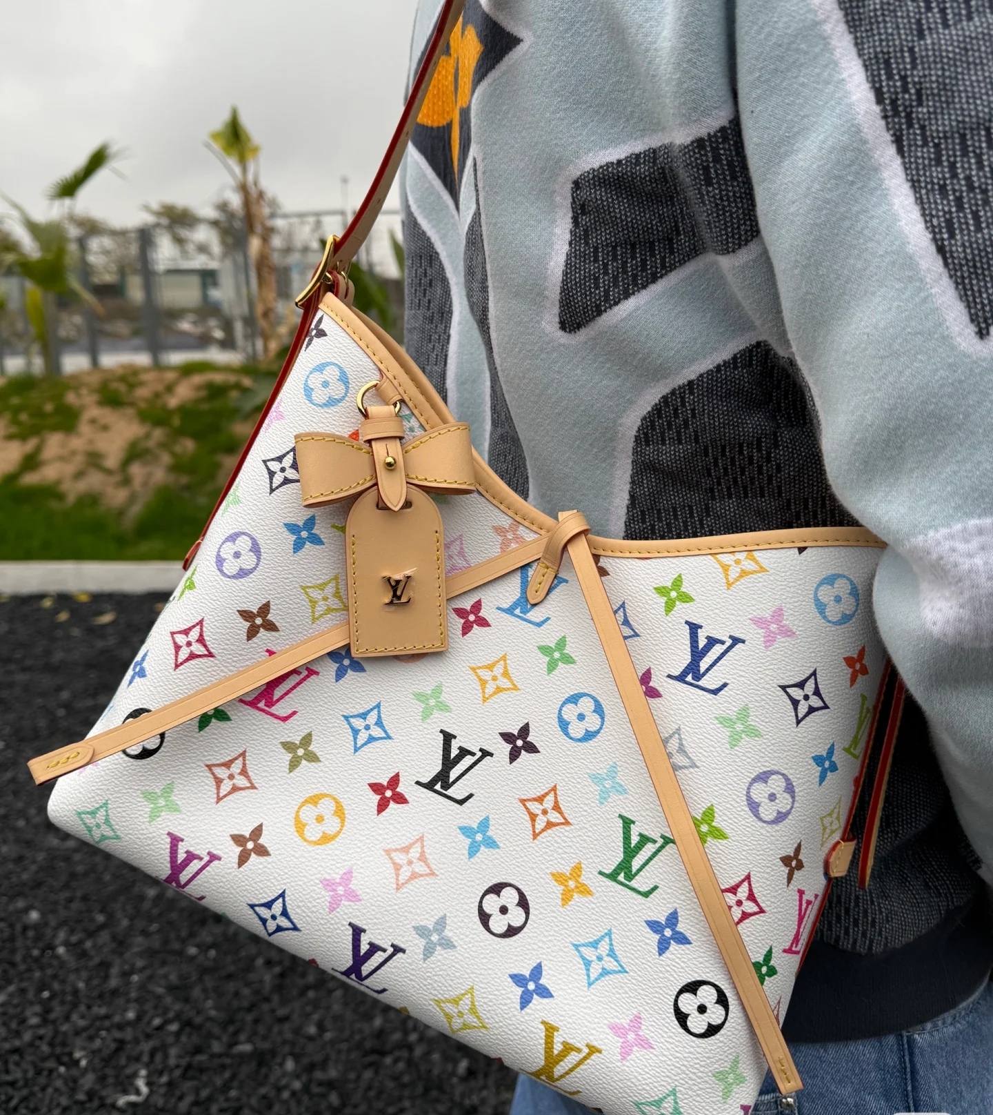 变色皮芯片版品质!CarryAll 小号手袋出自路易威登 x 村上隆再版系列,Monogram 涂层帆布巧妙融入日本艺术家的明丽色调。牛皮饰边勾勒贴身构型,点缀雅致蝴蝶结细节。