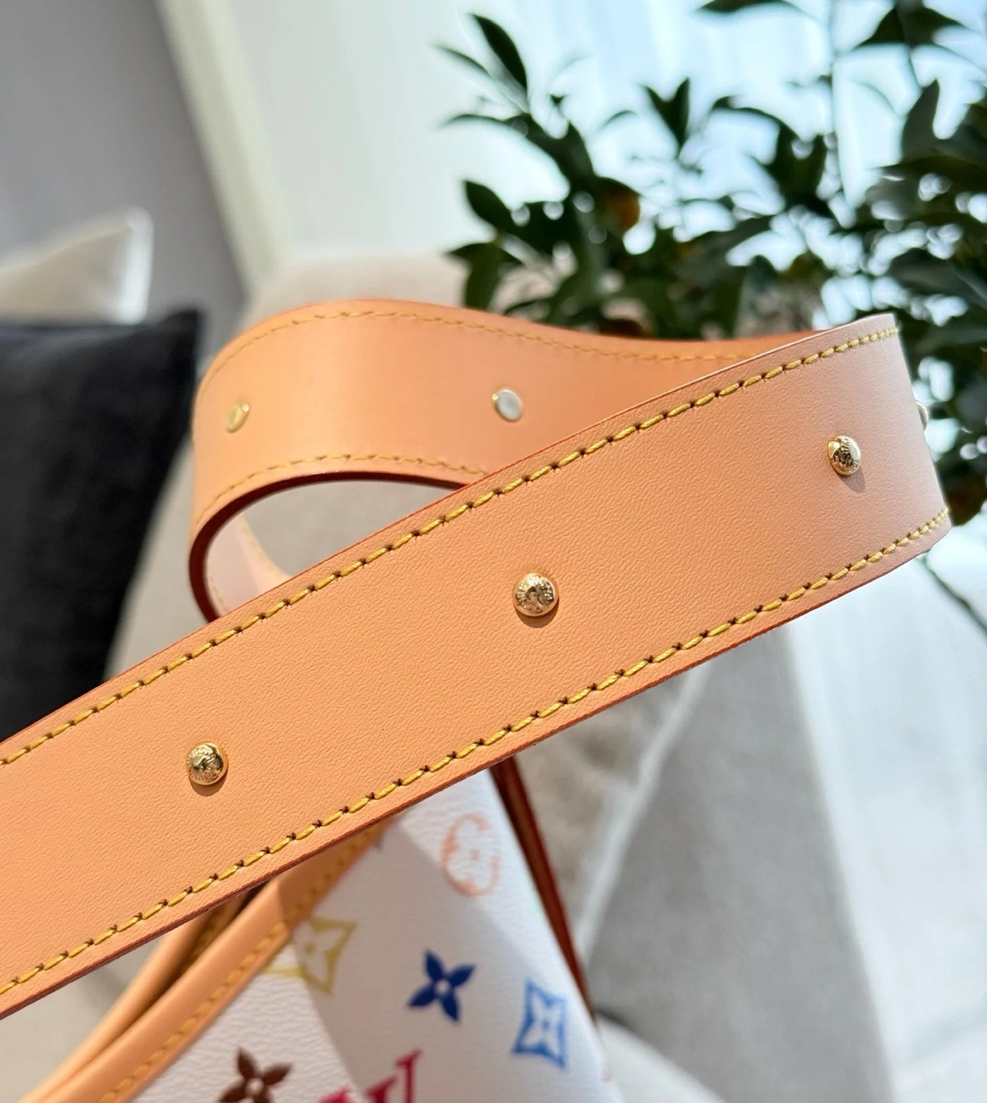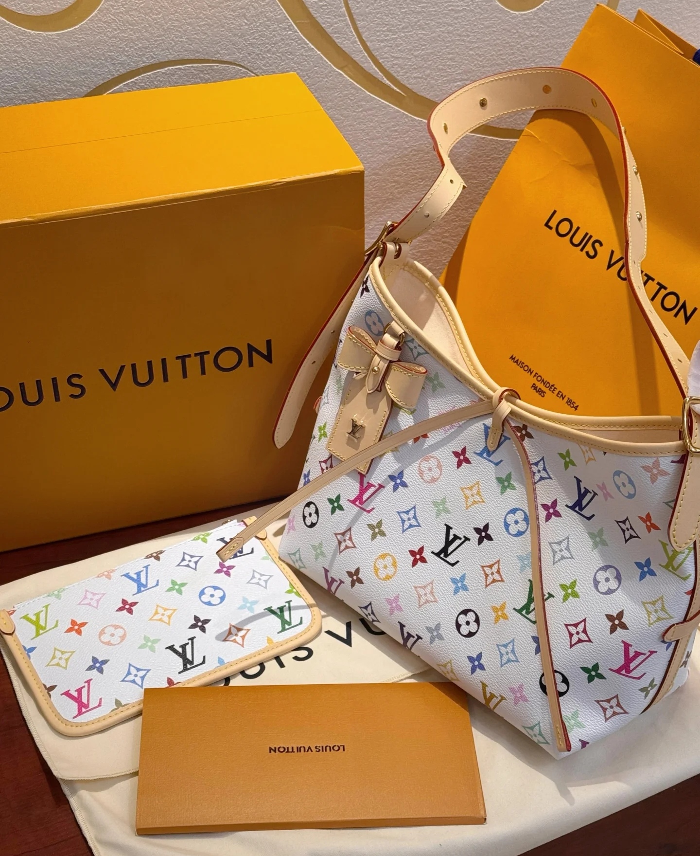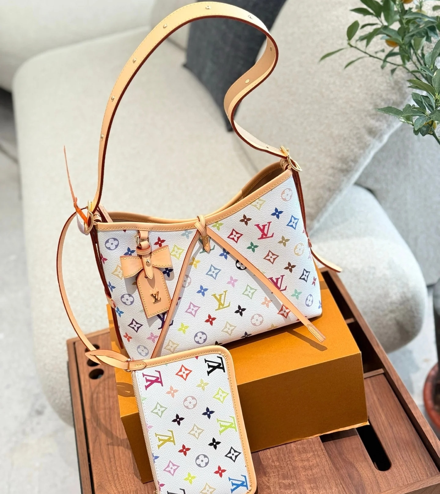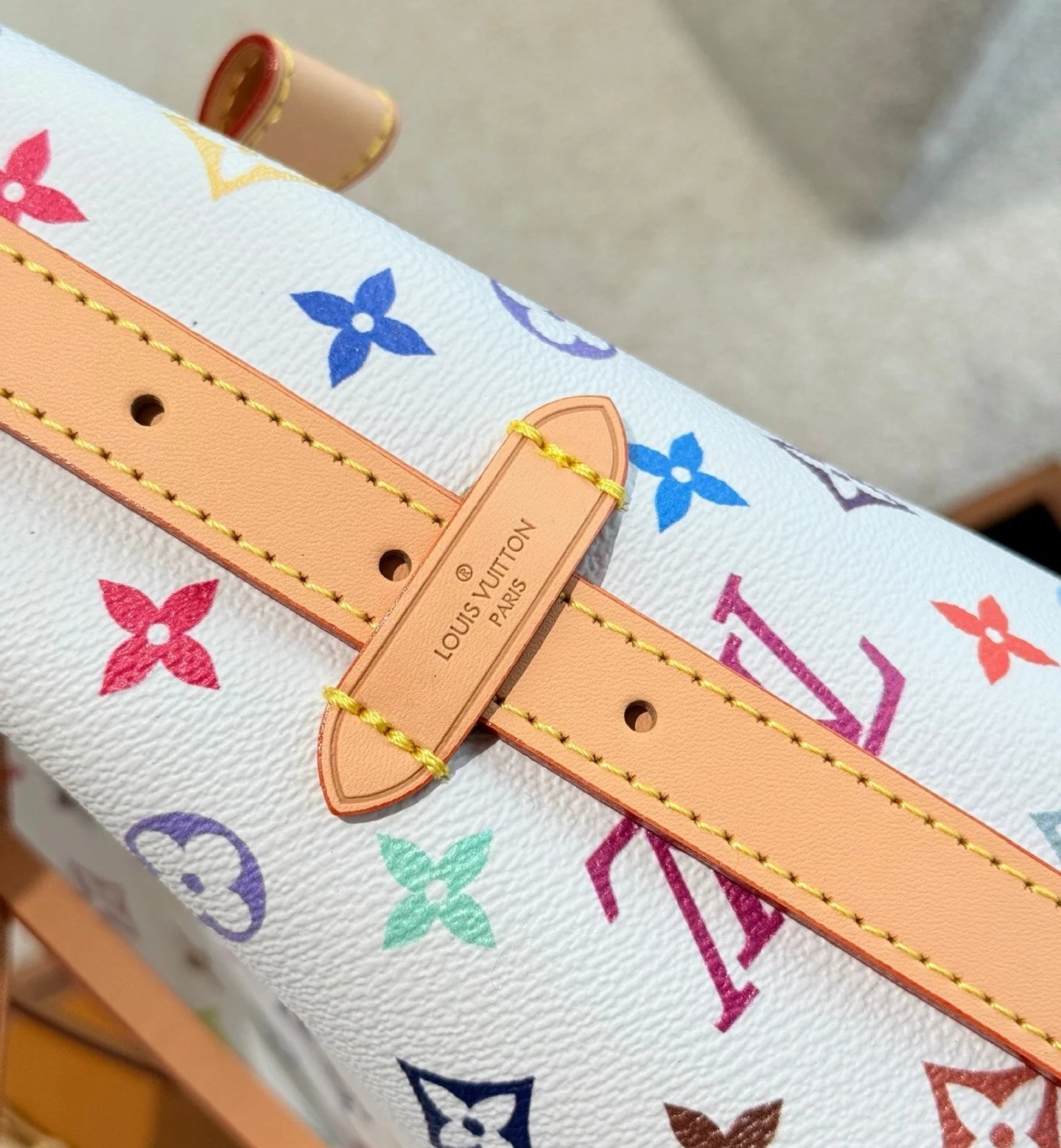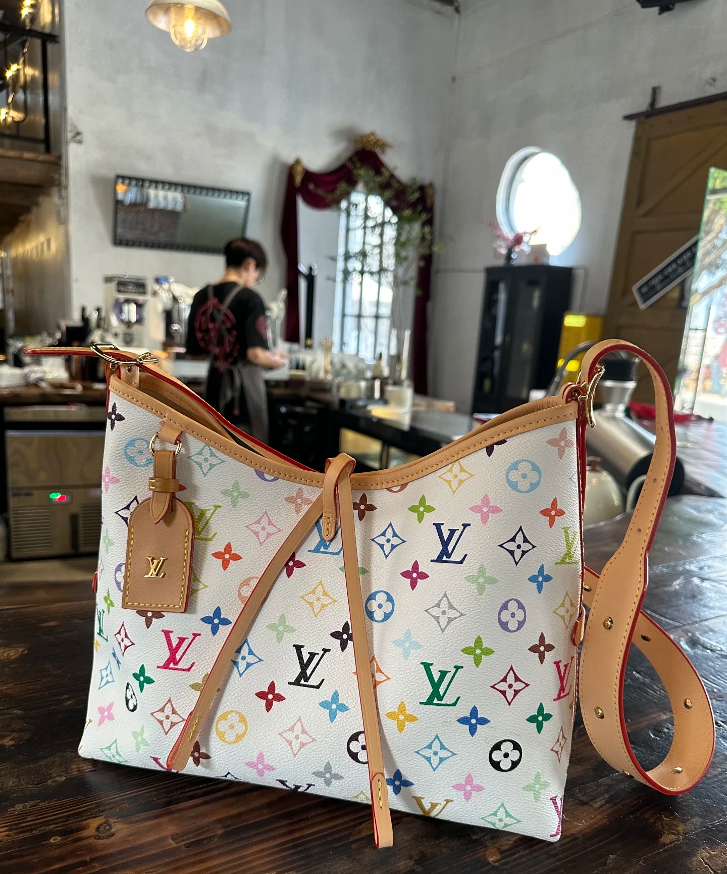 变色皮芯片版品质!CarryAll 小号手袋出自路易威登 x 村上隆再版系列,Monogram 涂层帆布巧妙融入日本艺术家的明丽色调。牛皮饰边勾勒贴身构型,点缀雅致蝴蝶结细节。