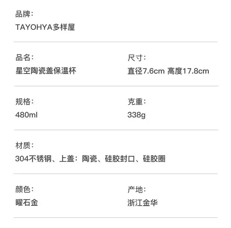 【6F】多样屋星空陶瓷盖保温杯304不锈钢办公保温水杯咖啡牛奶杯/480ml