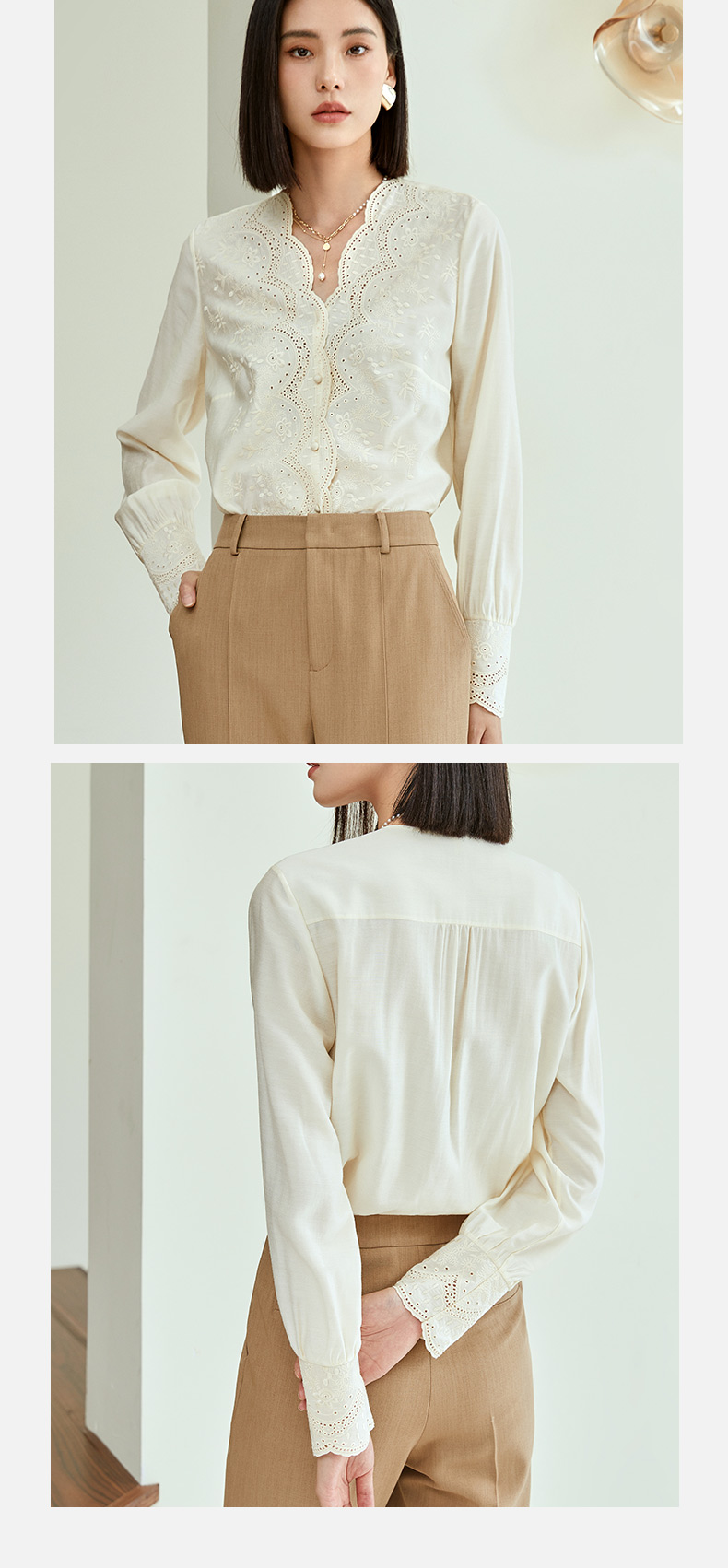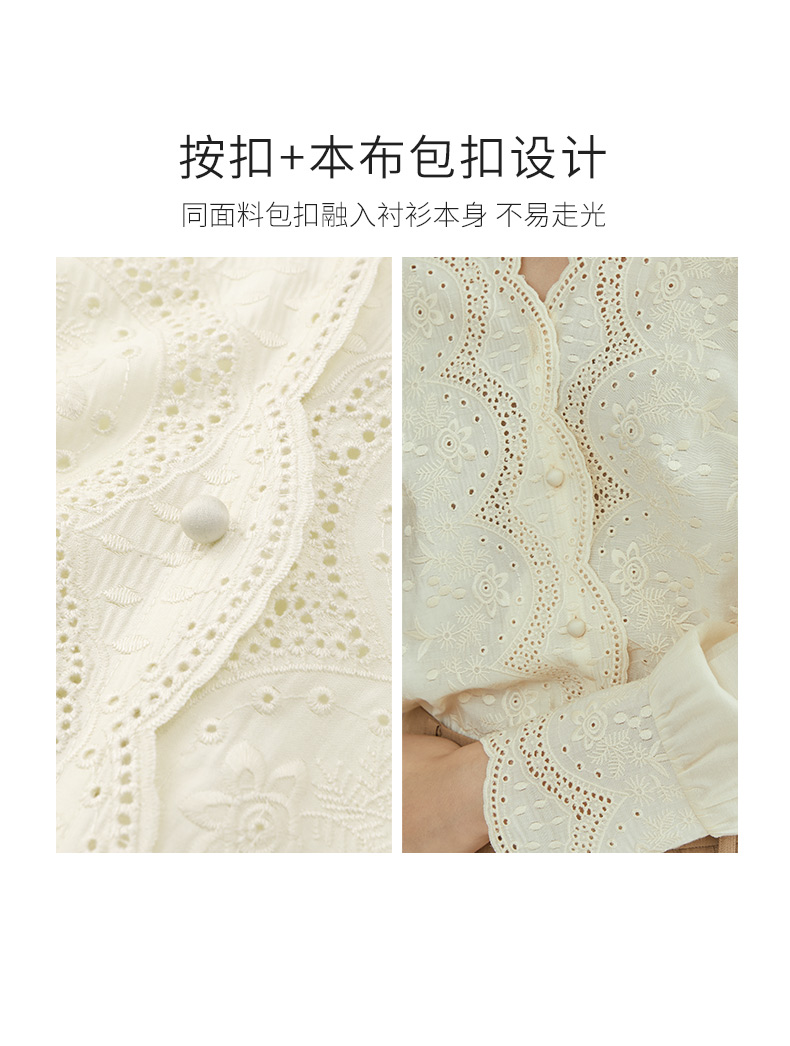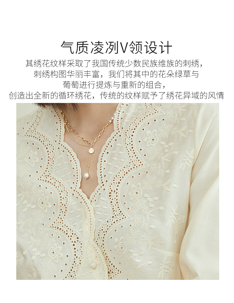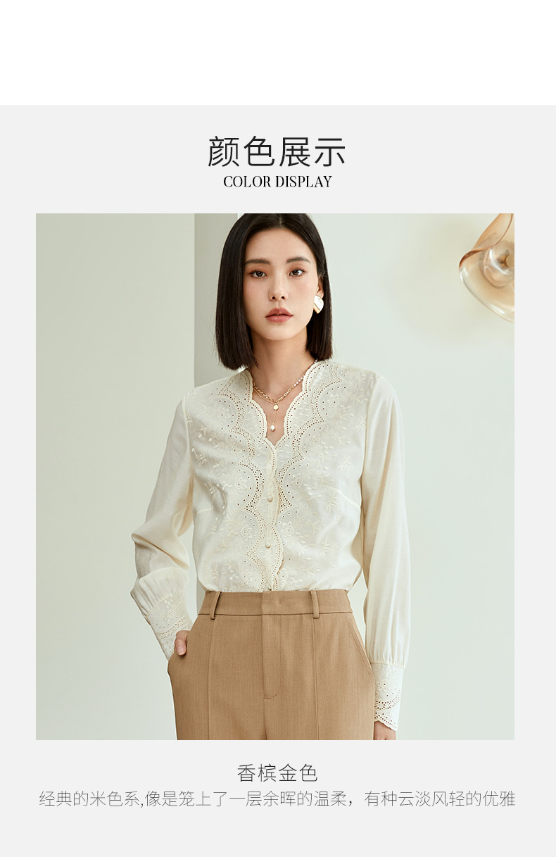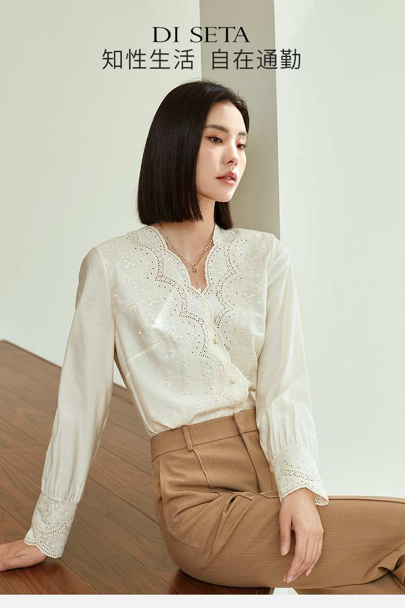 玳莎绣花气质V领衬衫女秋季新款宽松显瘦优雅别致长袖衬衣 DC31304