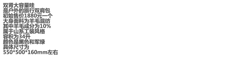 羊毛双肾双肩包,34L大容量。山系工装风户外旅行提袋背包C080168