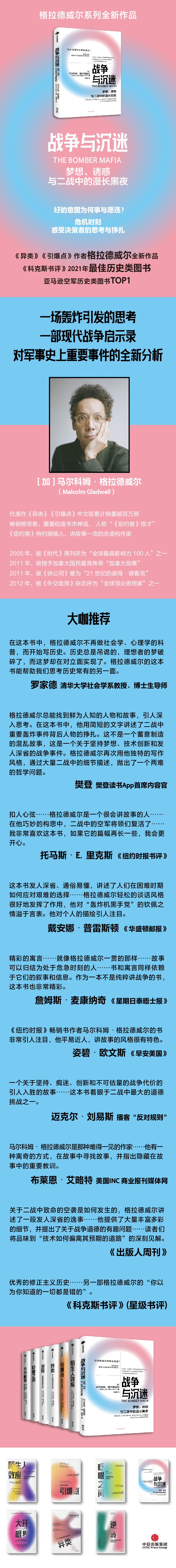 1.《异类》《引爆点》作者格拉德威尔全新作品 “超会讲故事的作家”、具影响力100人之一格拉德威尔全新作品 2. 《科克斯书评》2021年最佳历史类图书 亚马逊空军历史类图书TOP1 3.延续“格拉德威尔”系列风格 4. 一部现代战争启示录 一个关于坚持、痴迷、创新和不可估量的战争代价的引人入胜的故事 5. 对军事史上最重要事件之一东京大轰炸的全新分析 6. 当道德面临现实,当梦想与坚持濒临幻灭,感受决策者背后的权衡与挣扎