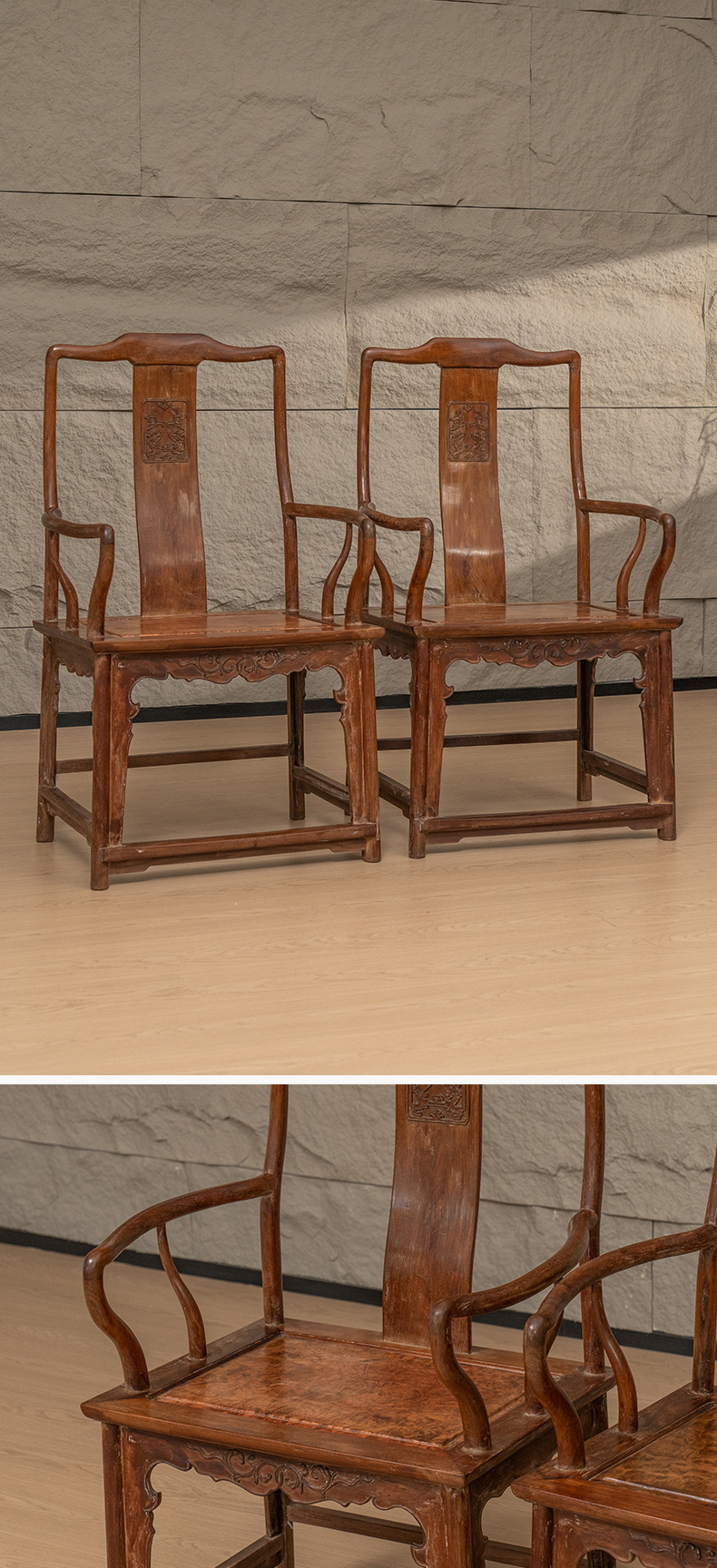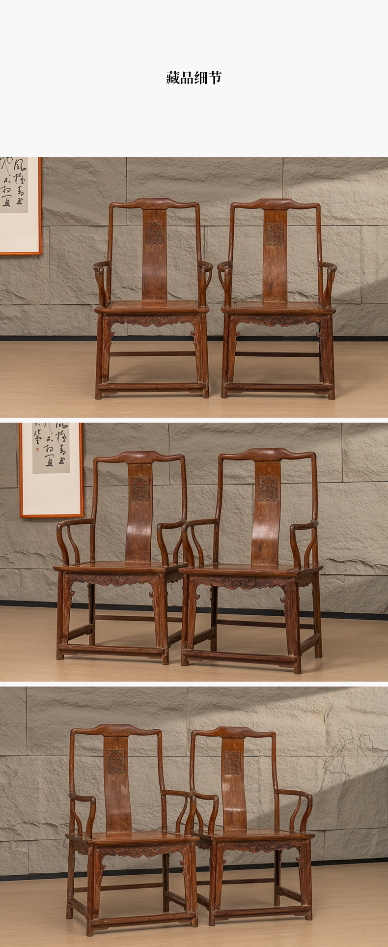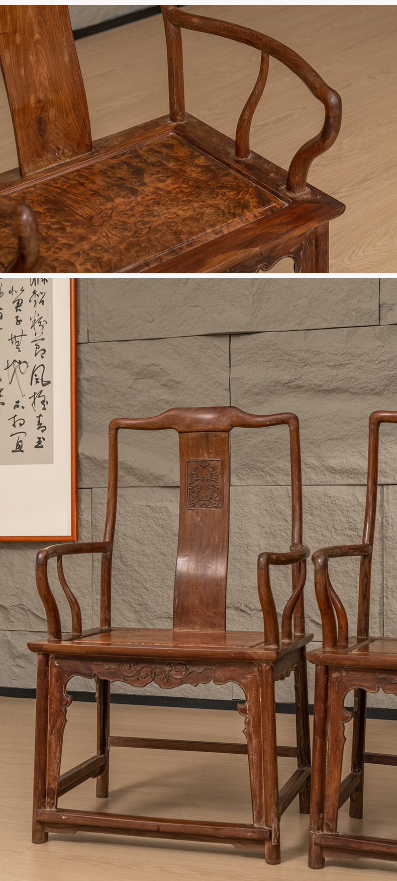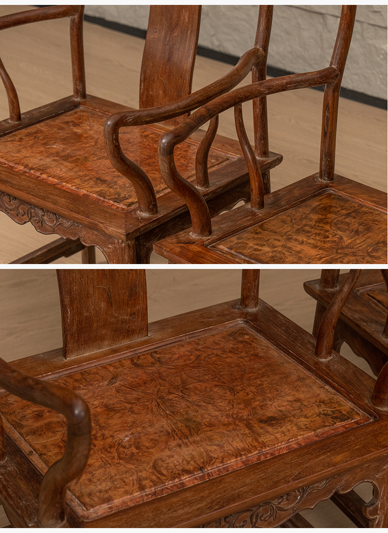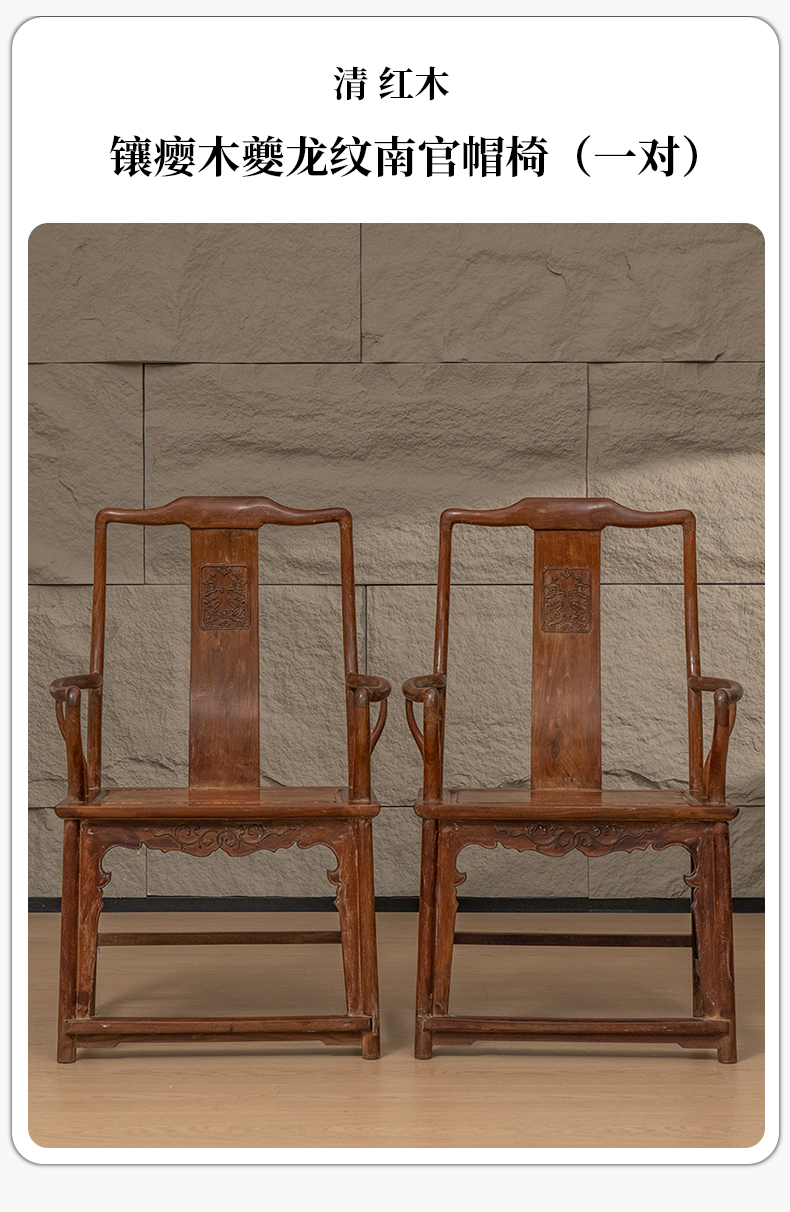 清 红木镶瘿木夔龙纹南官帽椅(一对)
