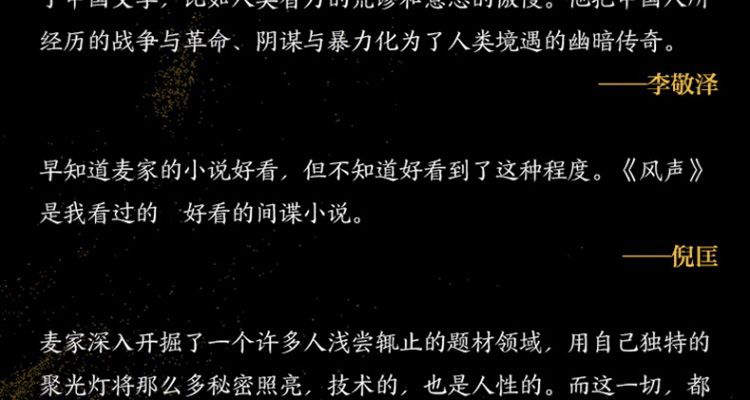 早知道麦家的小说好看,但不知道好看到了这种程度。《风声》是我看过的zui好看的间谍小说。——倪匡