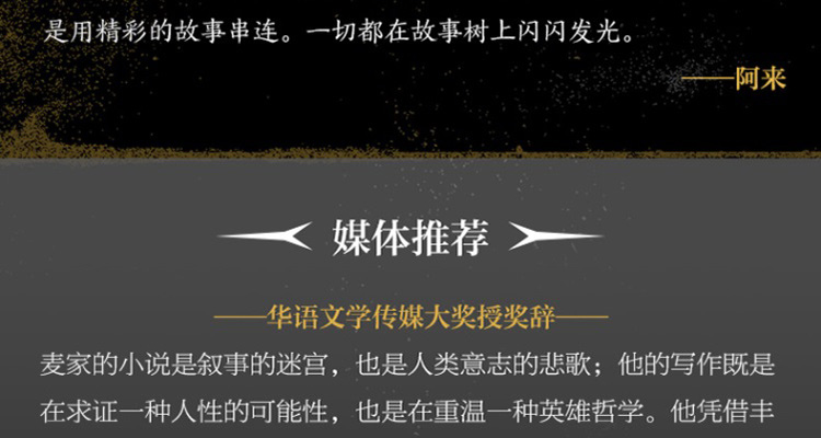 麦家的小说是叙事的迷宫,也是人类意志的悲歌;他的写作既是在求证一种人性的可能性,也是在重温一种英雄哲学。他凭借丰盛的想像、坚固的逻辑,以及人物性格演进的严密线索,塑造、表彰了一个人如何在信念的重压下,在内心的旷野里,为自己的命运和职责有所行动、承担甚至牺牲。——华语文学传媒大奖授奖辞