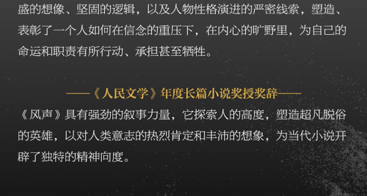 《风声》是茅盾文学奖得主麦家的长篇力作,曾多次被改编为影视和话剧作品。小说讲述了一个人如何在孤独与绝望之中,在责任的重压和现实的重重锁链之下,凭借强大的信念和天才的想象突围而去,如凤凰涅槃。作者以高超的写作技巧,迷宫般的叙事,还原了一段真假难辨的传奇故事。罗生门般的故事结构,柳暗花明的情节发展,酣畅淋漓的阅读感受,让此书成为当代中文小说的经典之作。此书曾获《人民文学》年度zui jia小说奖、华语文学传媒大奖、巴金文学奖,更是《人民文学》创刊以来全文登载的长篇小说。