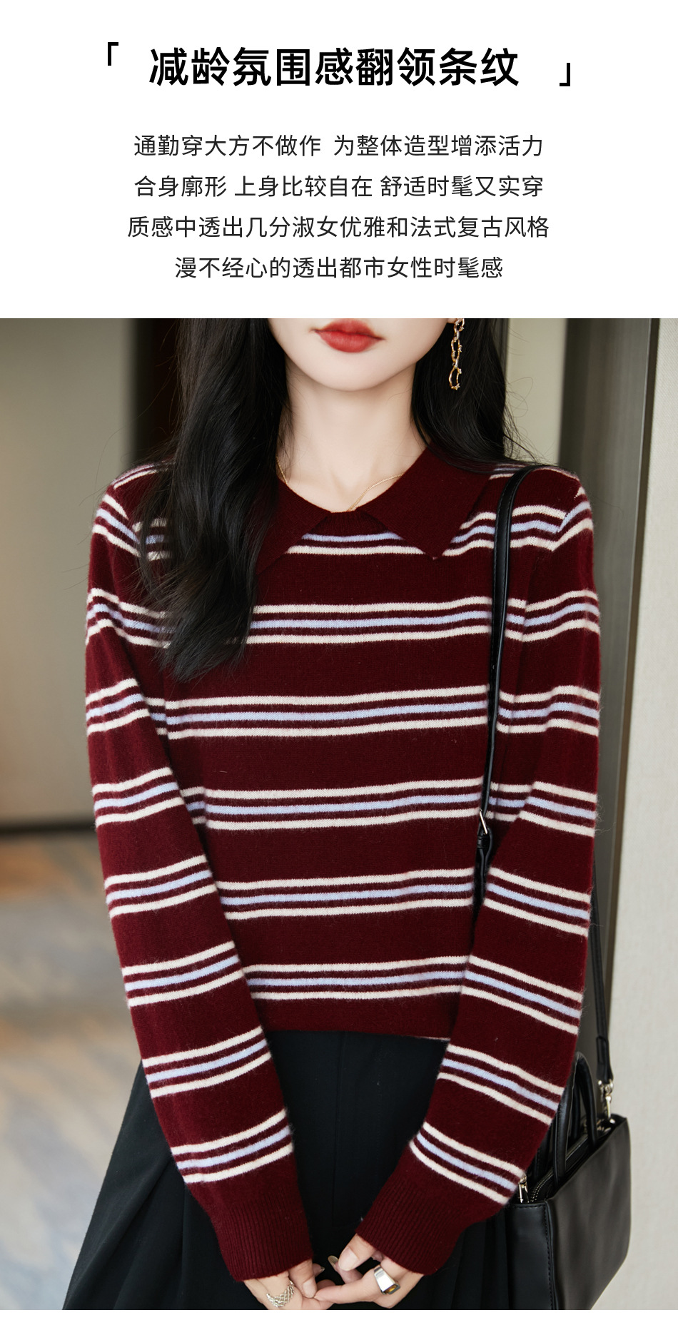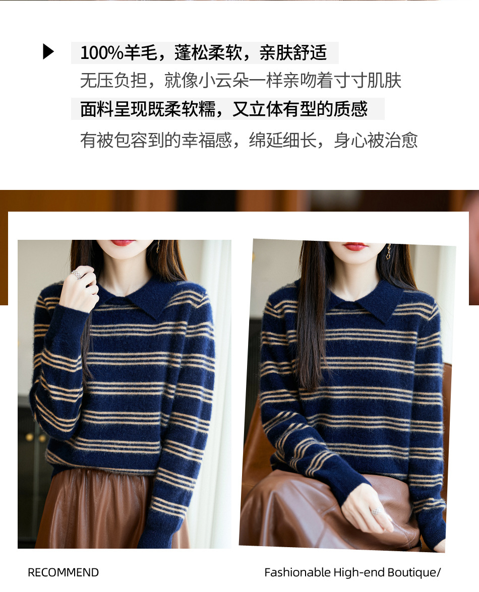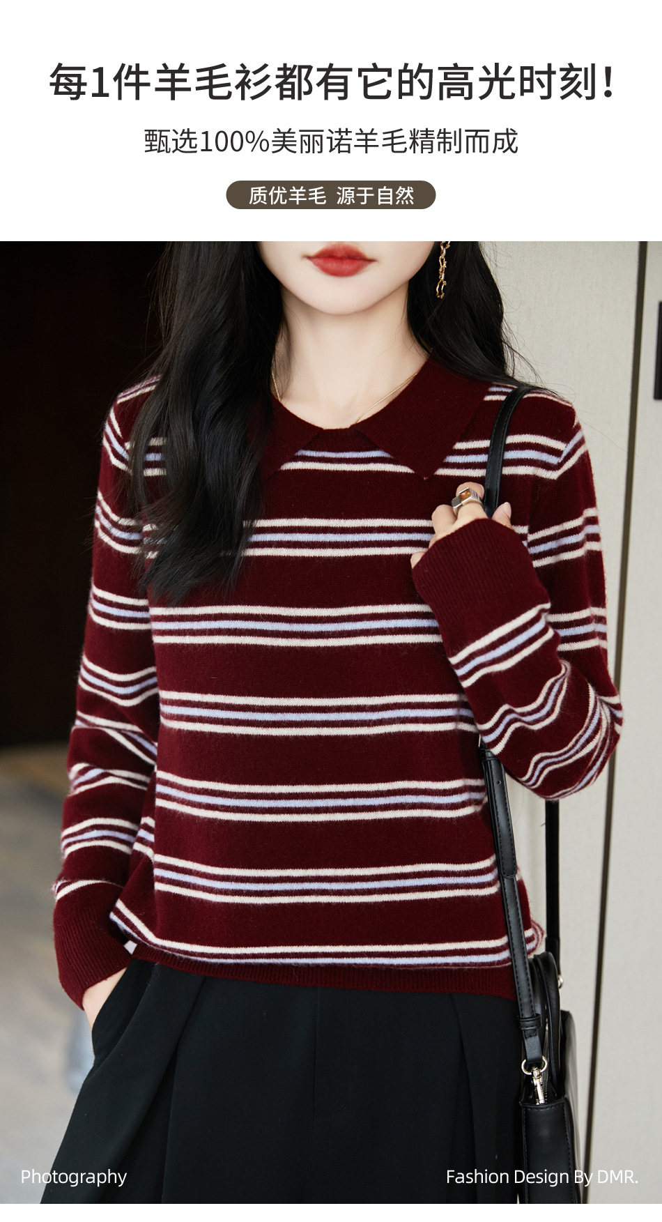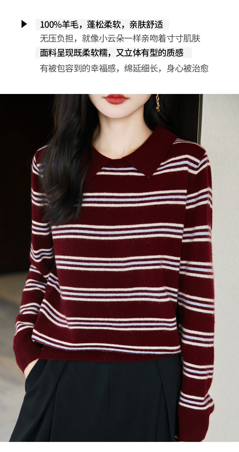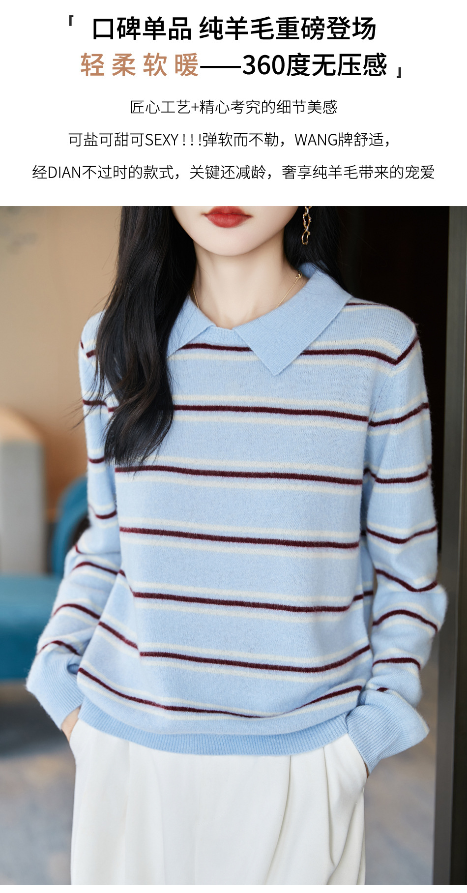 丁摩100%纯羊毛新款女式宽松Polo领条纹短款打底针织衫毛衣ALM2-277