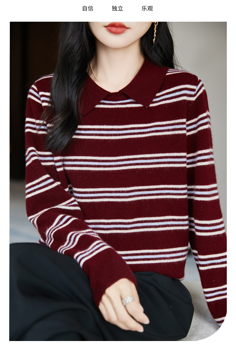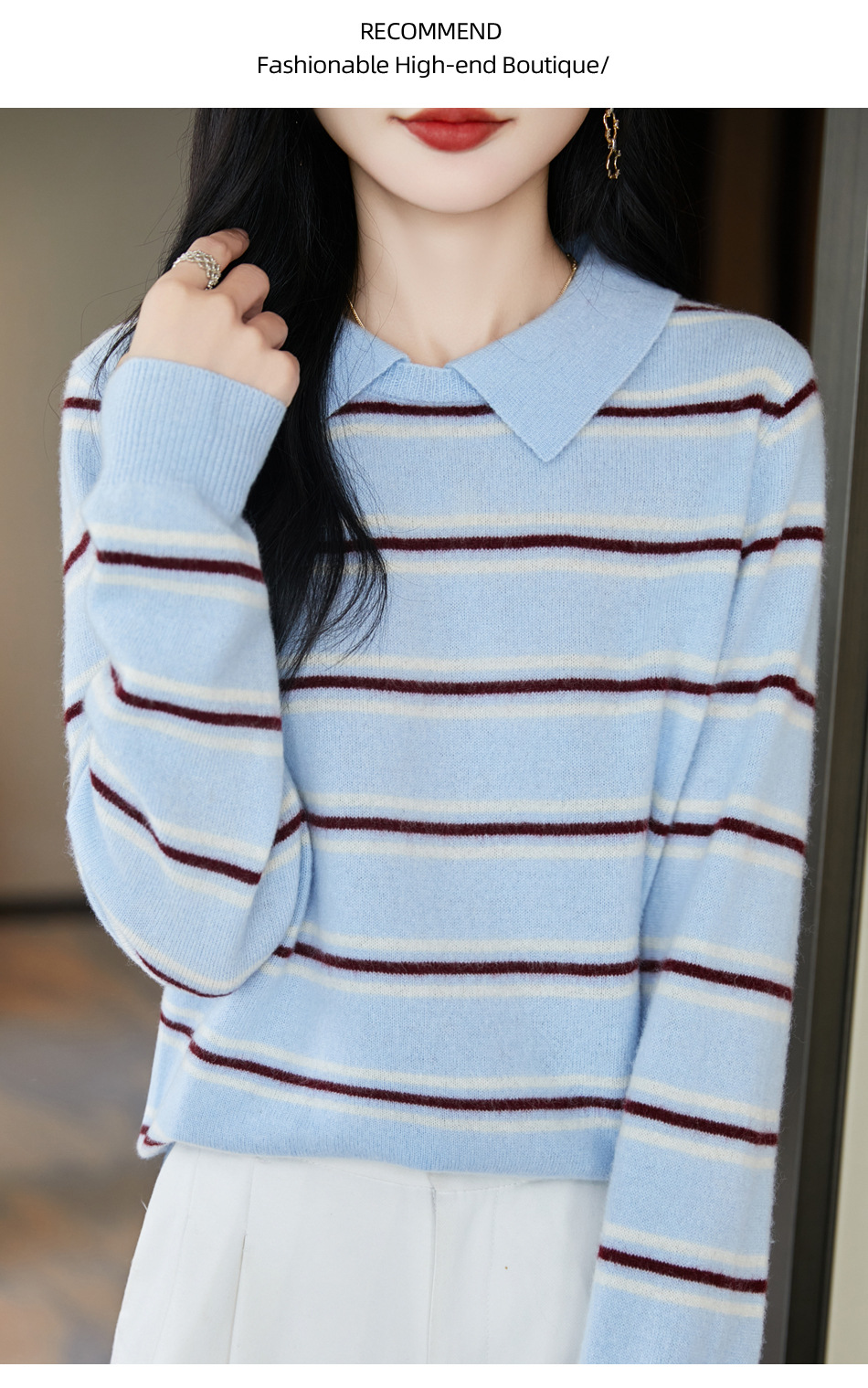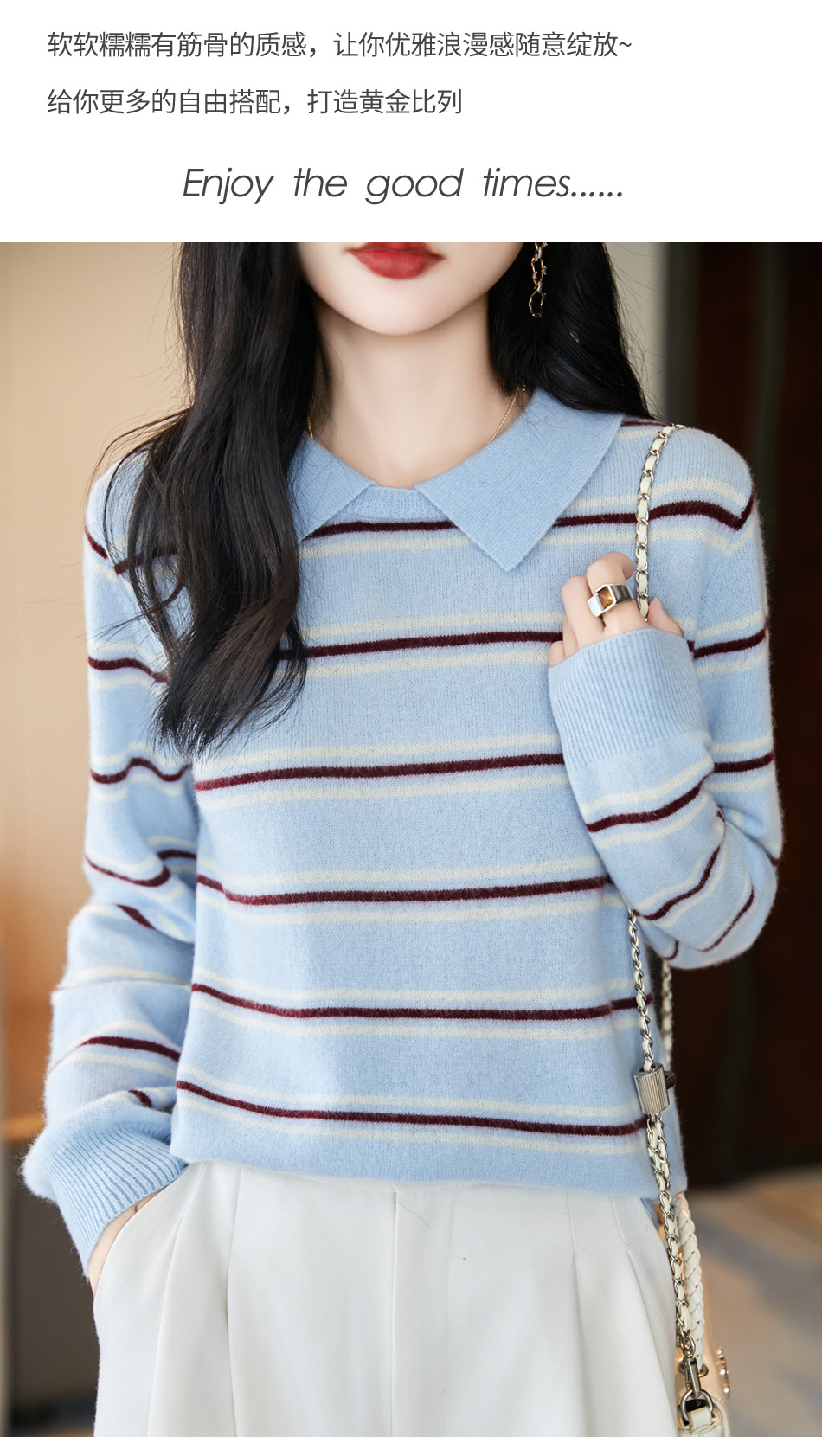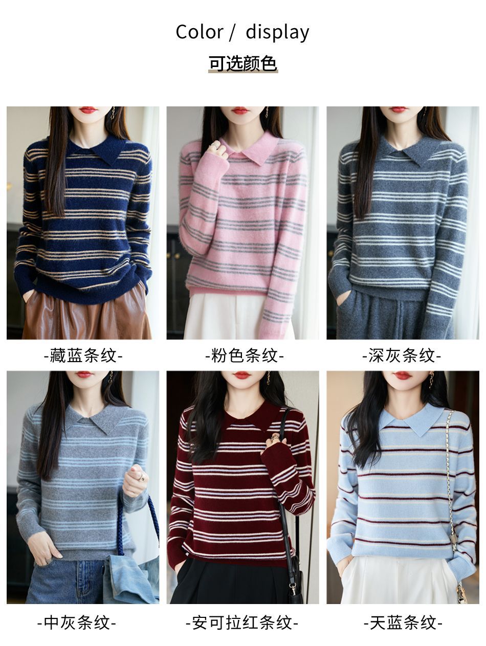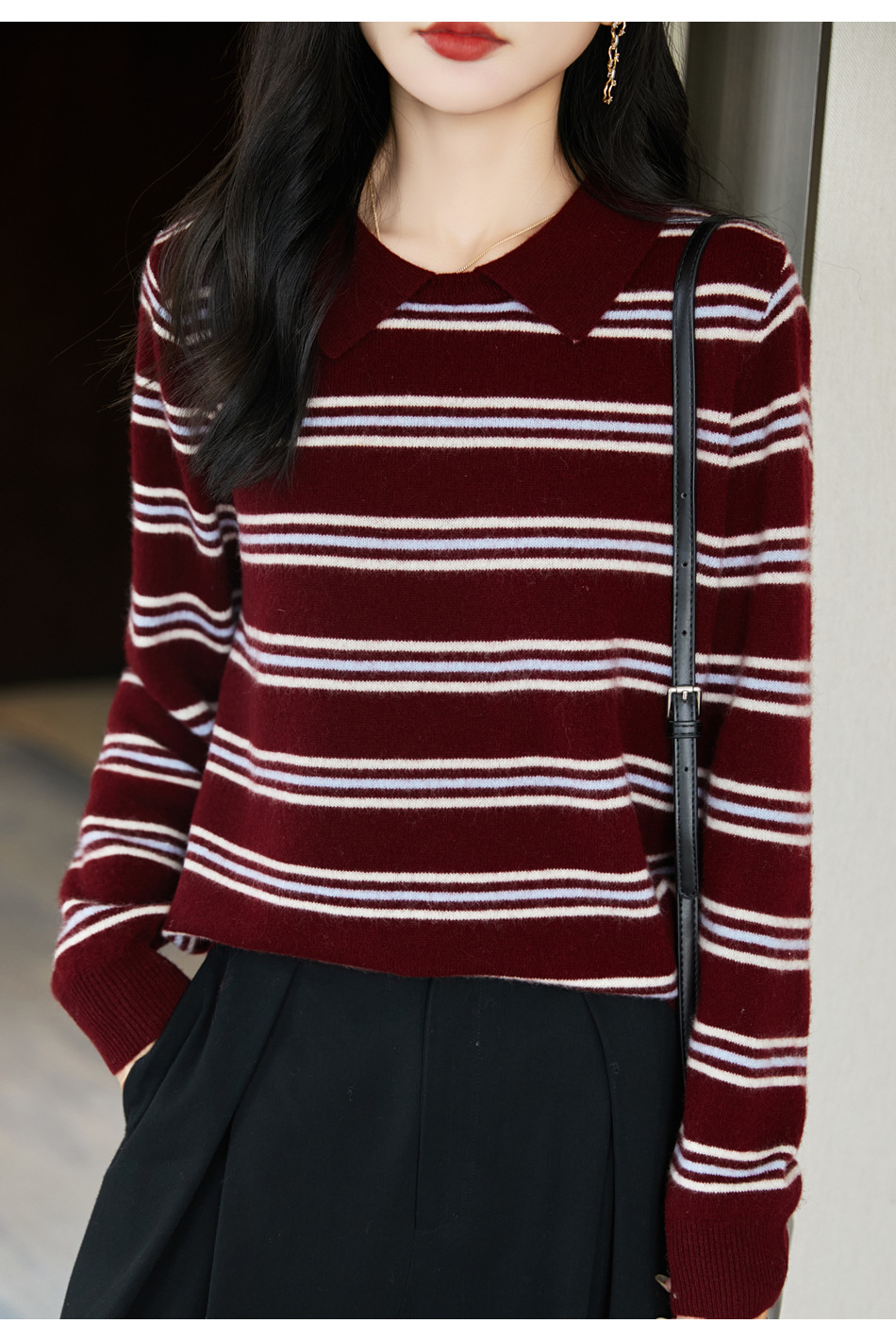 丁摩100%纯羊毛新款女式宽松Polo领条纹短款打底针织衫毛衣ALM2-277