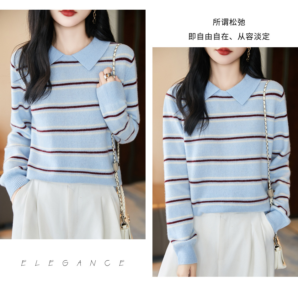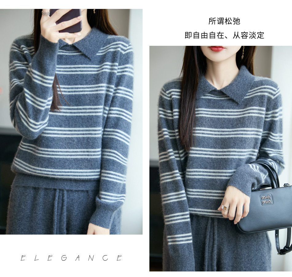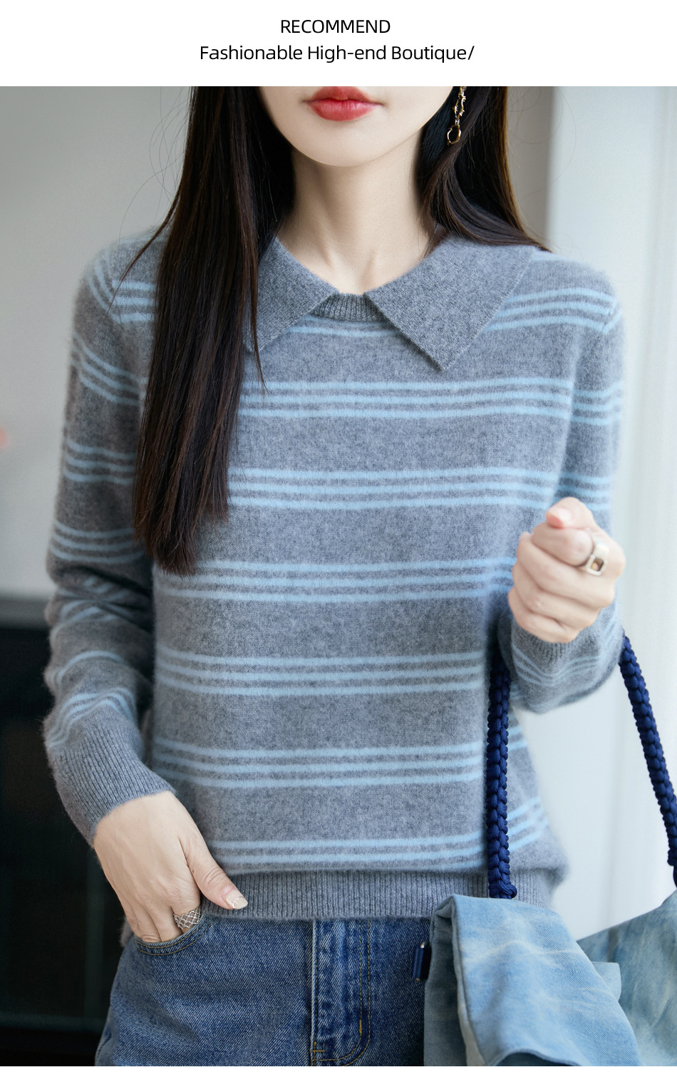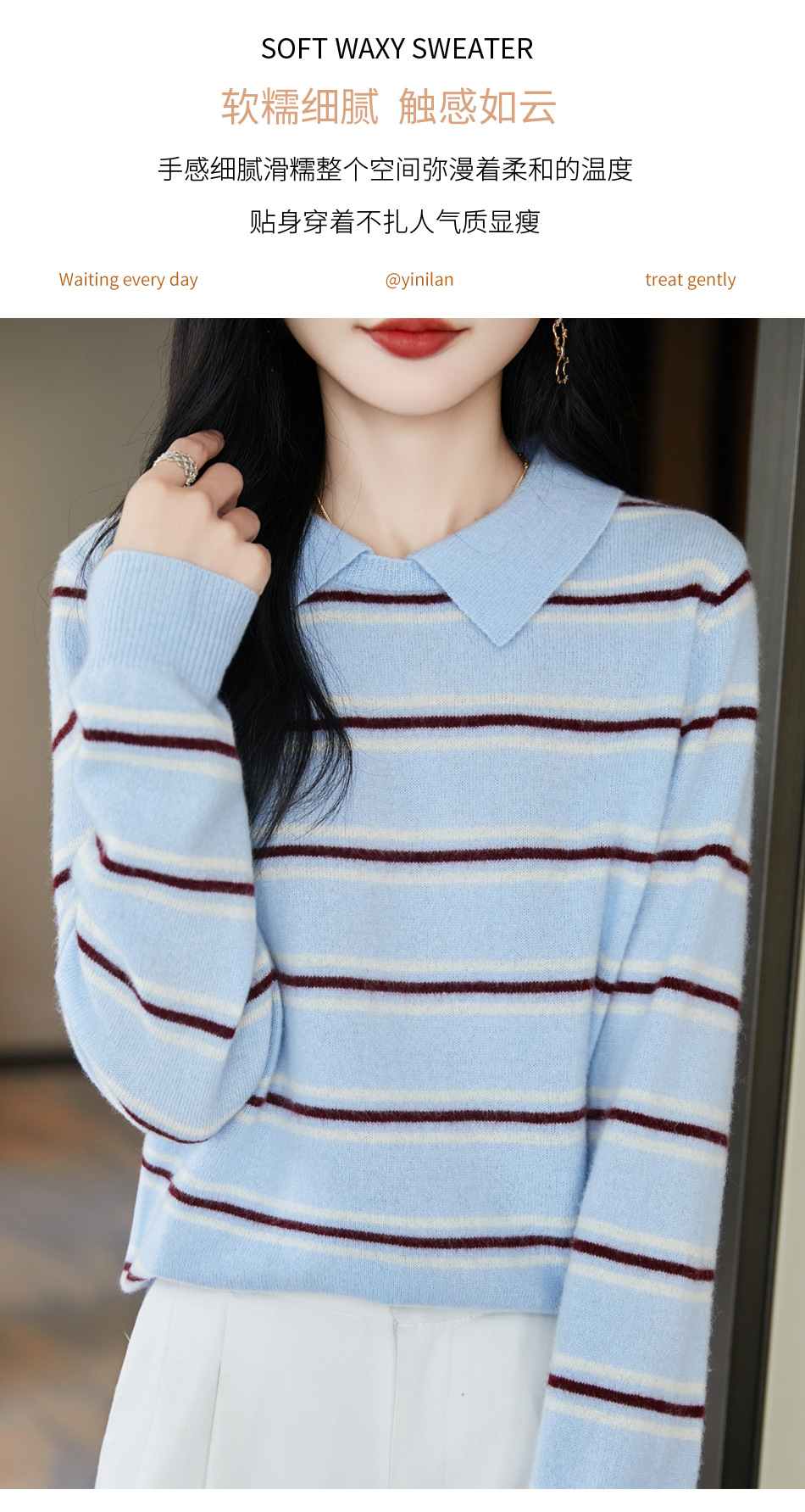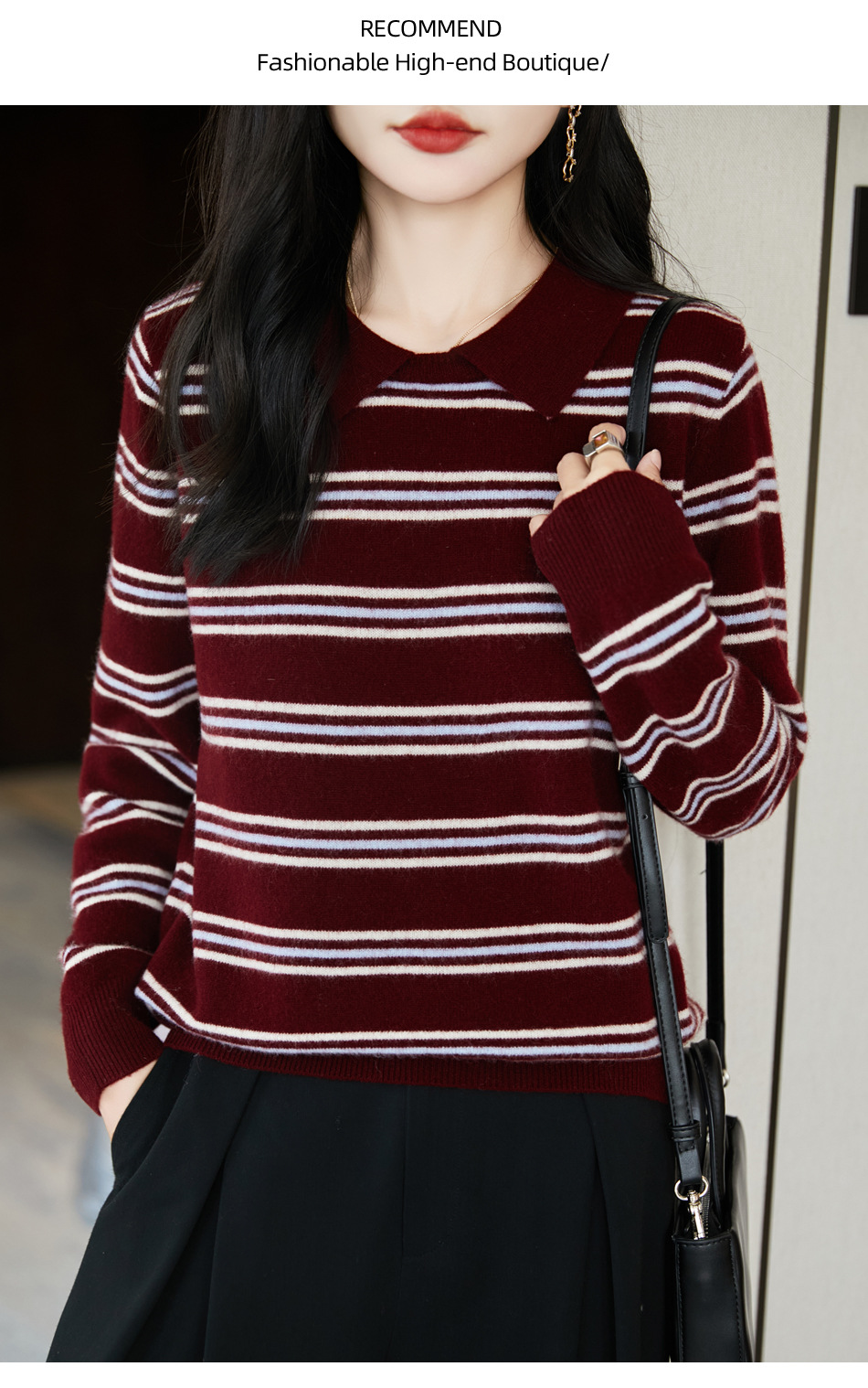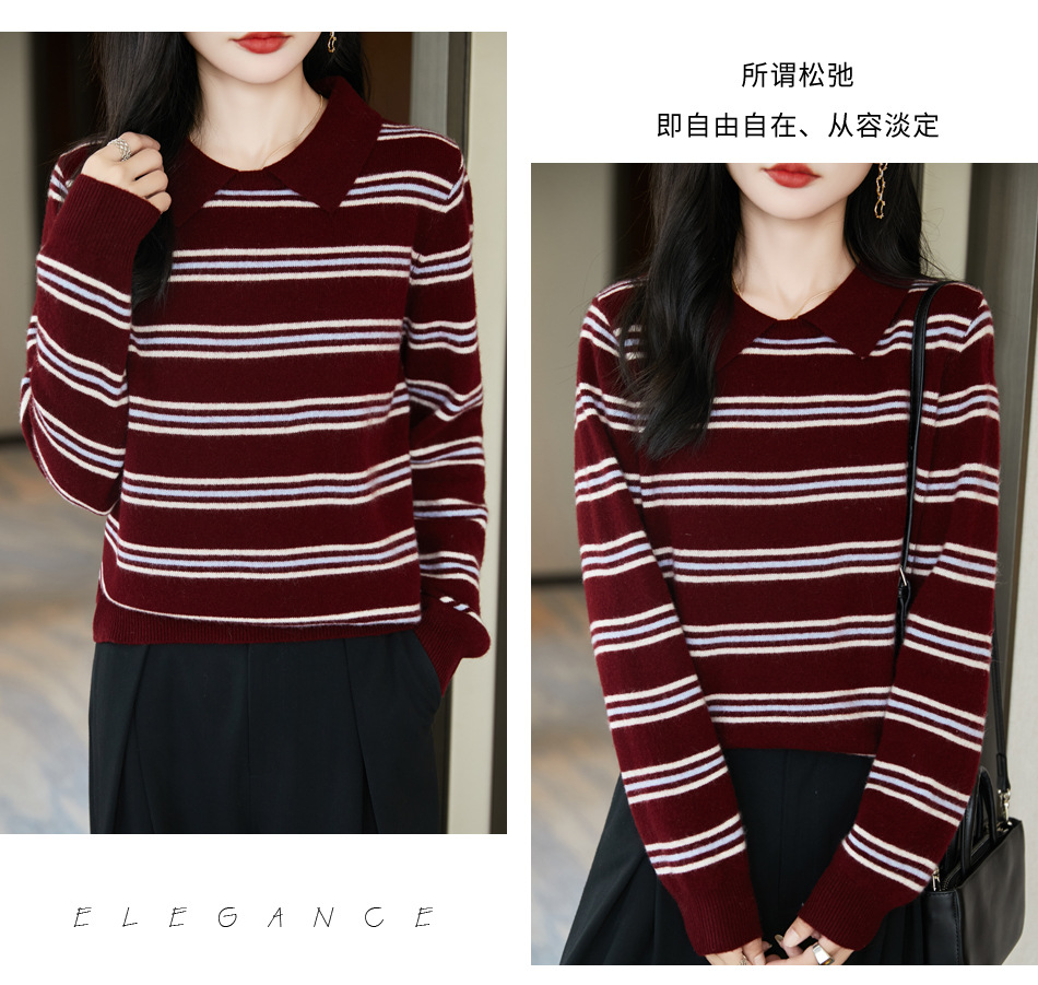 丁摩100%纯羊毛新款女式宽松Polo领条纹短款打底针织衫毛衣ALM2-277