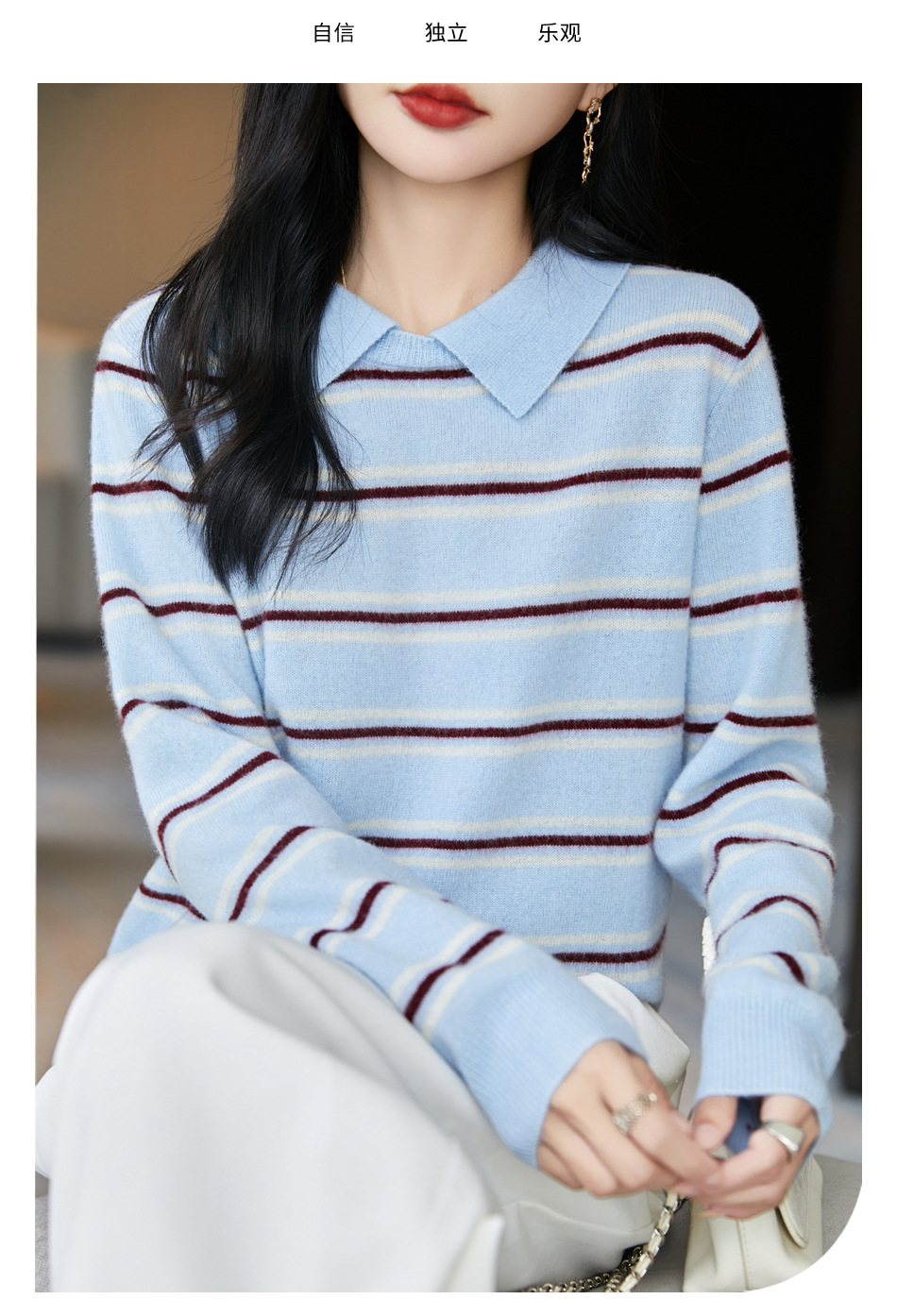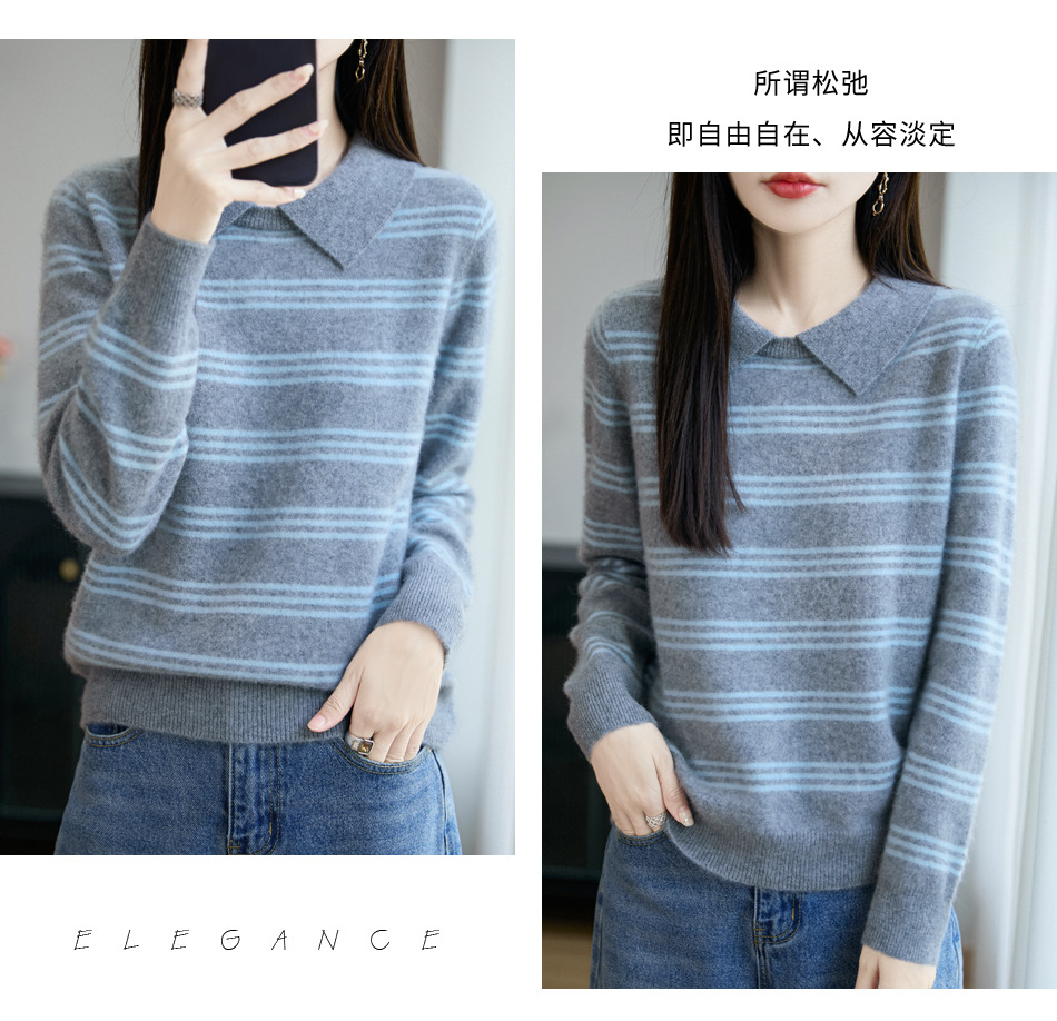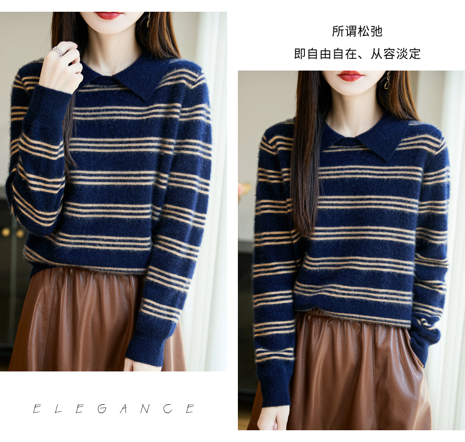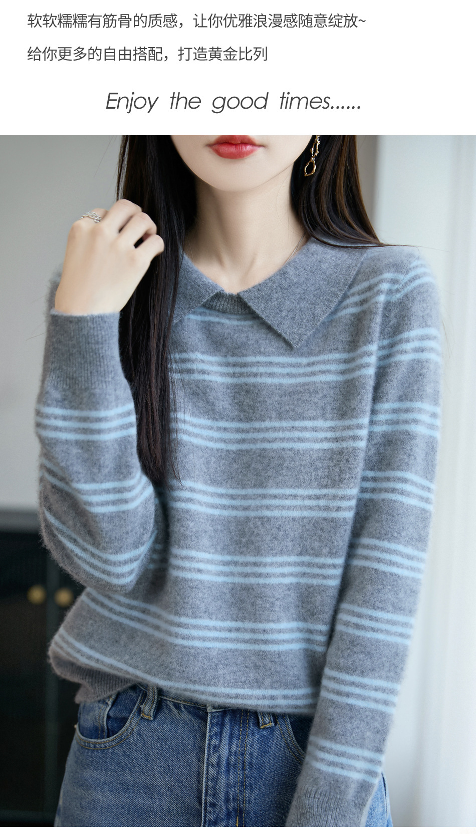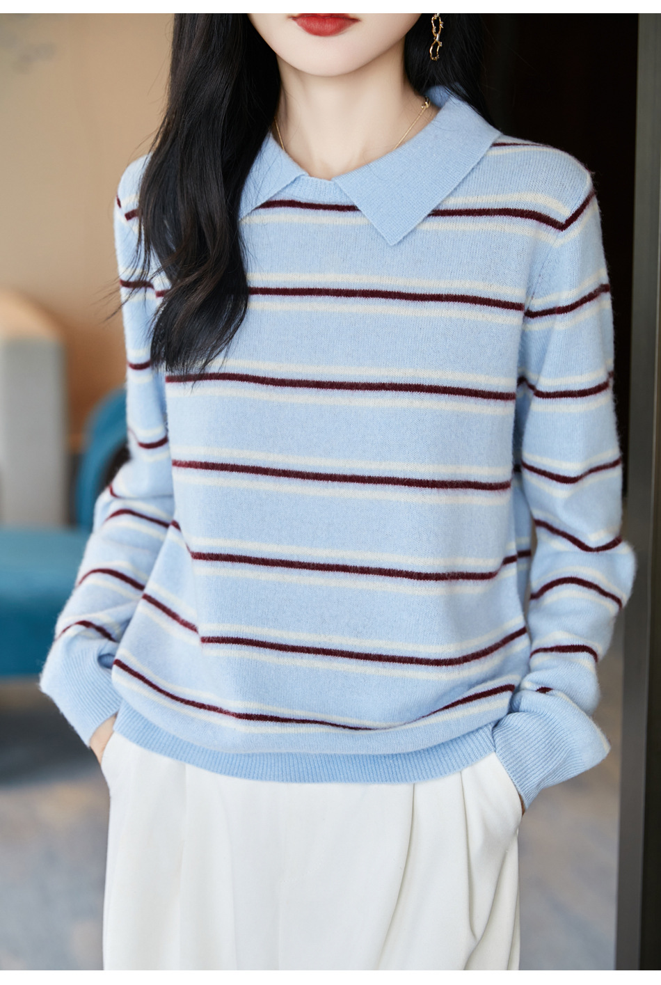丁摩100%纯羊毛新款女式宽松Polo领条纹短款打底针织衫毛衣ALM2-277