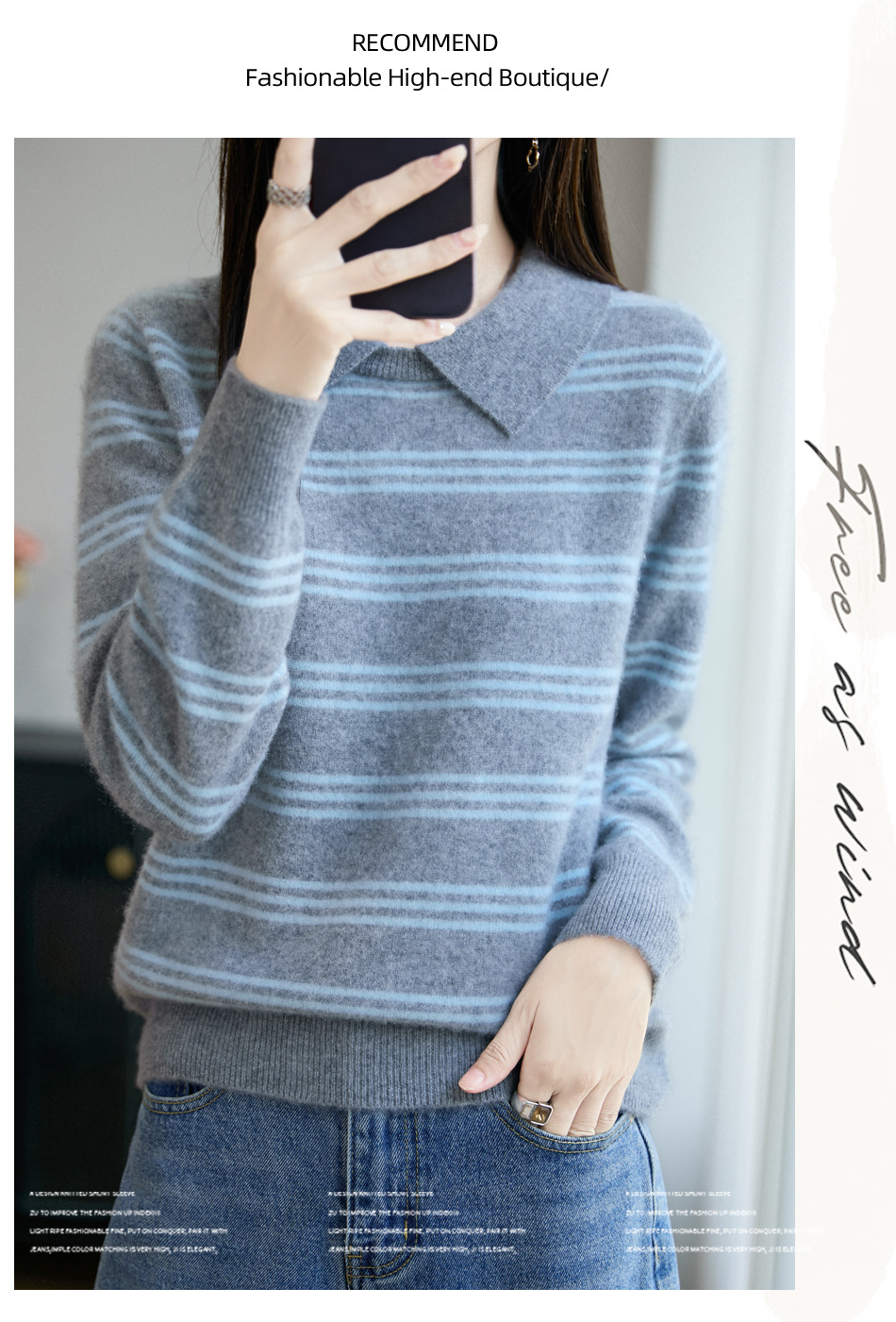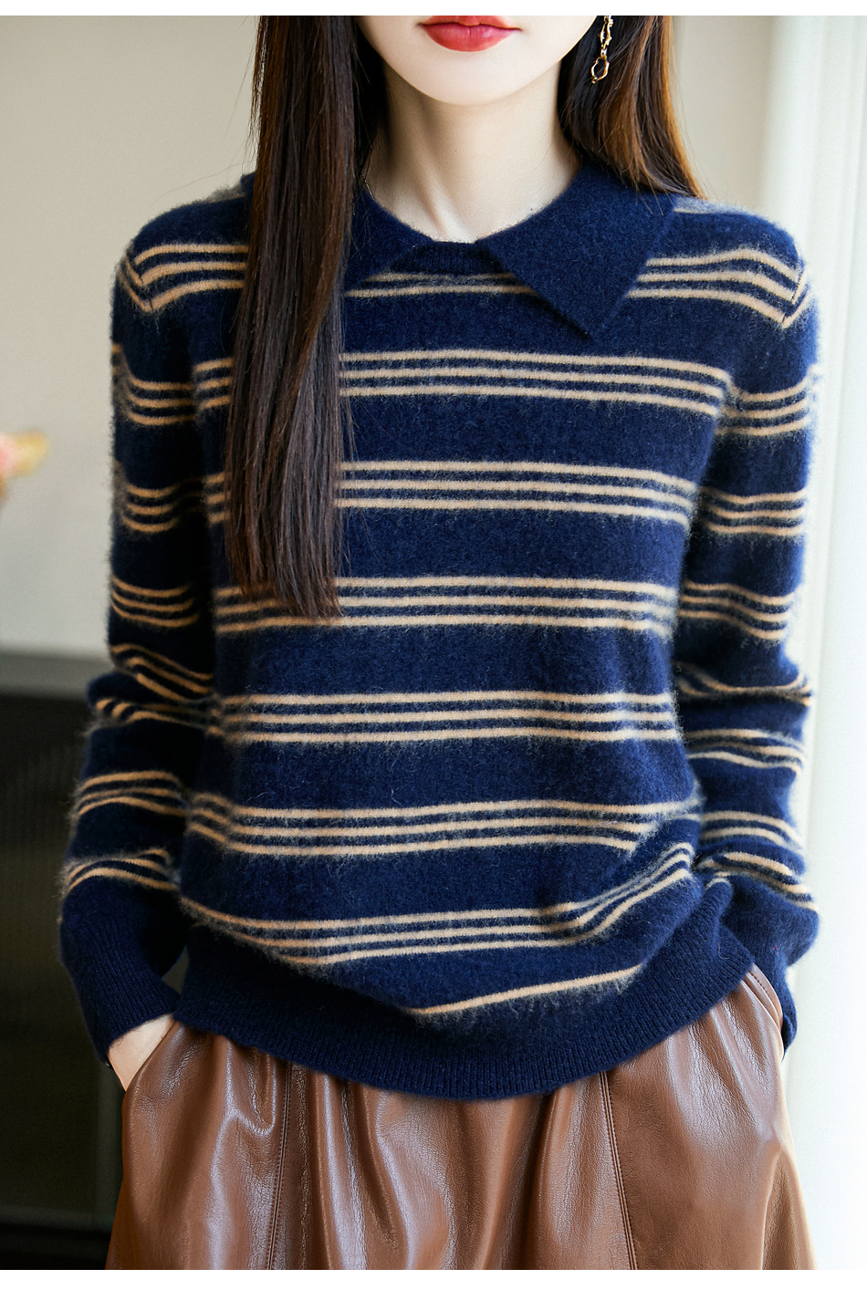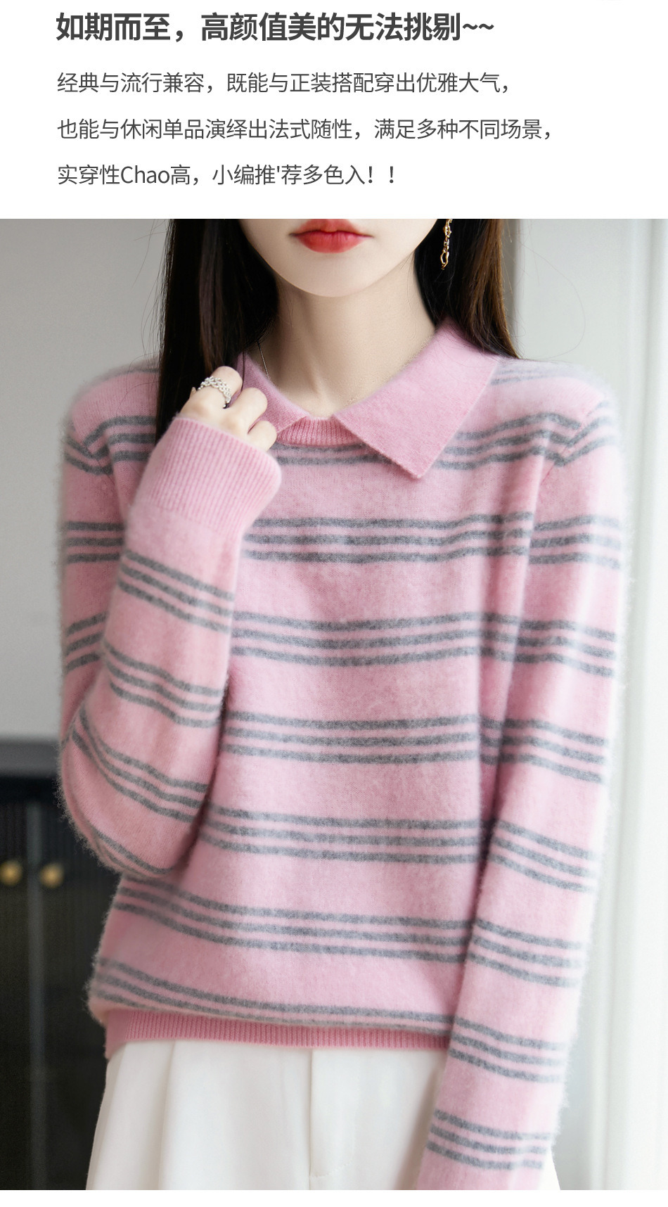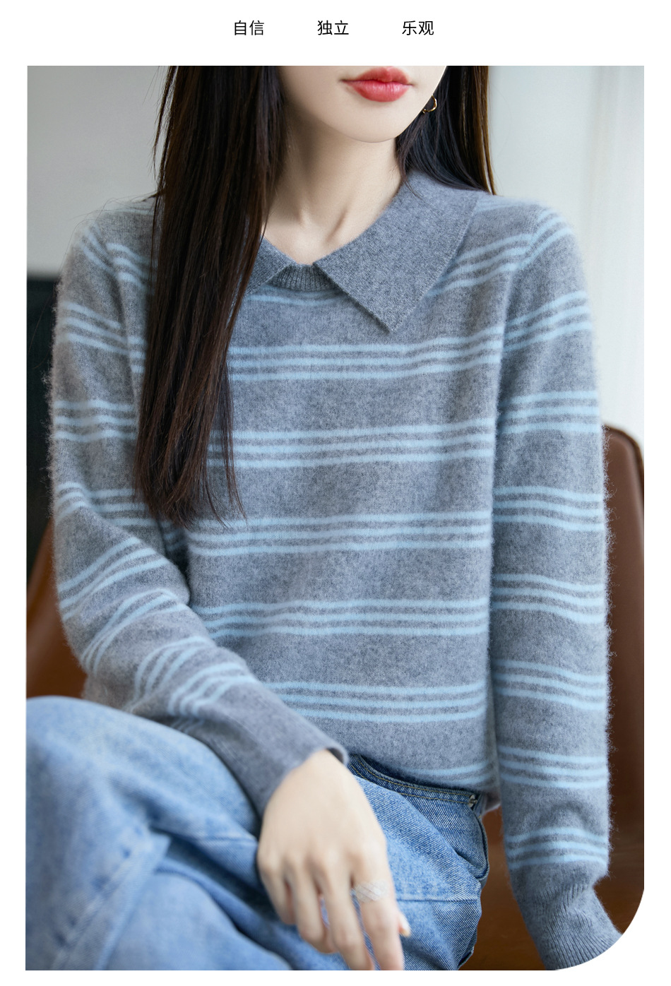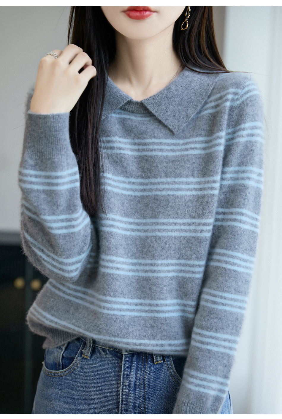 丁摩100%纯羊毛新款女式宽松Polo领条纹短款打底针织衫毛衣ALM2-277