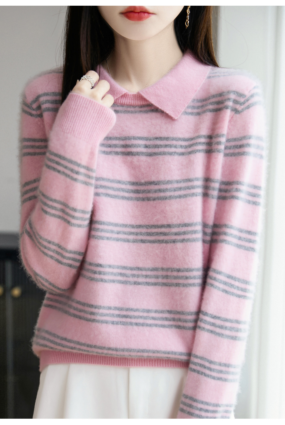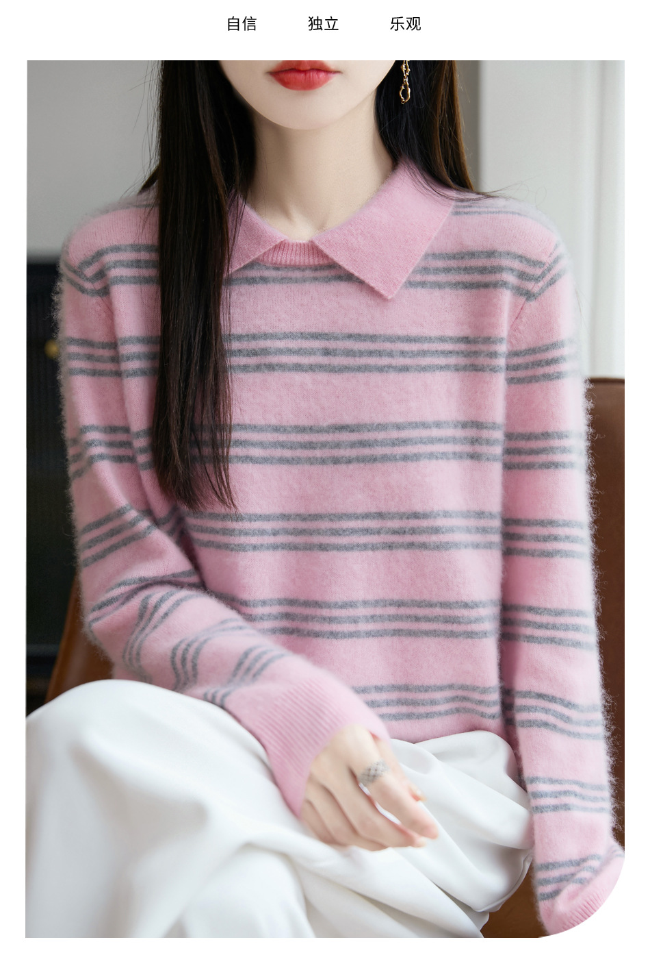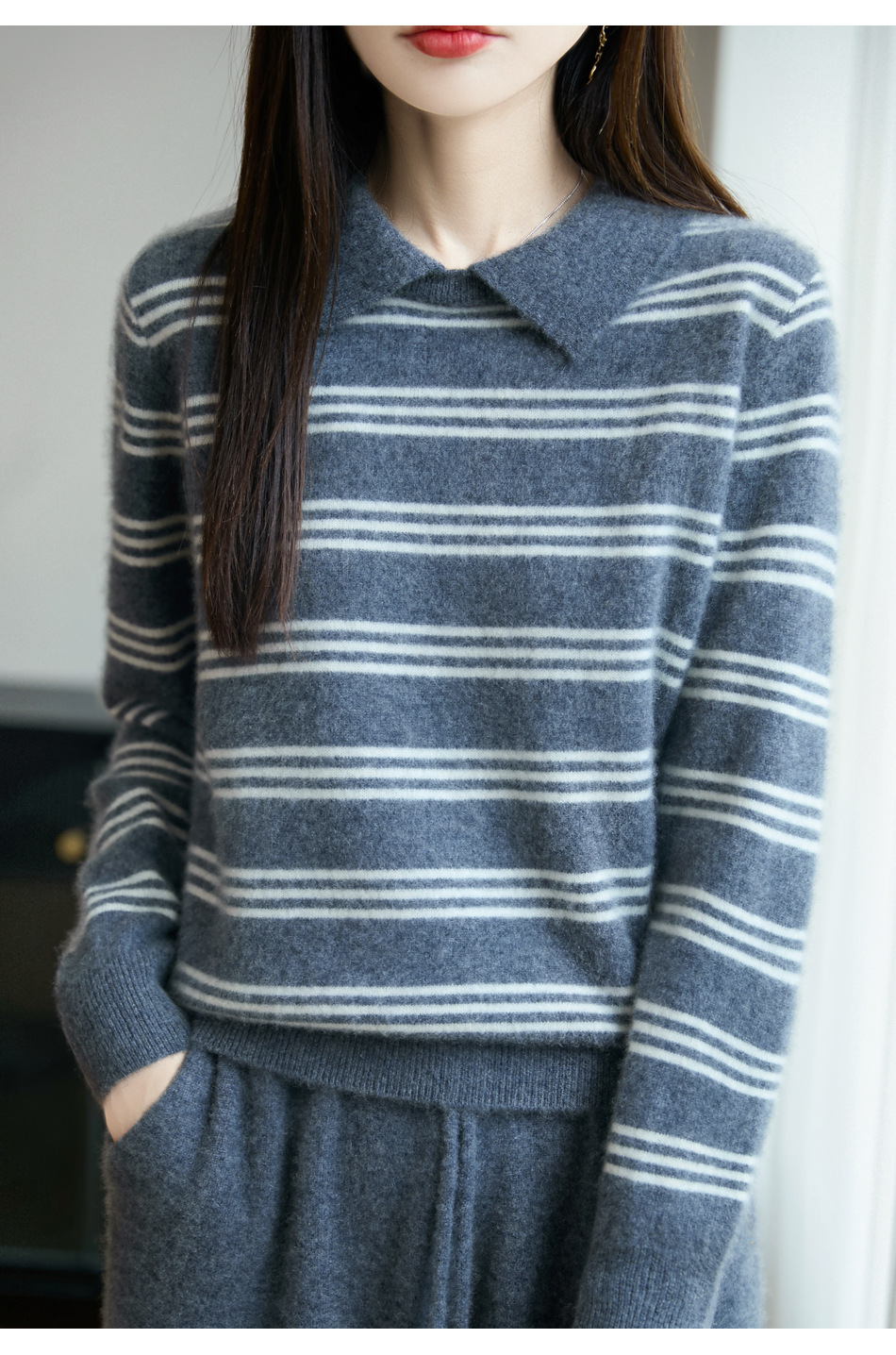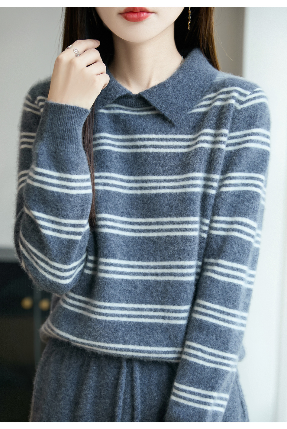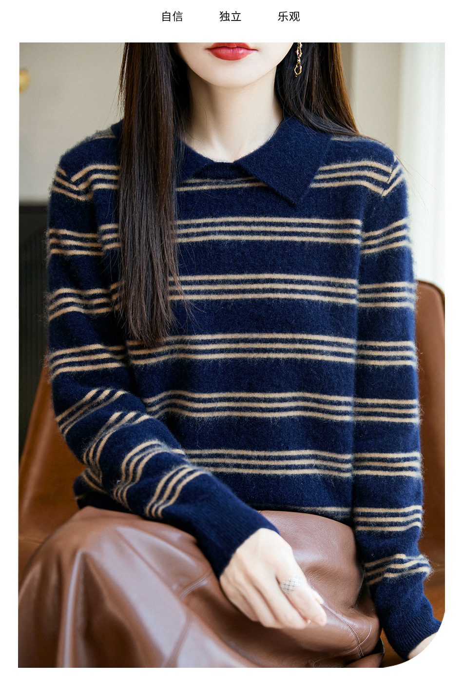 丁摩100%纯羊毛新款女式宽松Polo领条纹短款打底针织衫毛衣ALM2-277