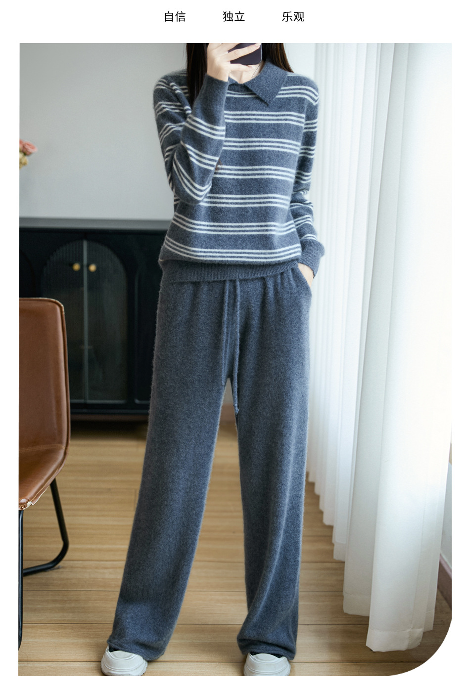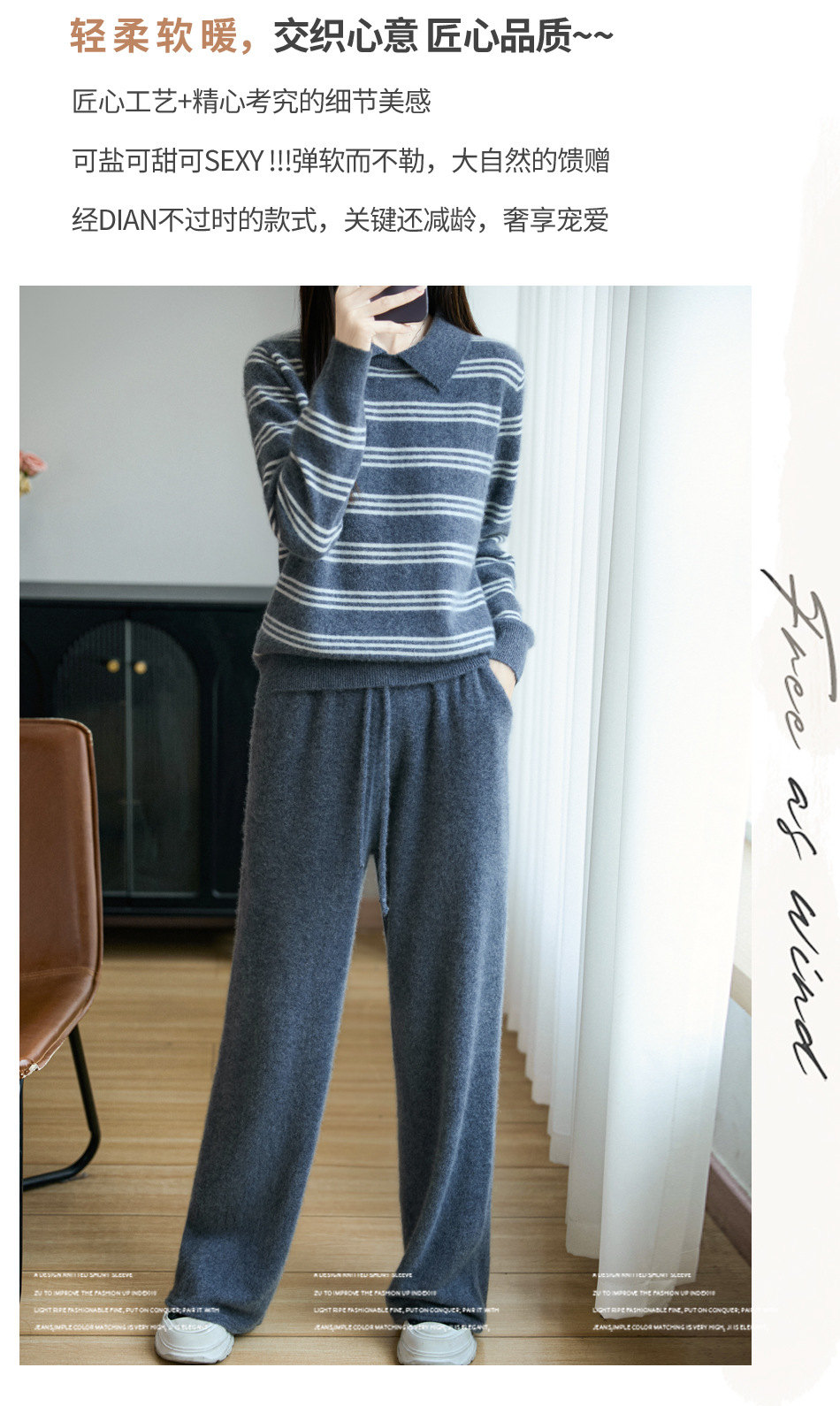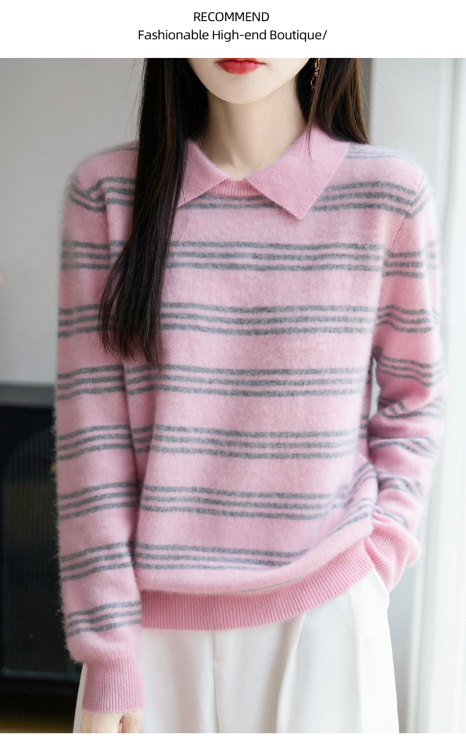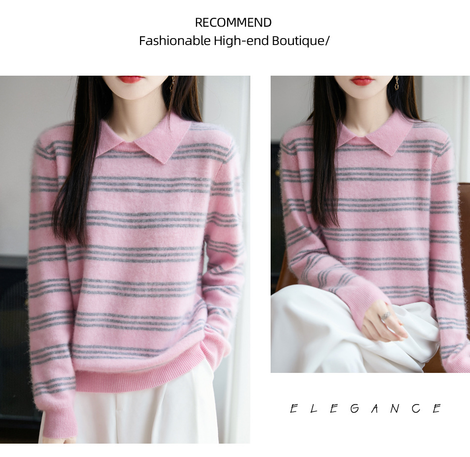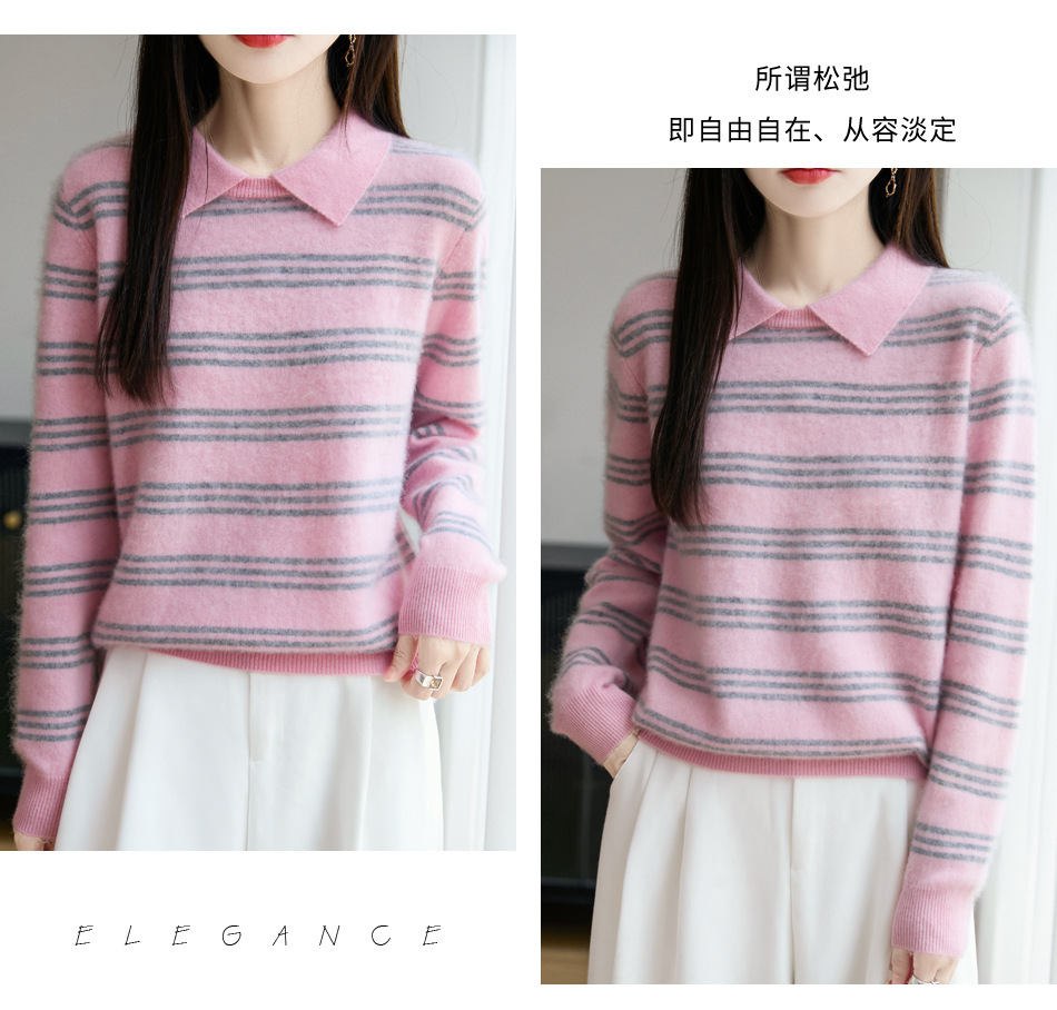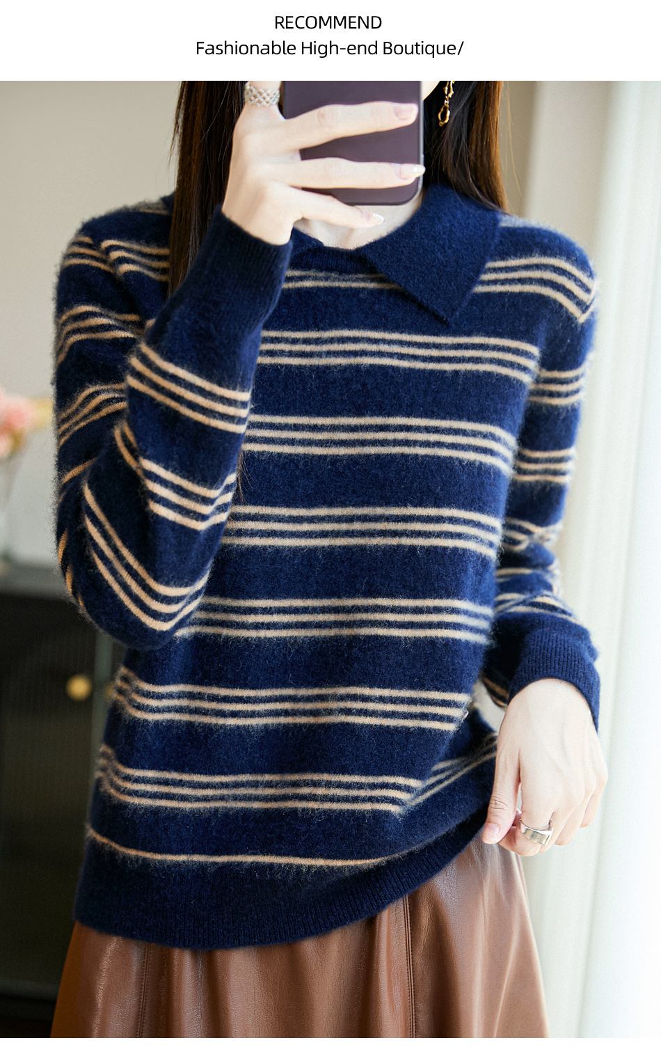 丁摩100%纯羊毛新款女式宽松Polo领条纹短款打底针织衫毛衣ALM2-277