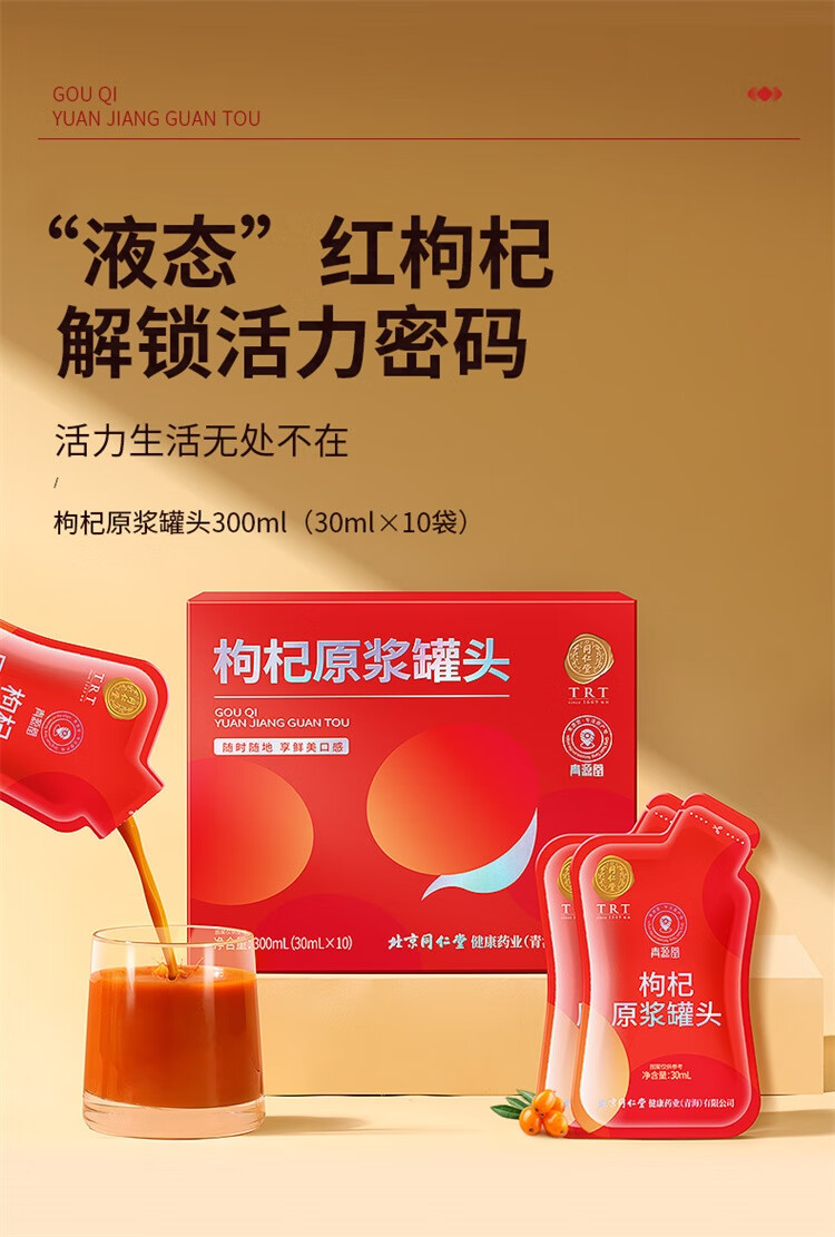 【正宗同仁堂品牌】北京同仁堂 青源堂 鲜红枸杞原浆汁300ml(30ml*10袋) 宁夏中宁头茬红枸杞子原汁原液鲜便携袋装礼品SY