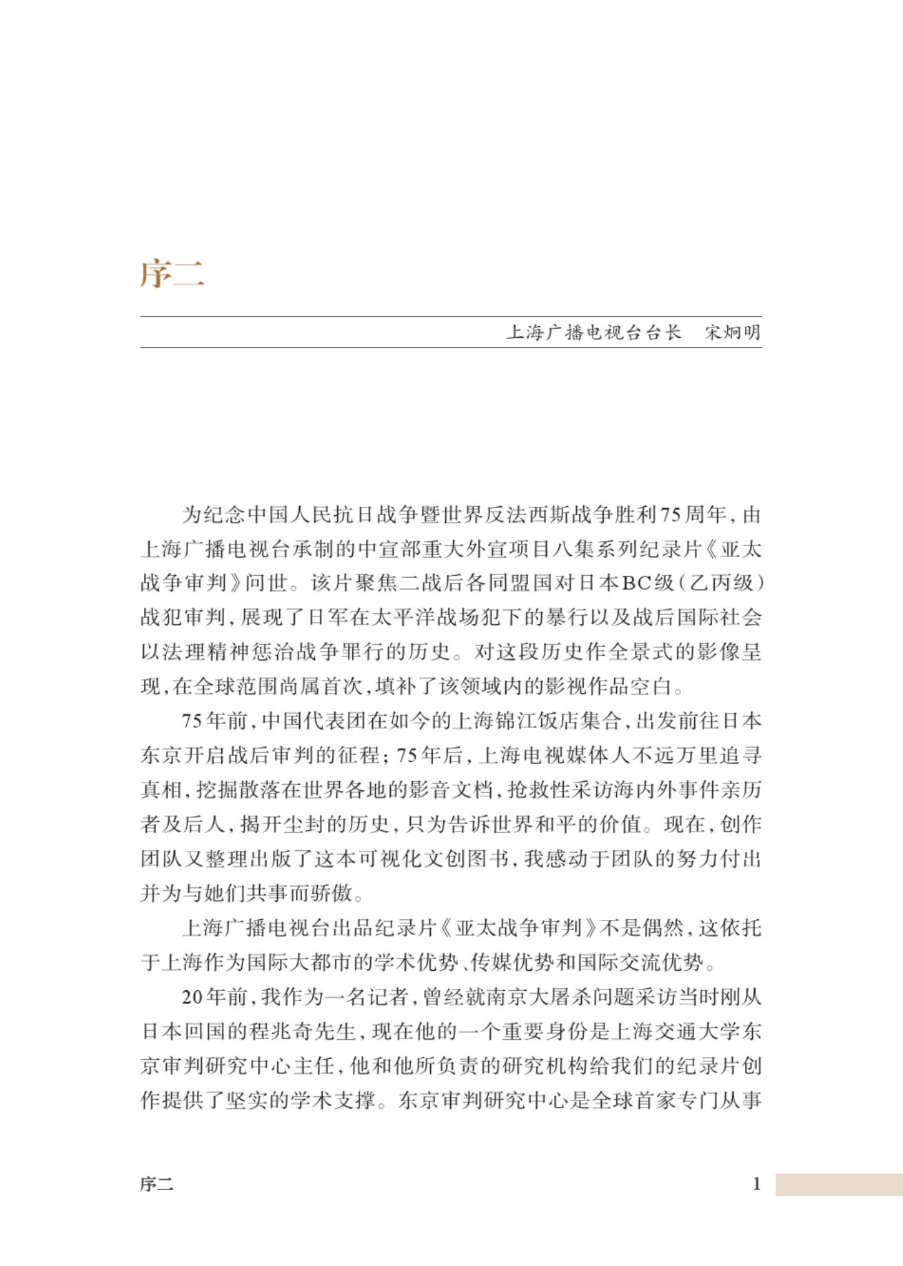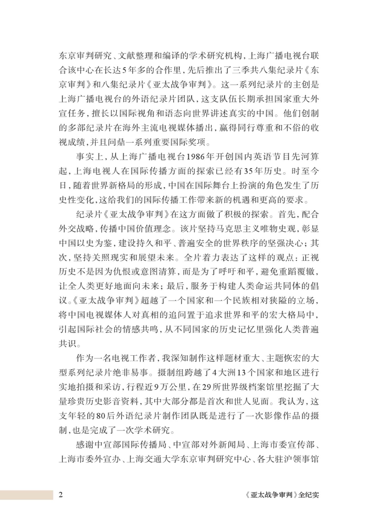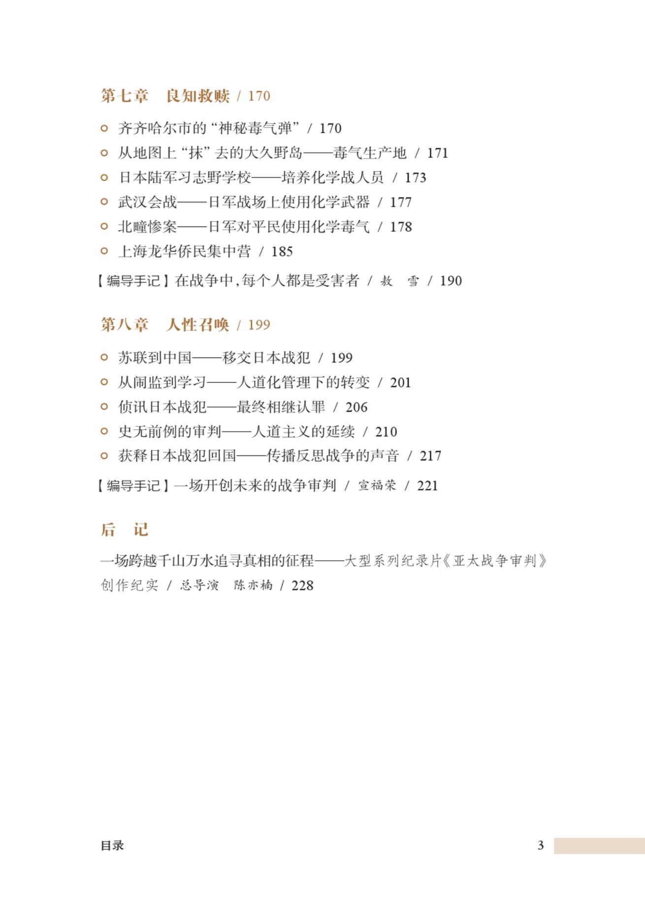 纪录片《亚太战争审判》以影像的形式全景式展示了二战后同盟国在亚太地区对日本军队战争暴行的审判。摄制组客服了地域辽阔、时隔久远,特别是研究成果不足等种种困难,从繁华的都市到荒僻的远乡,从大陆腹地到太平洋的孤岛,遍访硕果仅存的历史事件的当事人以及知情人和相关学者,以平和、理性,同时富有情感的态度和眼光,难能可贵地重塑了那一段不应被遗忘的历史。本书概览式地讲述了亚太战争审判的全貌,以及拍摄纪录片的艰辛历程。