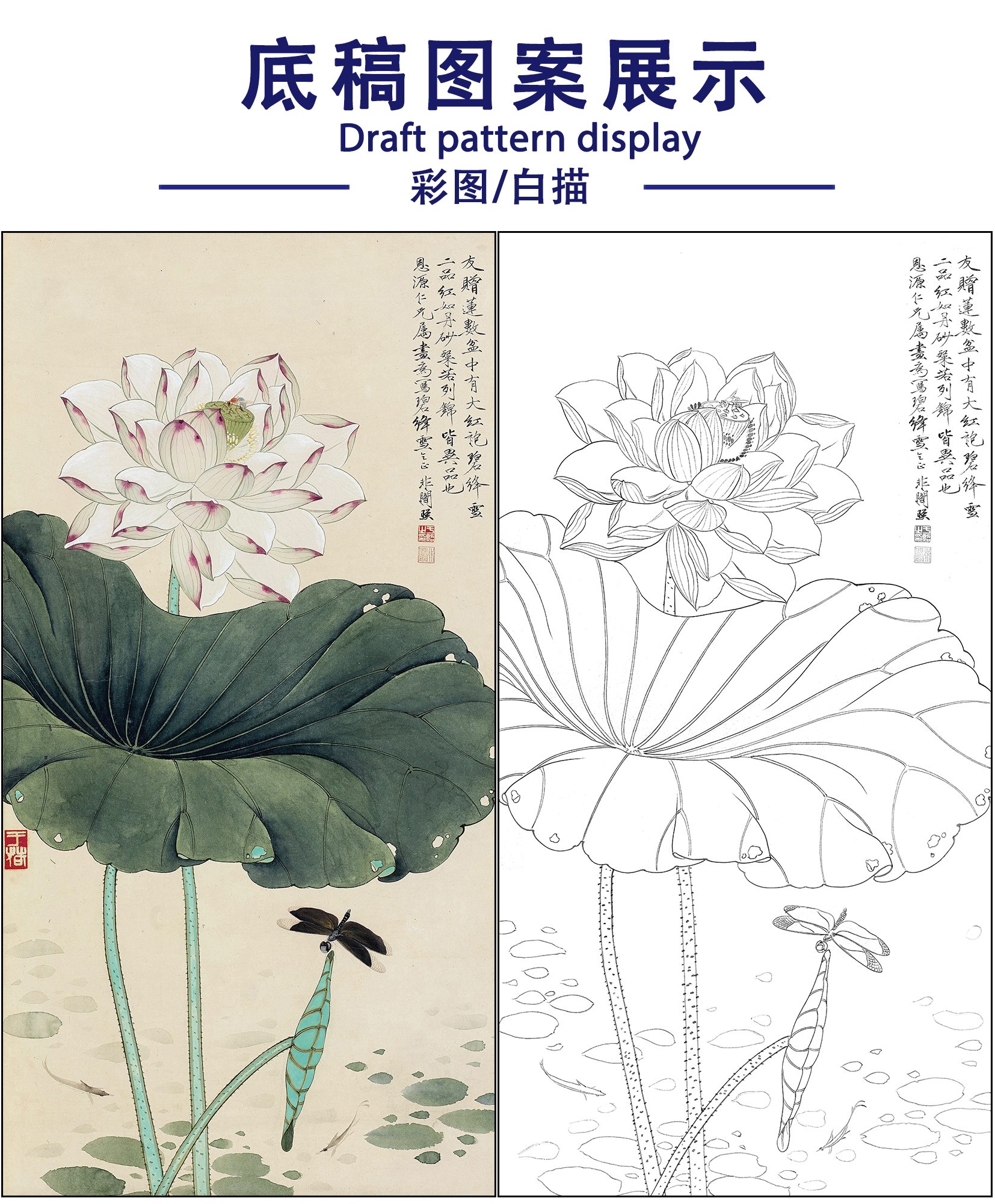 工笔画白描底稿于非闇花鸟荷花《碧绛雪》临摹勾线高清打印稿FA42