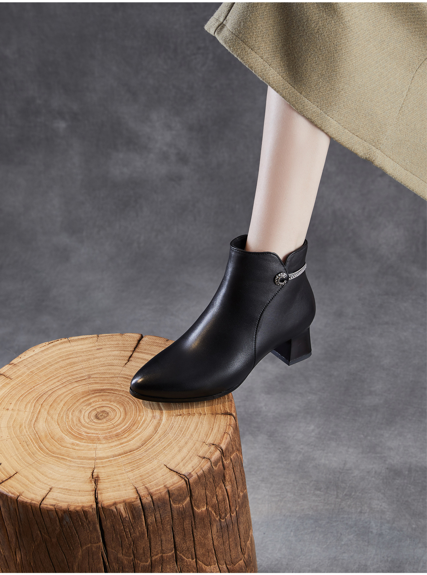 ZM 258687靴子时装靴加绒真皮尖头短靴粗高跟水钻皮靴 商品图3