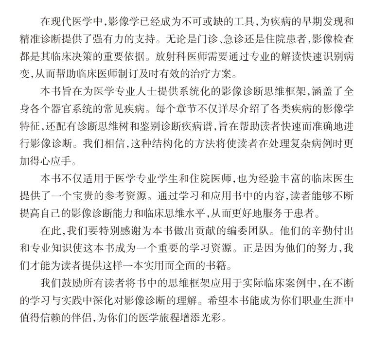 全书以影像征象为核心切入点,深入剖析并提炼各征象的特异性影像学表现,辅以典型病例图像直观佐证;借助思维导图清晰可视化征象分析与诊断推导的完整脉络,同步融入鉴别诊断的关键要点及适配疾病谱系。通过层层拆解、去芜存菁的解析方式,完整呈现从影像征象识别到疾病确诊的全链条思维推演过程,为影像科医师提供极具参考价值的诊断思维范式。