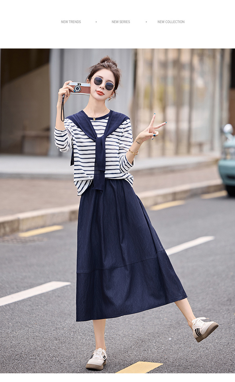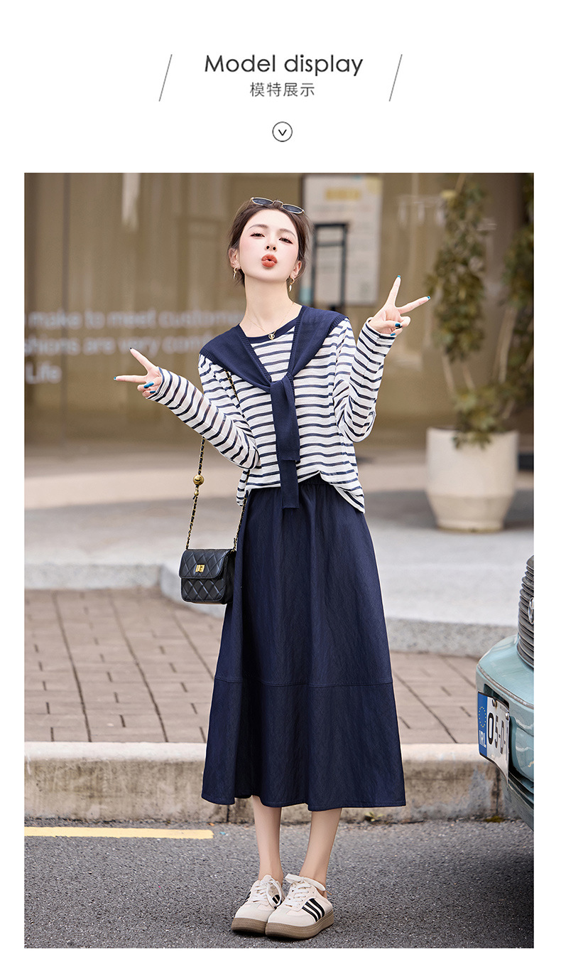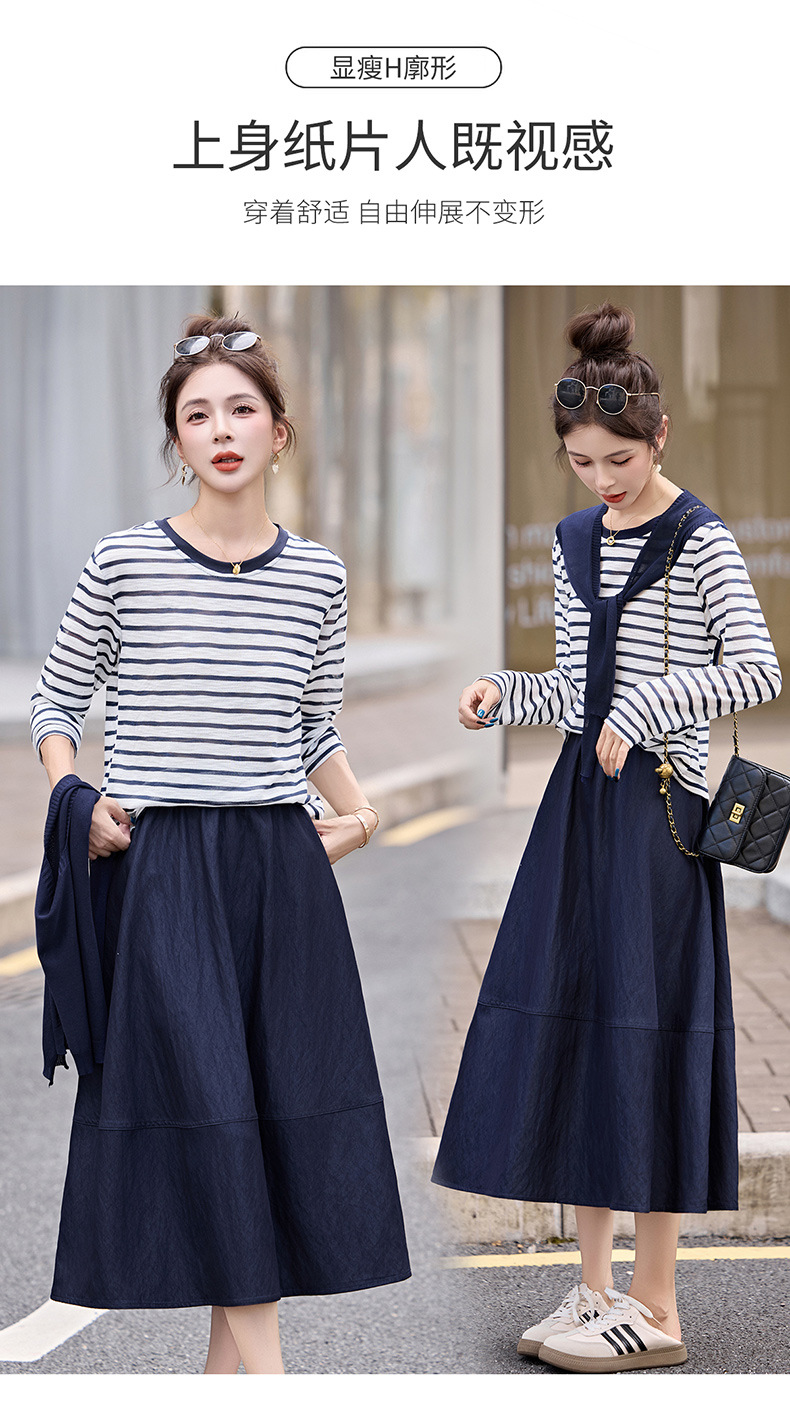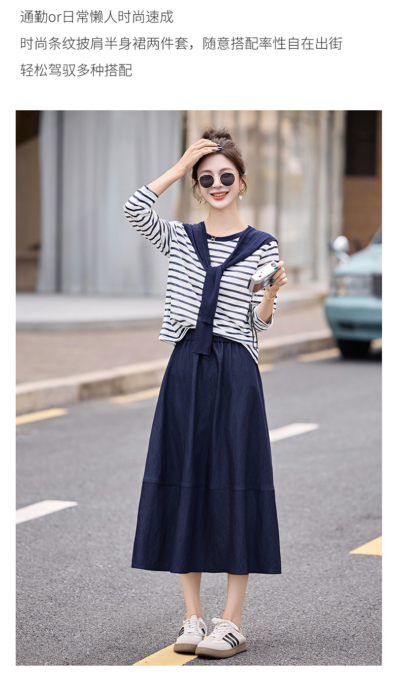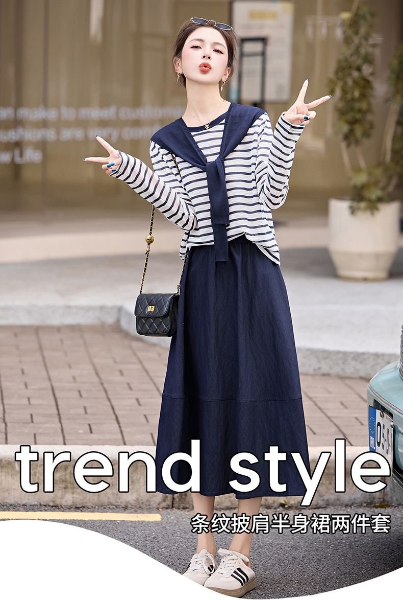 时尚条纹T恤上衣半身裙套装,韩系显瘦宽松减龄两件套HR-LNS9766