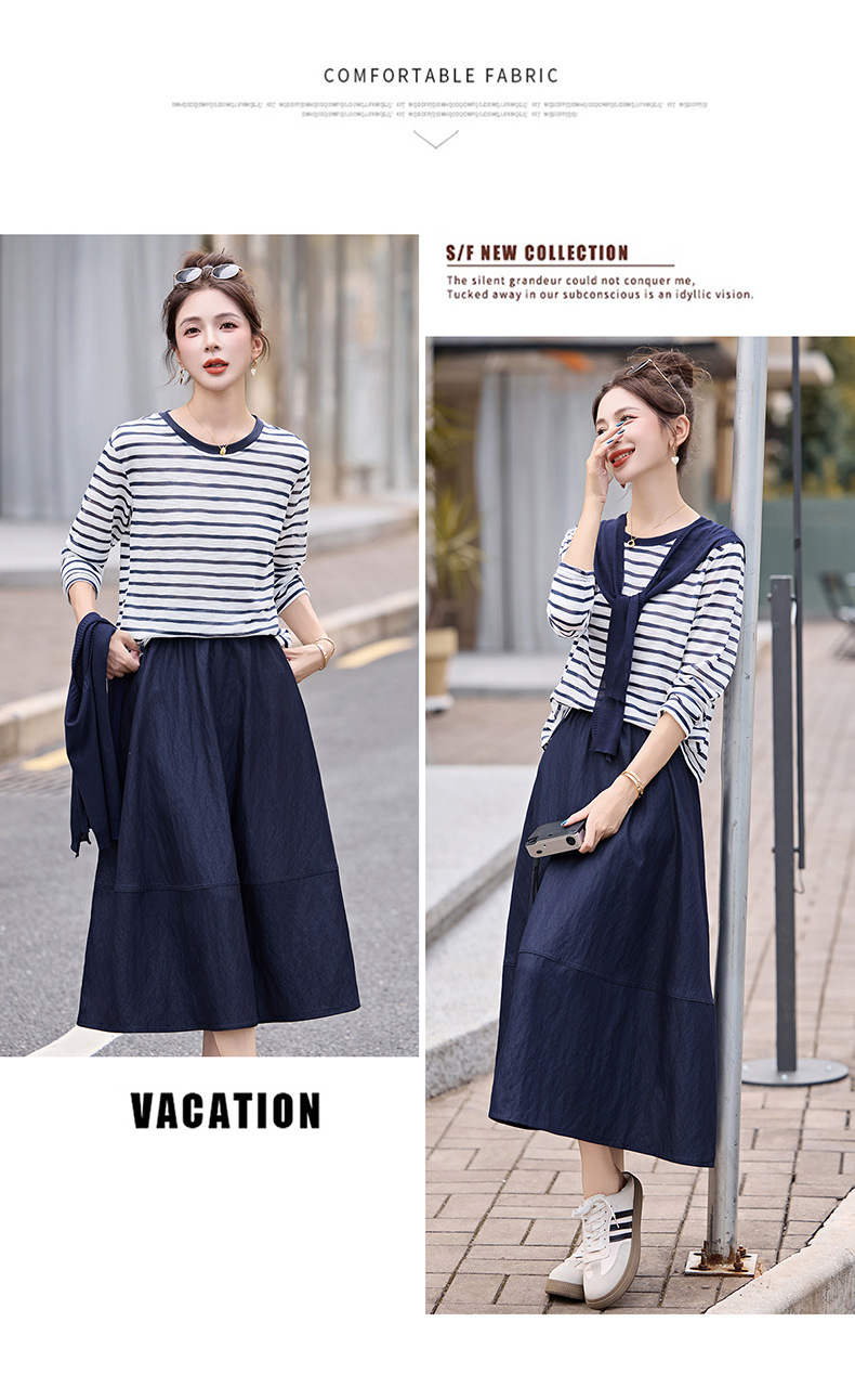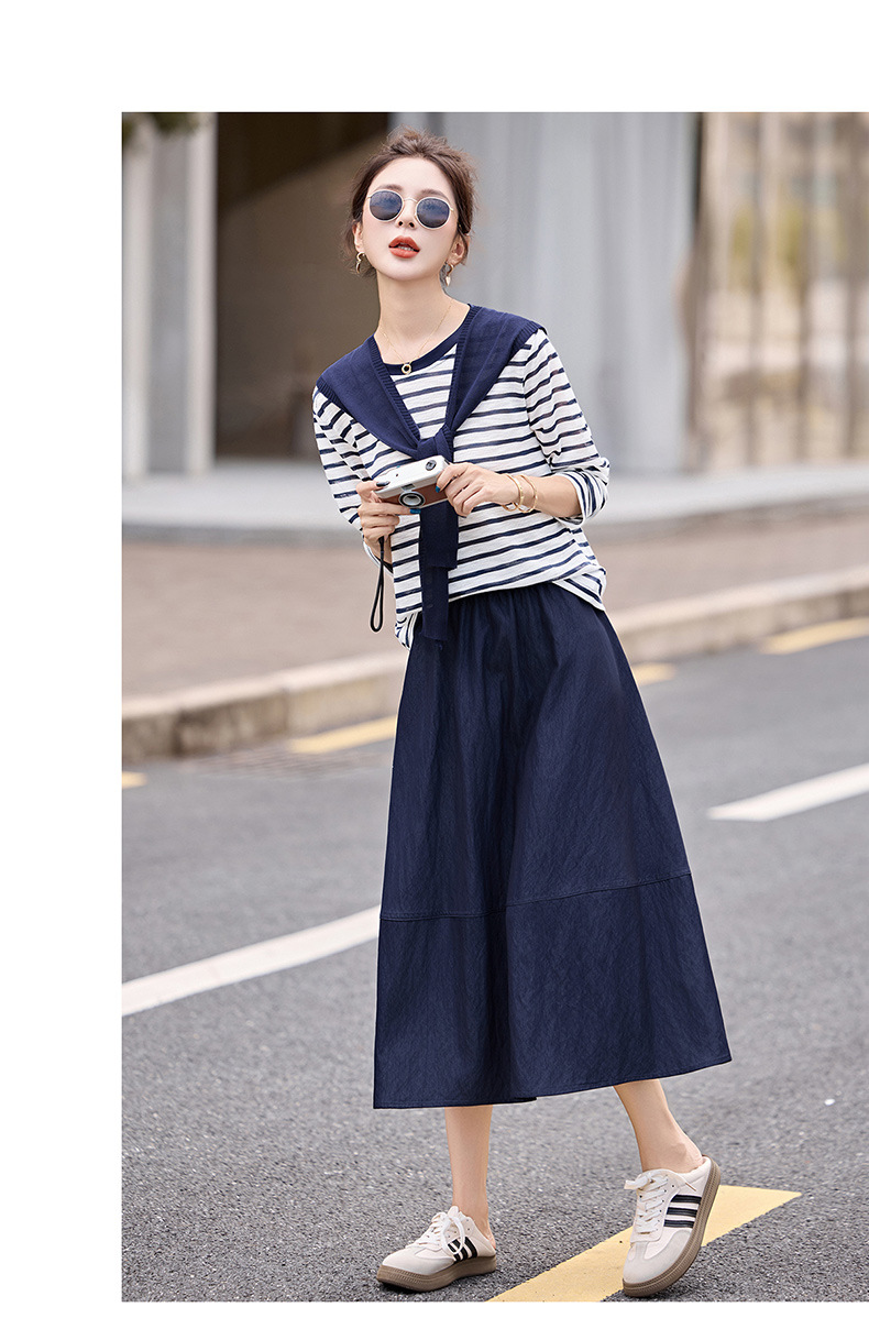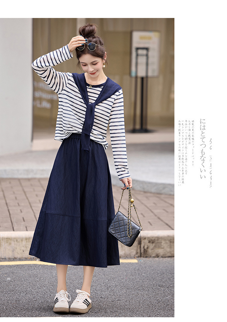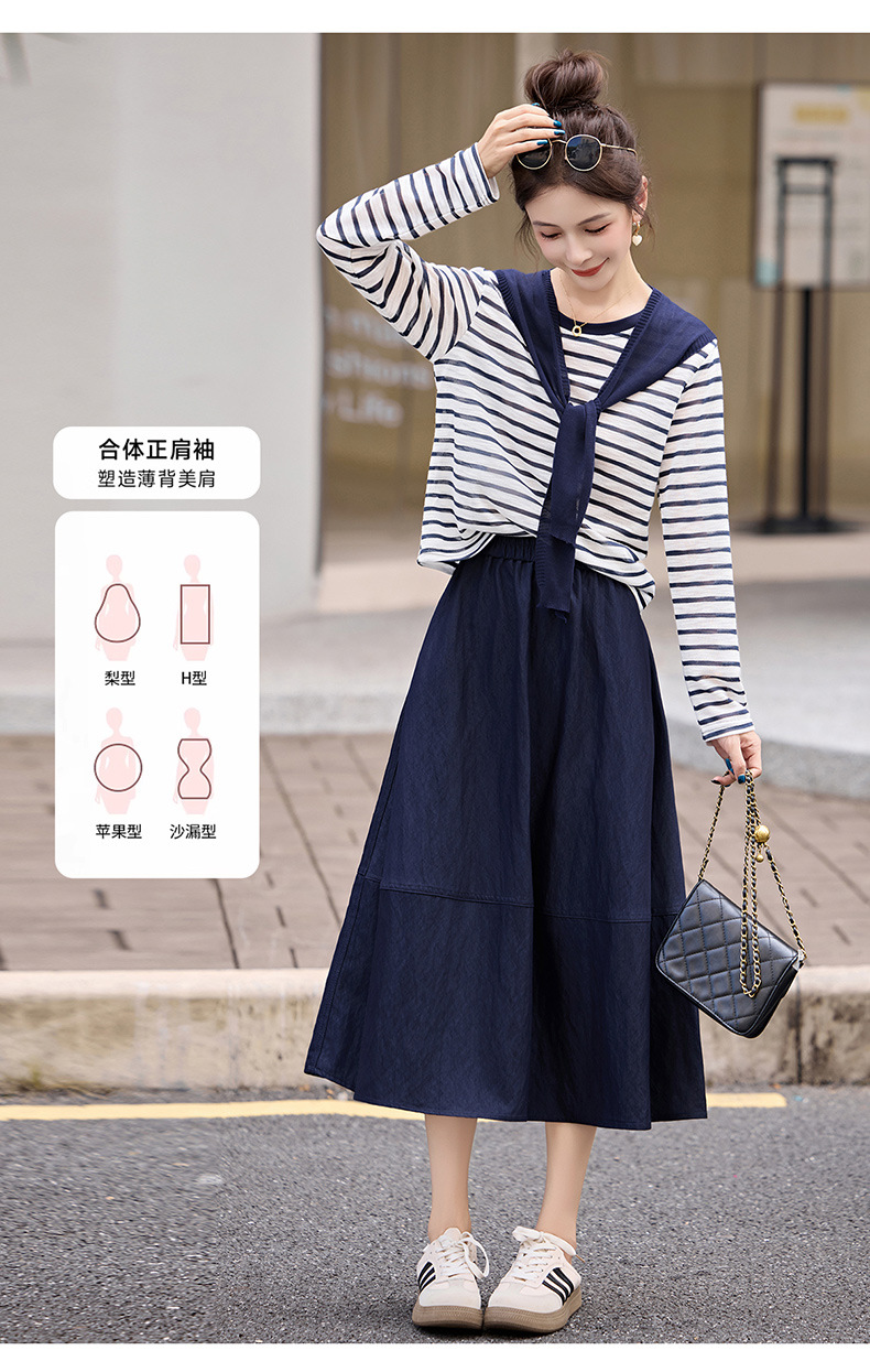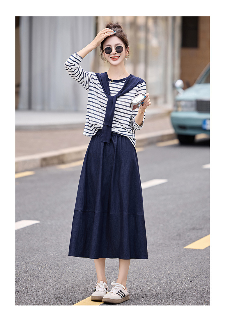 时尚条纹T恤上衣半身裙套装,韩系显瘦宽松减龄两件套HR-LNS9766