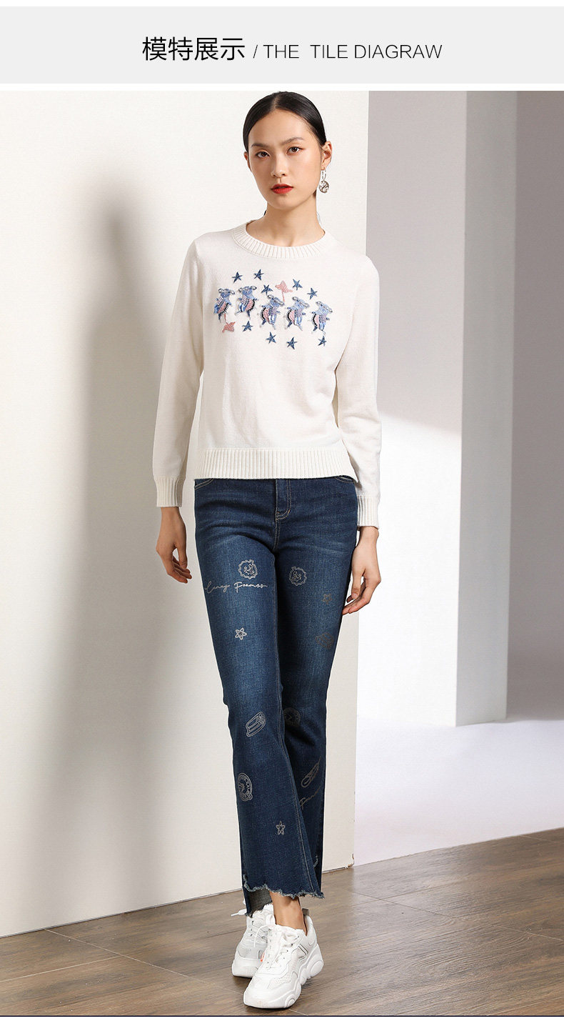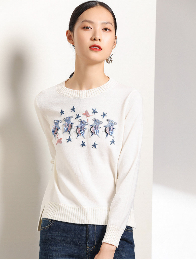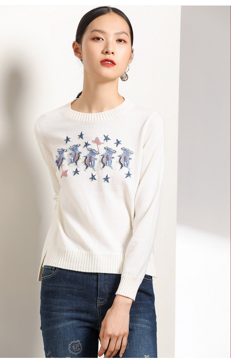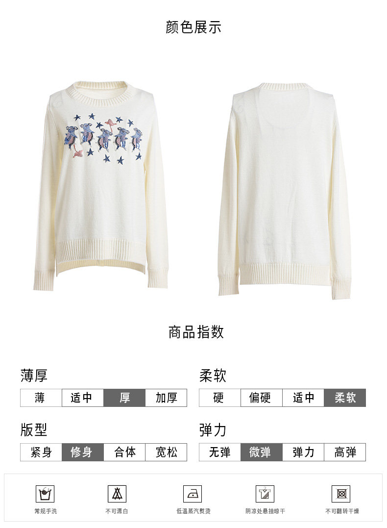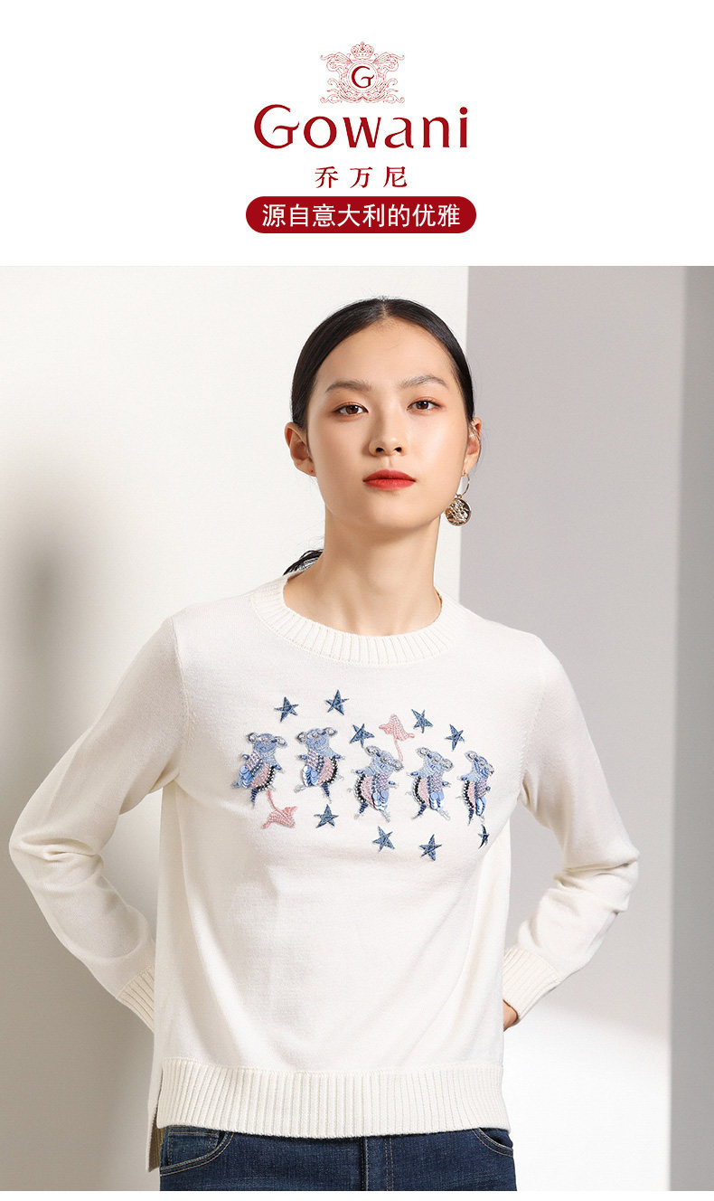 乔万尼秋装羊毛针织衫白色宽松贴布绣花外穿长袖上衣EN3M389