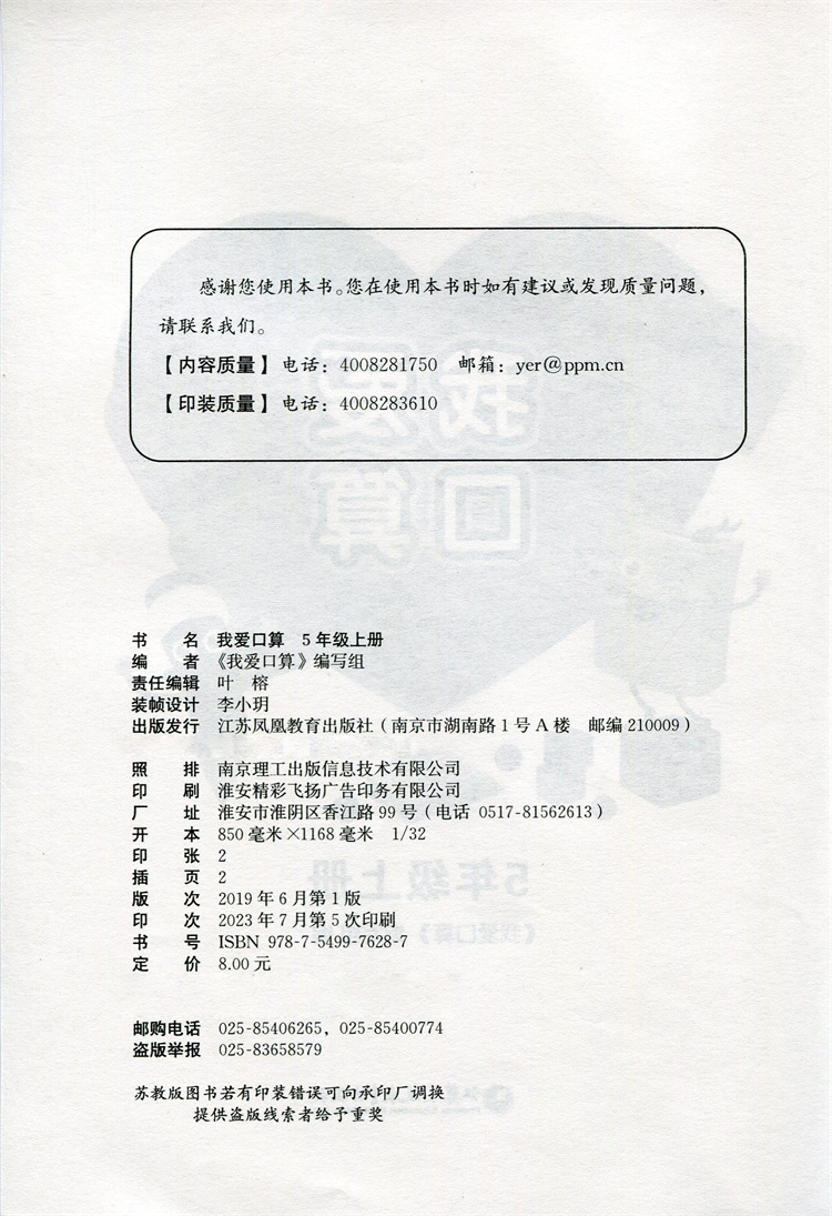 我爱口算 五年级上册5上 无答案 小学生计算口算能手训练练习册