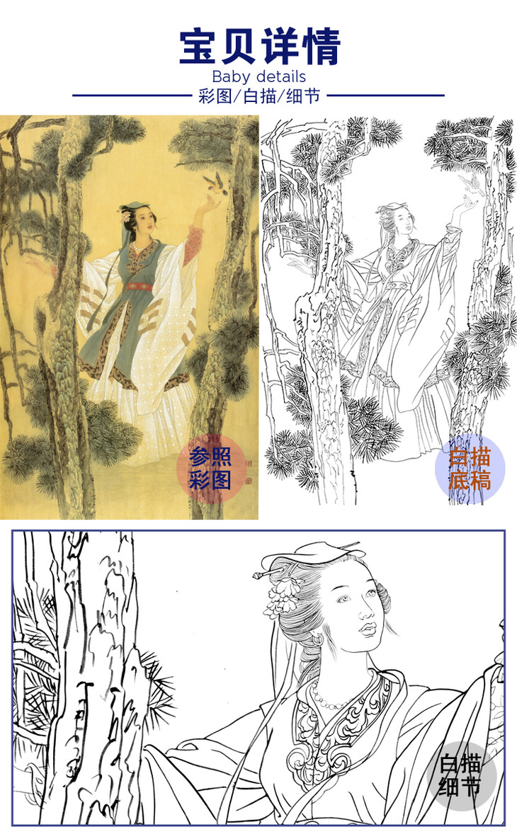 王美芳竖幅工笔传统仕女人物白描底稿《鱼玄机》-多种白描尺寸可选-B014