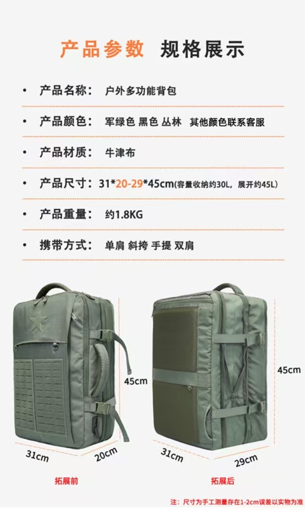 温馨提示:背包不赠送魔术贴,背包重约1.8公斤,发新疆西藏甘肃宁夏内蒙等偏远地区运费高。
