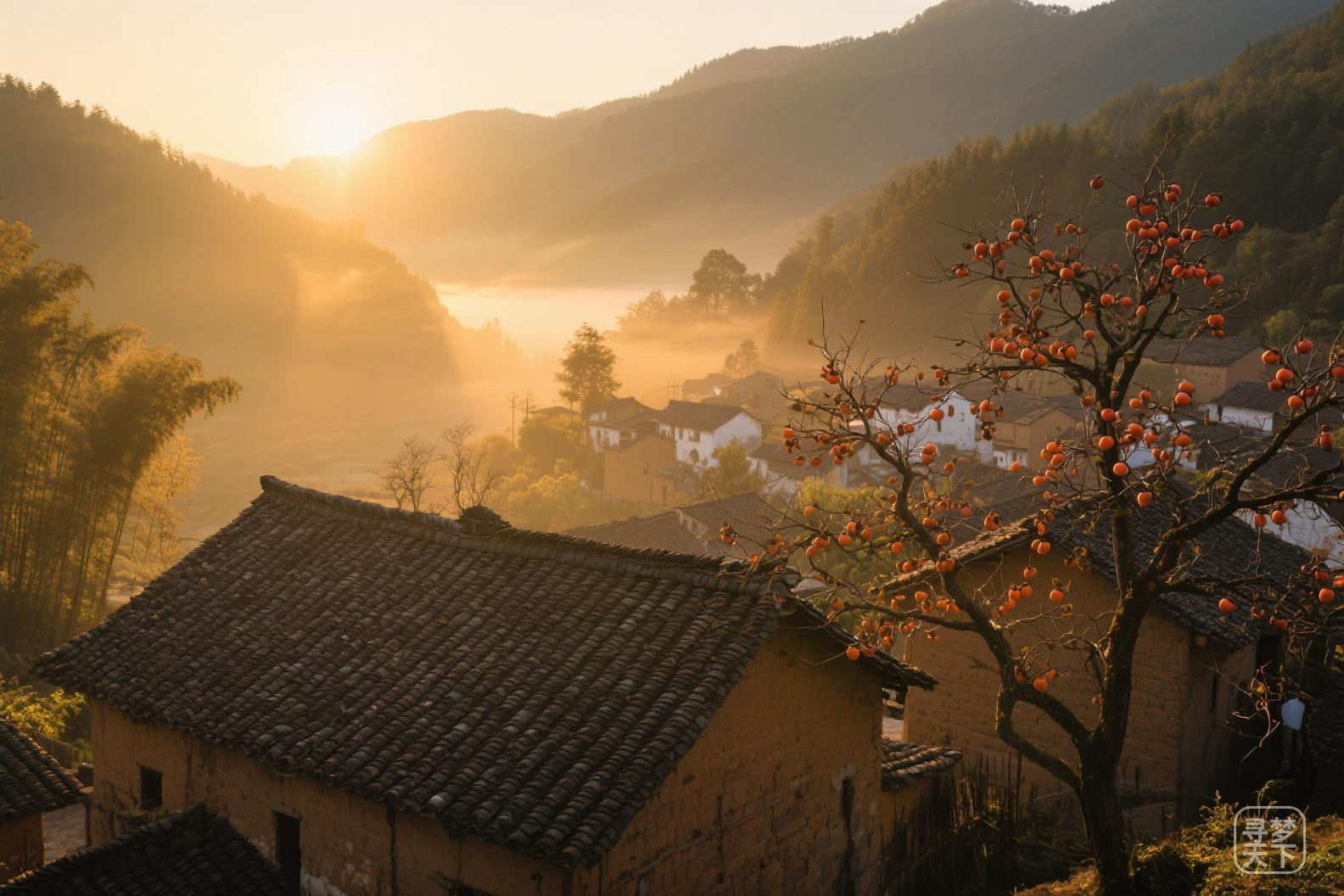四坪村:晨景拍摄核心地,晨光洒柿树与屋顶,光影层次丰富;